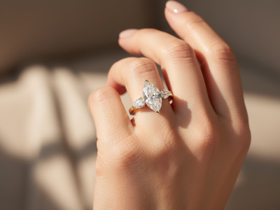Sublime ring set with 1 marquise cut diamond of 3.17 CT, color: E and clarity: Internally Flawless with GIA Certificate. Surrounded by 2 pear-shaped diamonds: approximately 0.70CT.
