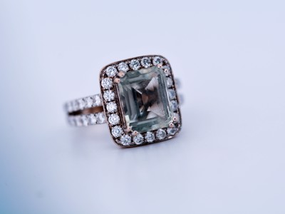 Large single ring with a light green opal of approximately 6.00CT, surrounded by 10 emeralds: approximately 2.00CT + 10 citrines: approximately 1.00CT + 50 small white diamonds: approximately 0.50CT