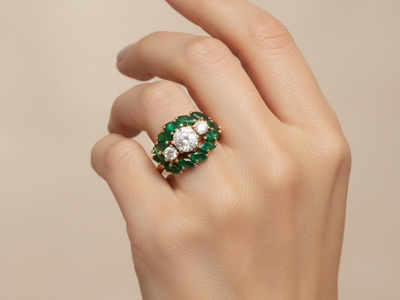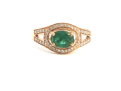 Fine ring with 1 vived green emerald of approximately 1.00 ct, surrounded by 12 small brilliant-cut diamonds 0.24 ct.