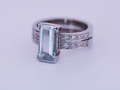 Ring in white gold 18ct. with 1 aquamarine of +- 2.00cts. surrounded by 16 brilliants 0.32ct.