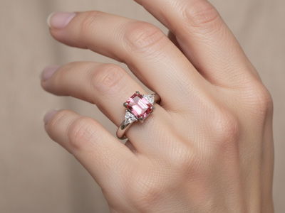 Exclusive ring set with 1 pink diamond emerald cut of 2.17cts. surrounded by 2 diamond triangle cut +- 0.80ct.