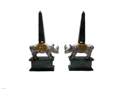 A couple of rhinoceroses with obelisks in white and green veined marble.