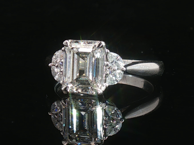 Quality ring set with 1 white emerald-cut diamond, surrounded by 4 marquise-cut diamonds + 2 brilliant cuts