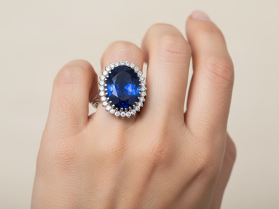 Ring in white gold 18ct. with 1 treated sapphire of 12cts. and surrounded by 28 brilliants