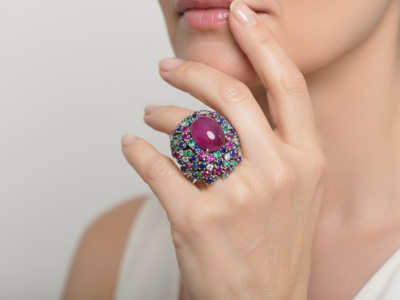 Large unique colorfull ring with ruby natural cabochon shape + emeralds + rubies + sapphires + brilliants
