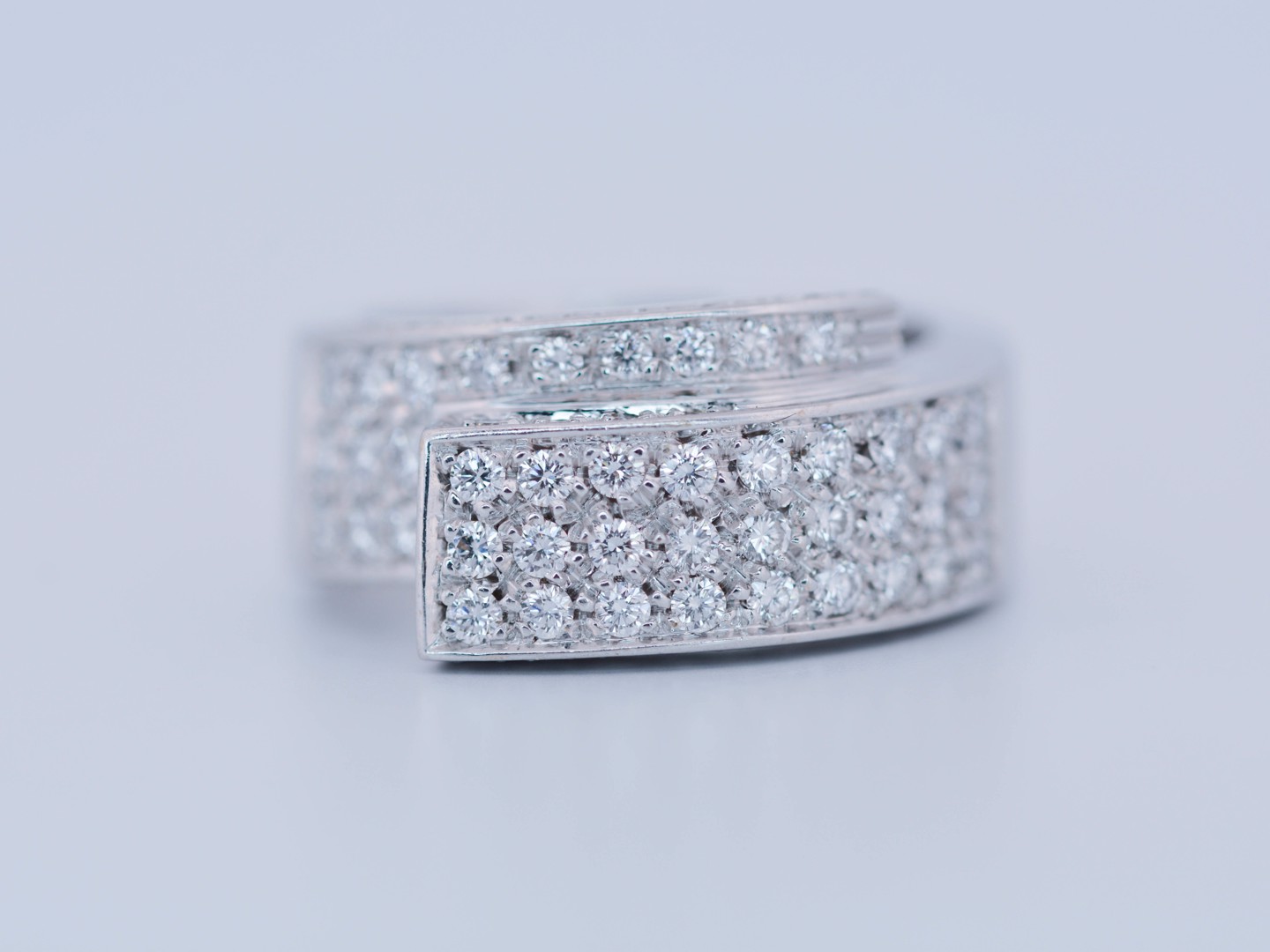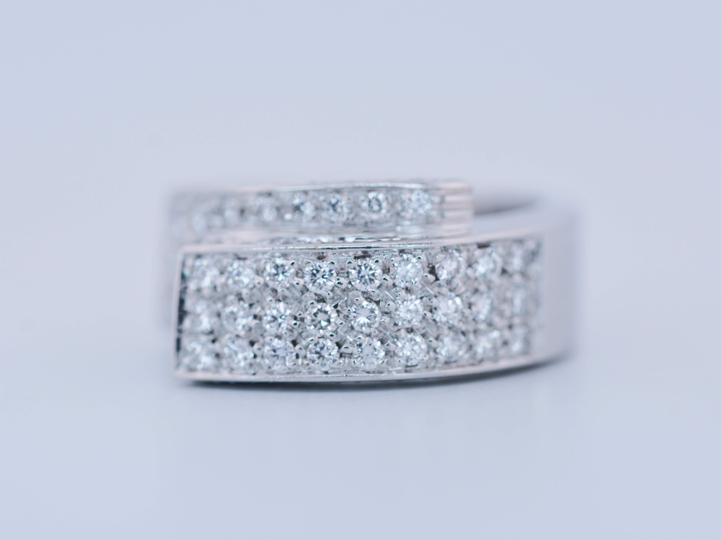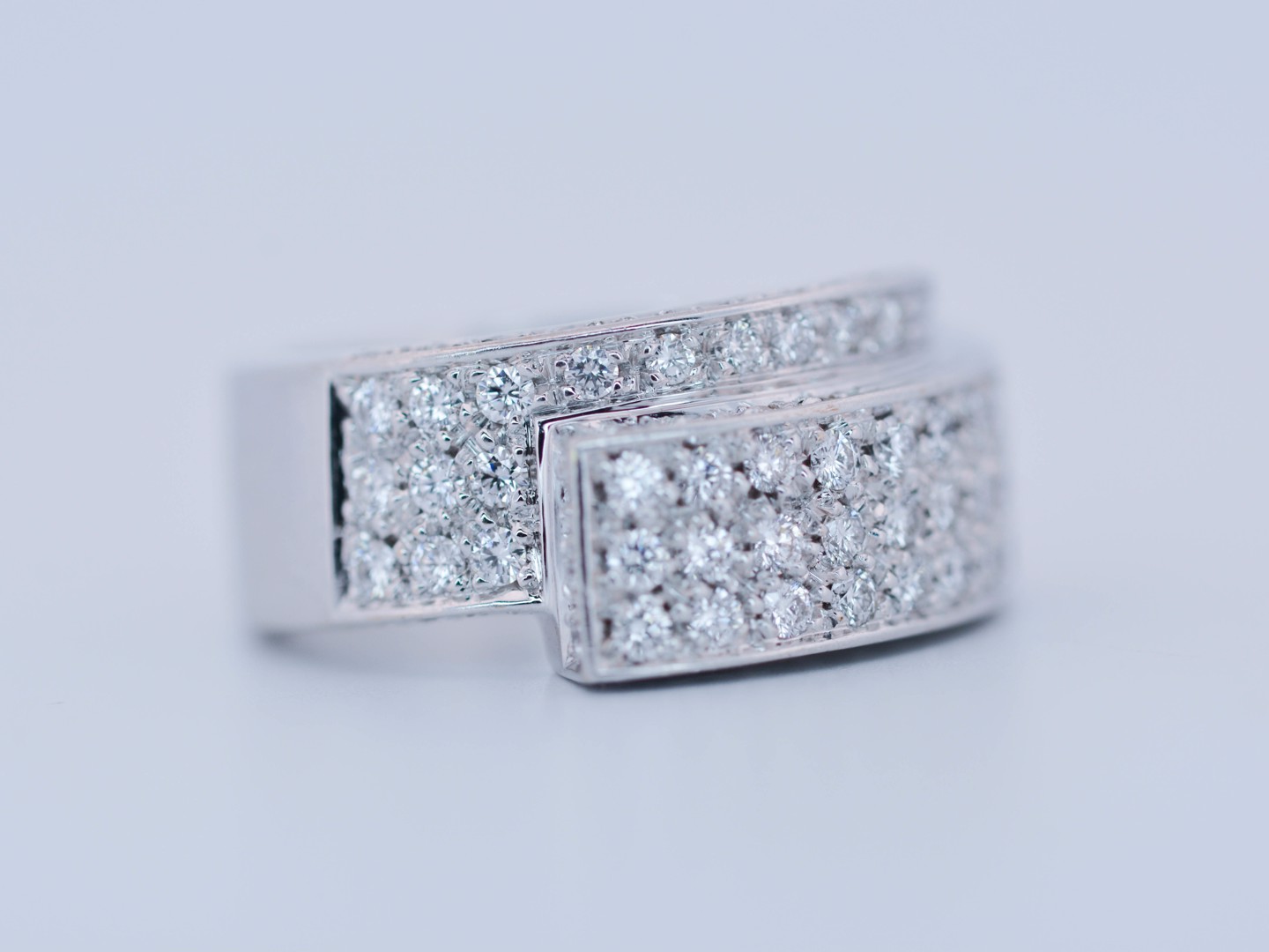 Élégante bague massive en or blanc 18 carats (poinçon 750), sertie de 72 diamants taille brillant totalisant environ 1,40 carat. Les diamants, de couleur F–G et de pureté VS, diffusent une lumière éclatante qui allie force et raffinement.