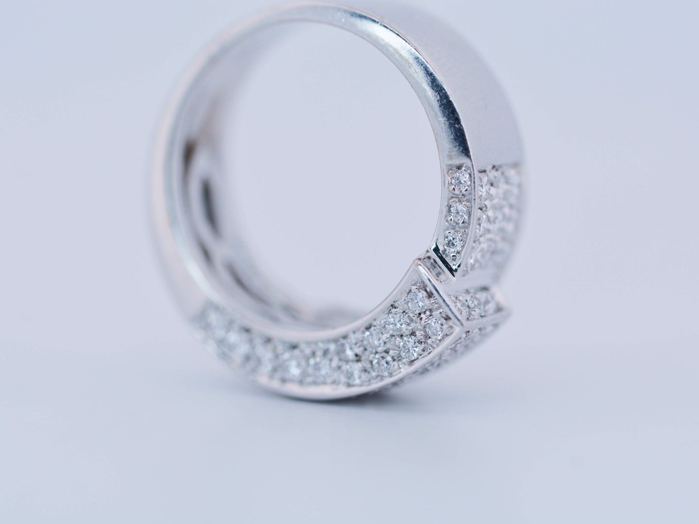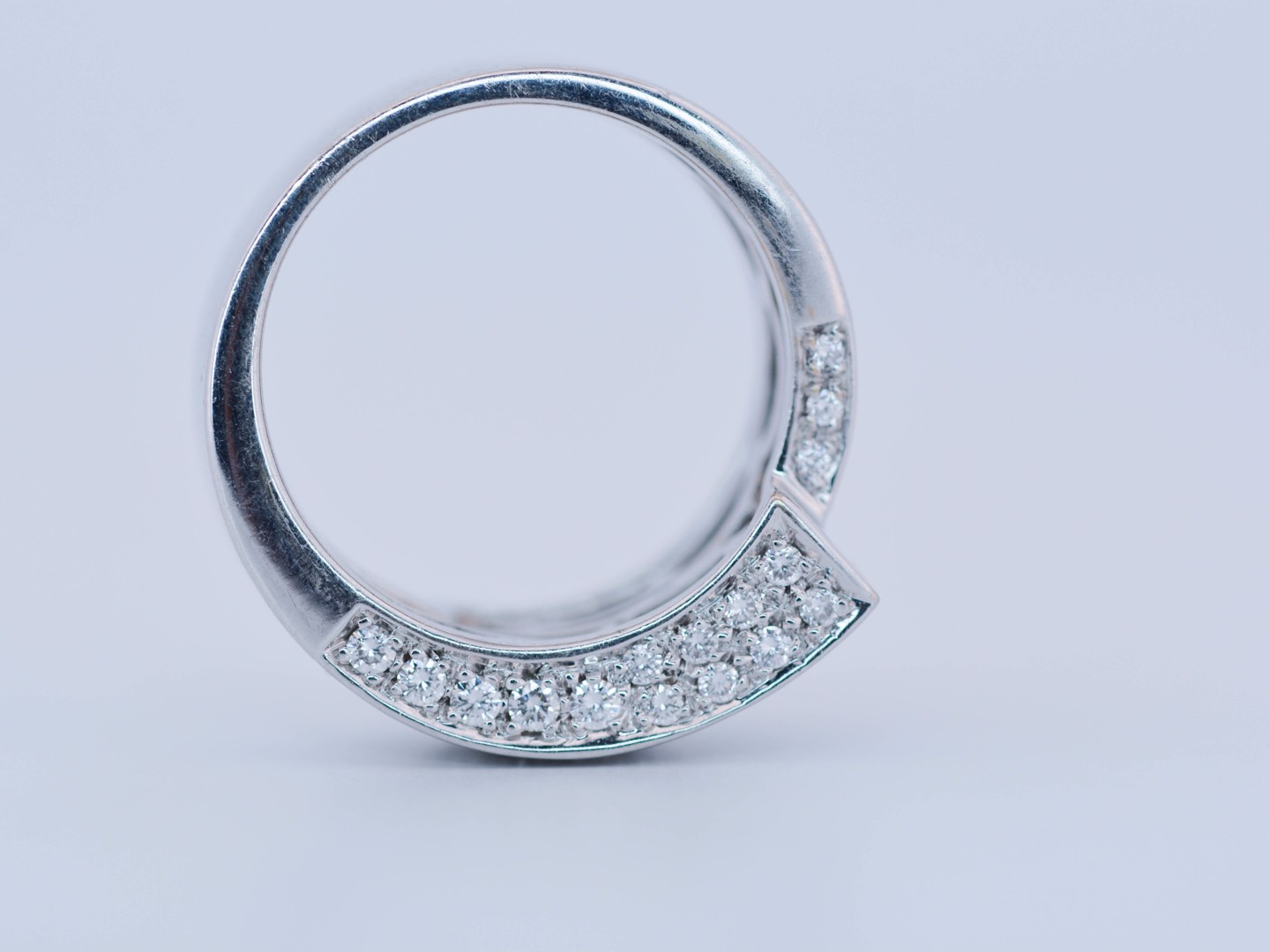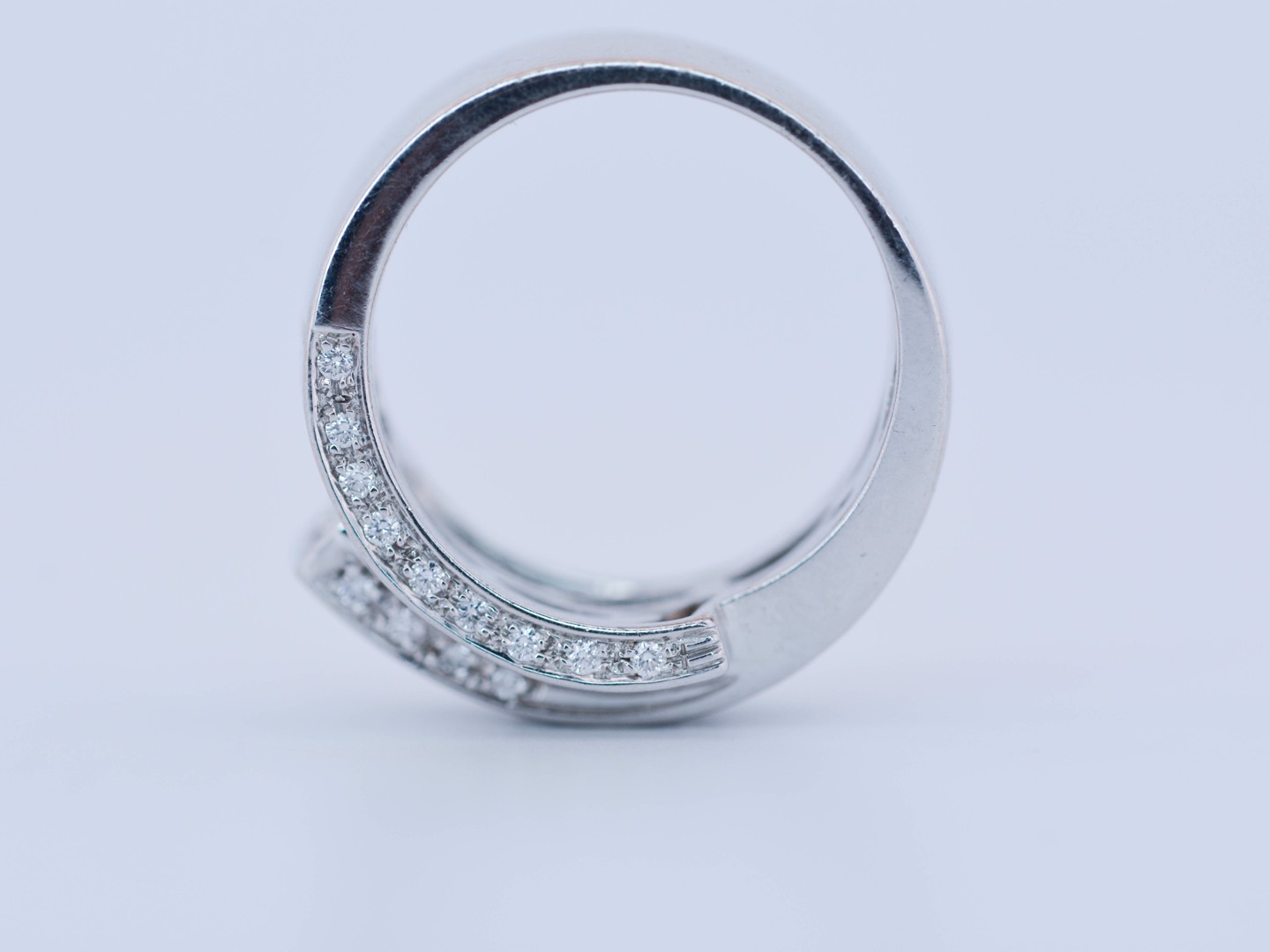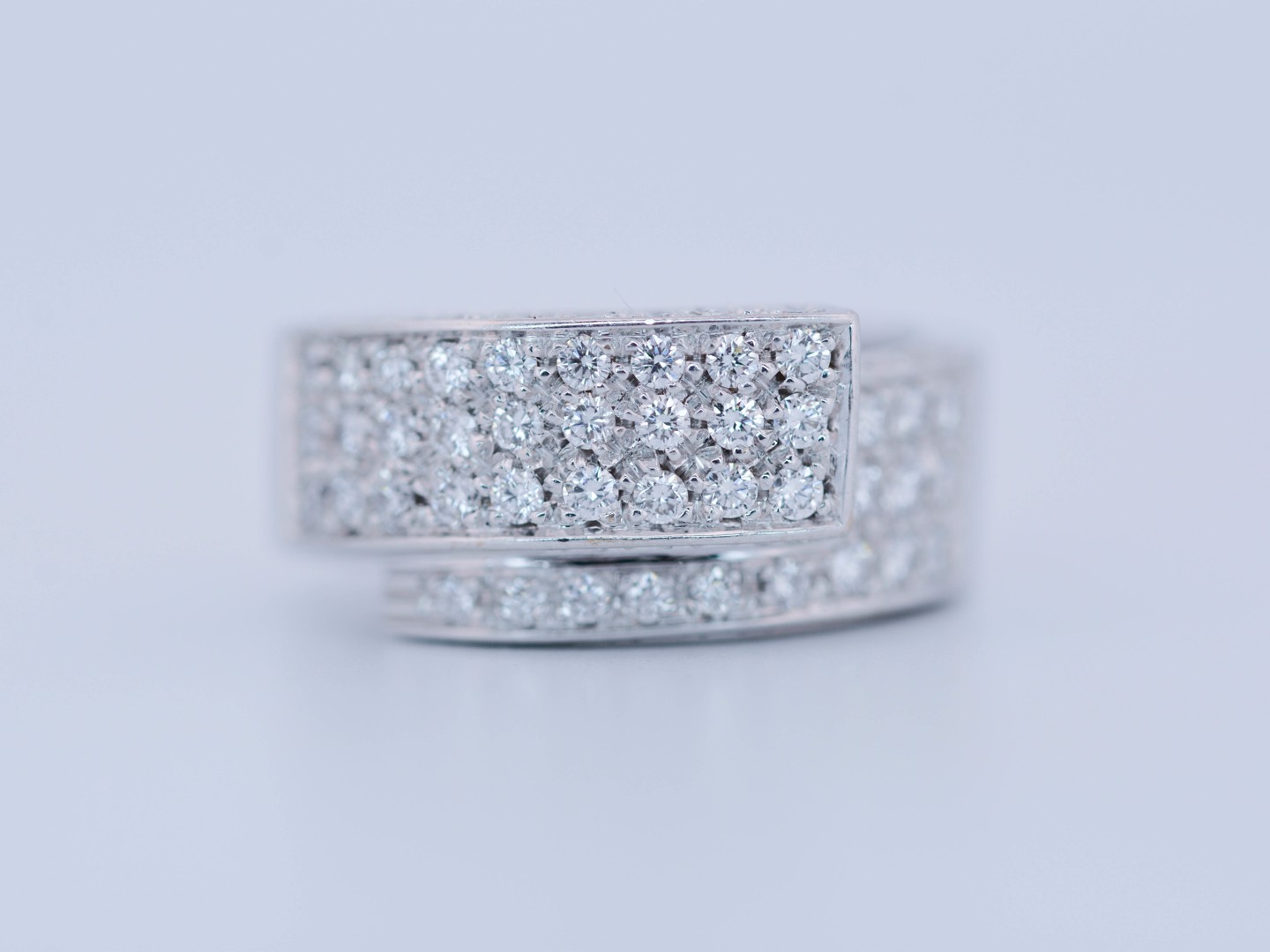 Élégante bague massive en or blanc 18 carats (poinçon 750), sertie de 72 diamants taille brillant totalisant environ 1,40 carat. Les diamants, de couleur F–G et de pureté VS, diffusent une lumière éclatante qui allie force et raffinement.