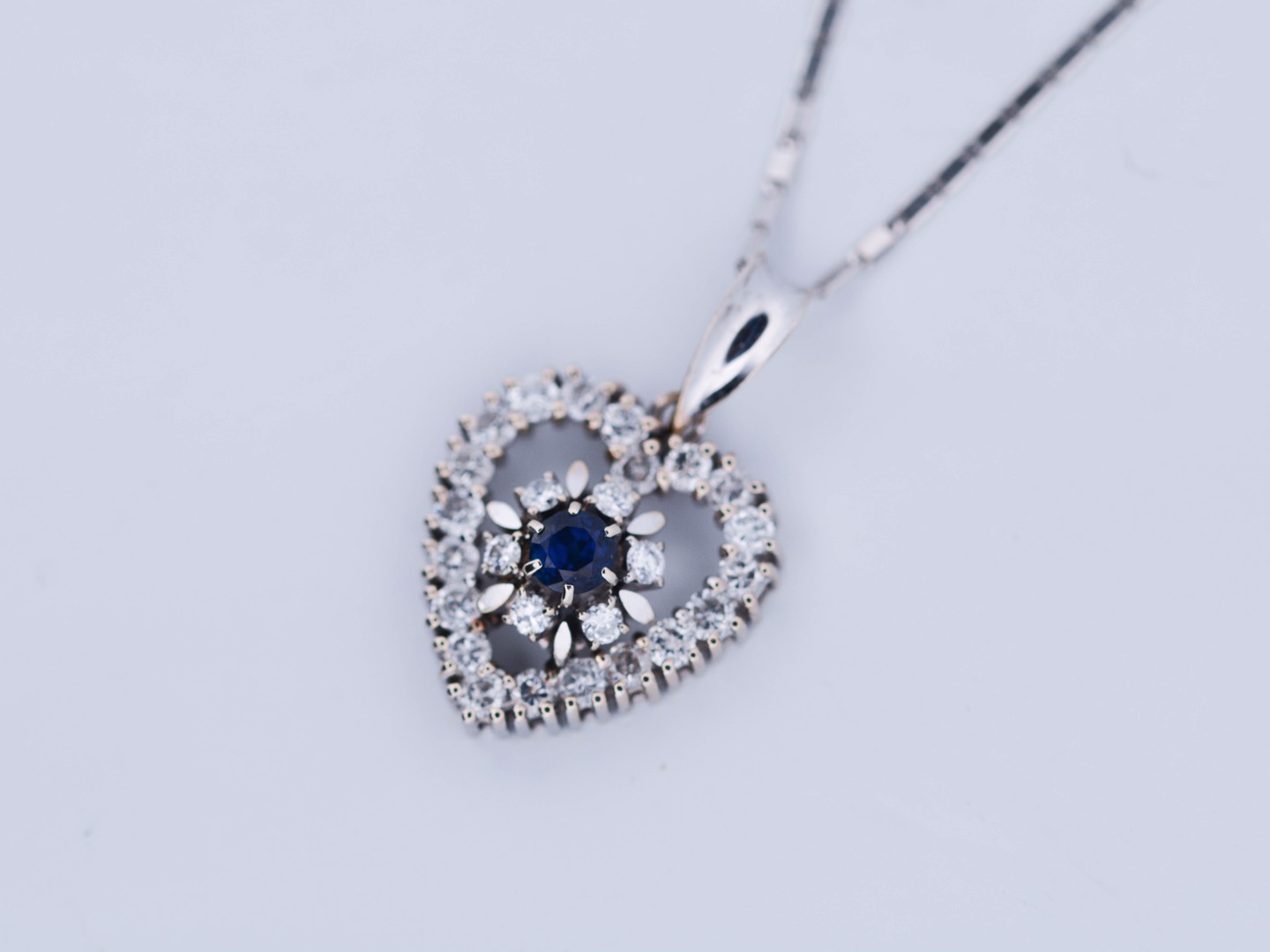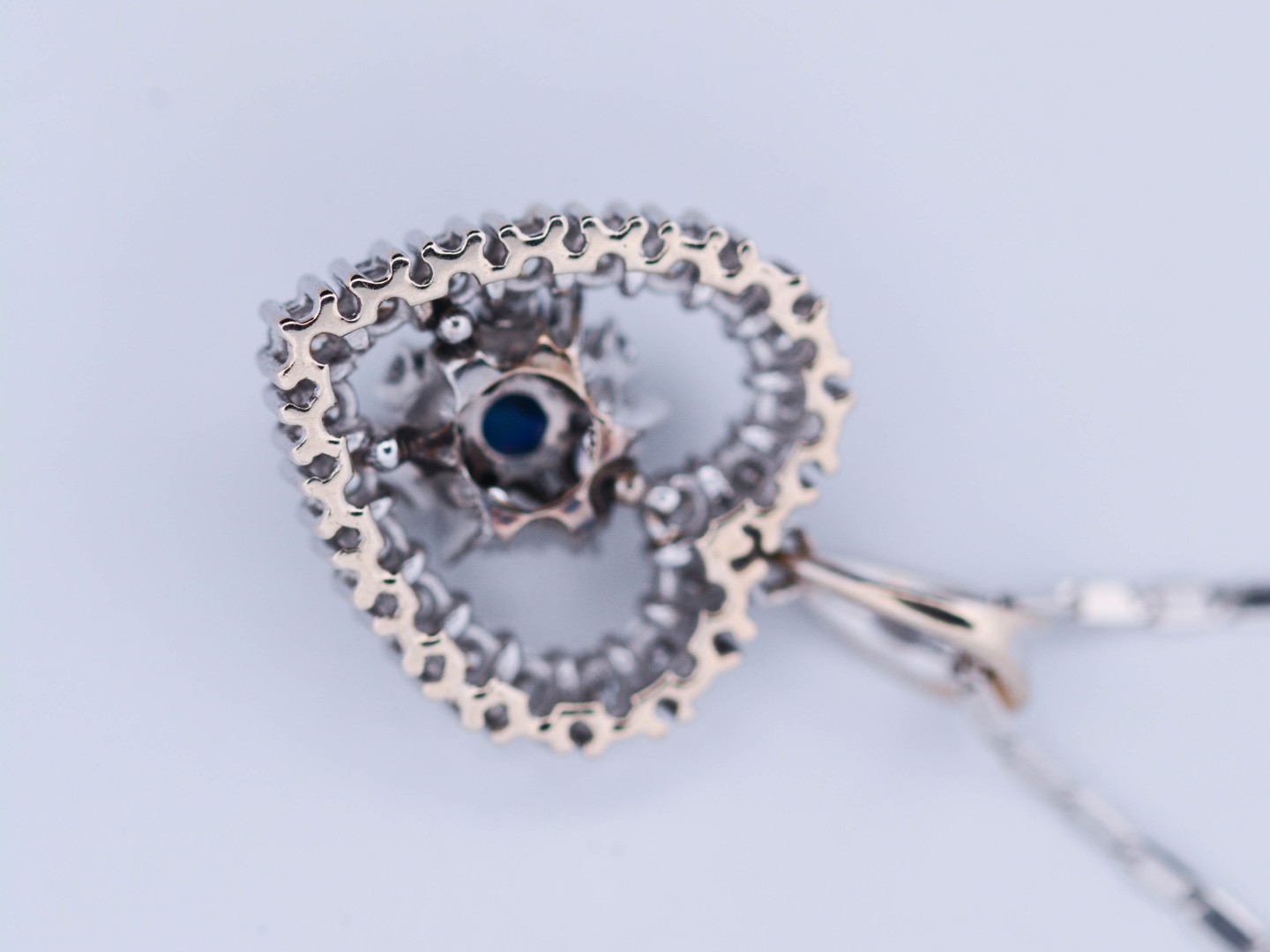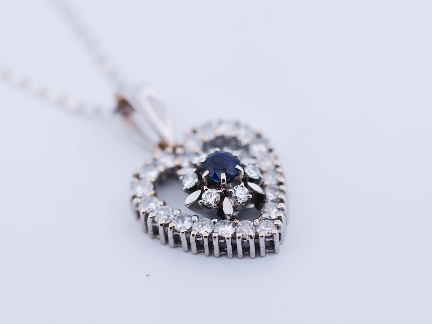 Charmant pendentif en forme de cœur en or blanc 18 carats, orné d’un saphir ovale d’environ 0,30 carat, entouré de 26 diamants taille brillant totalisant environ 1 carat.