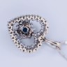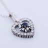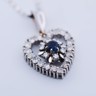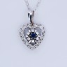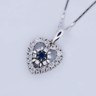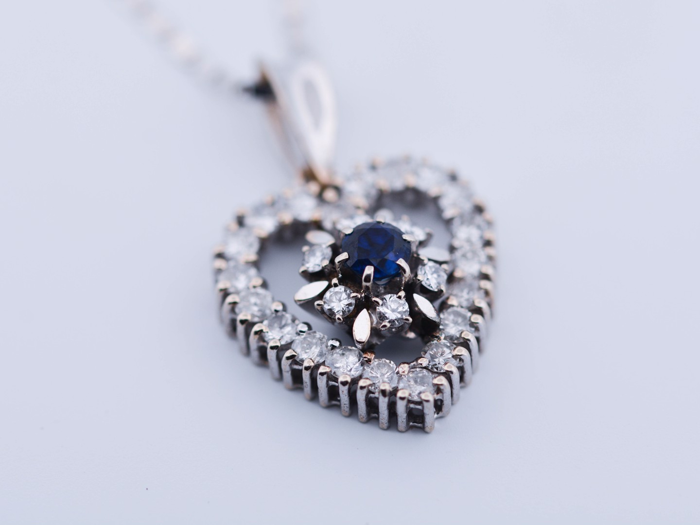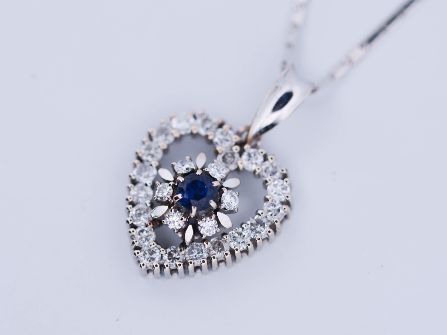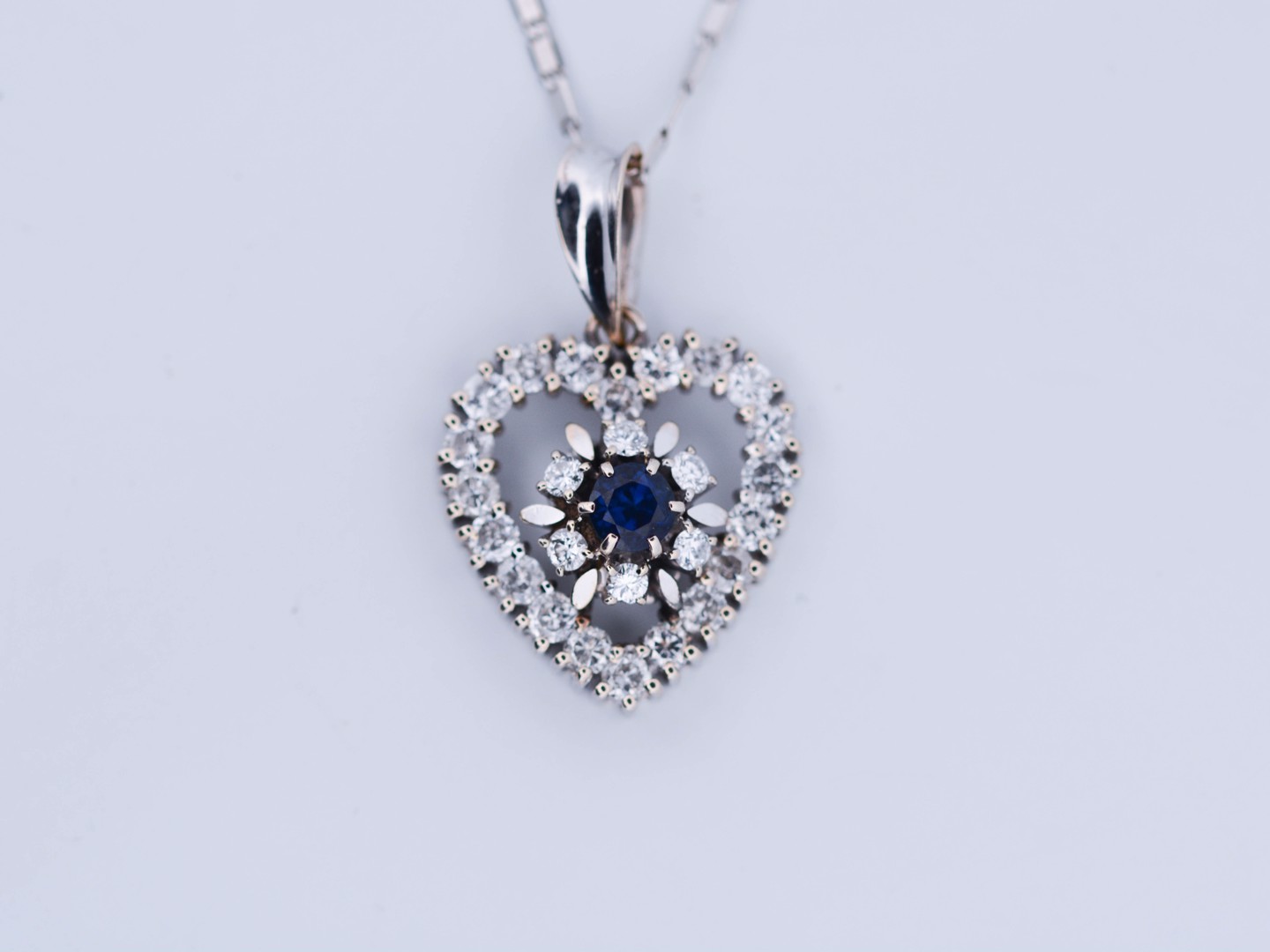 Charmant pendentif en forme de cœur en or blanc 18 carats, orné d’un saphir ovale d’environ 0,30 carat, entouré de 26 diamants taille brillant totalisant environ 1 carat.
