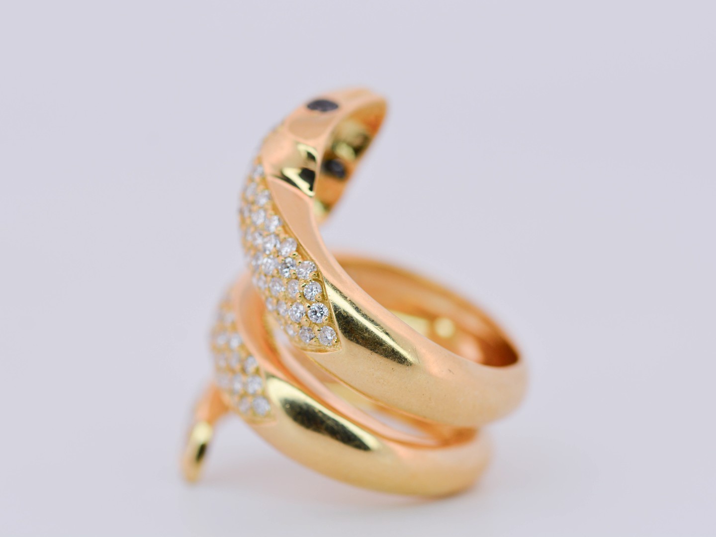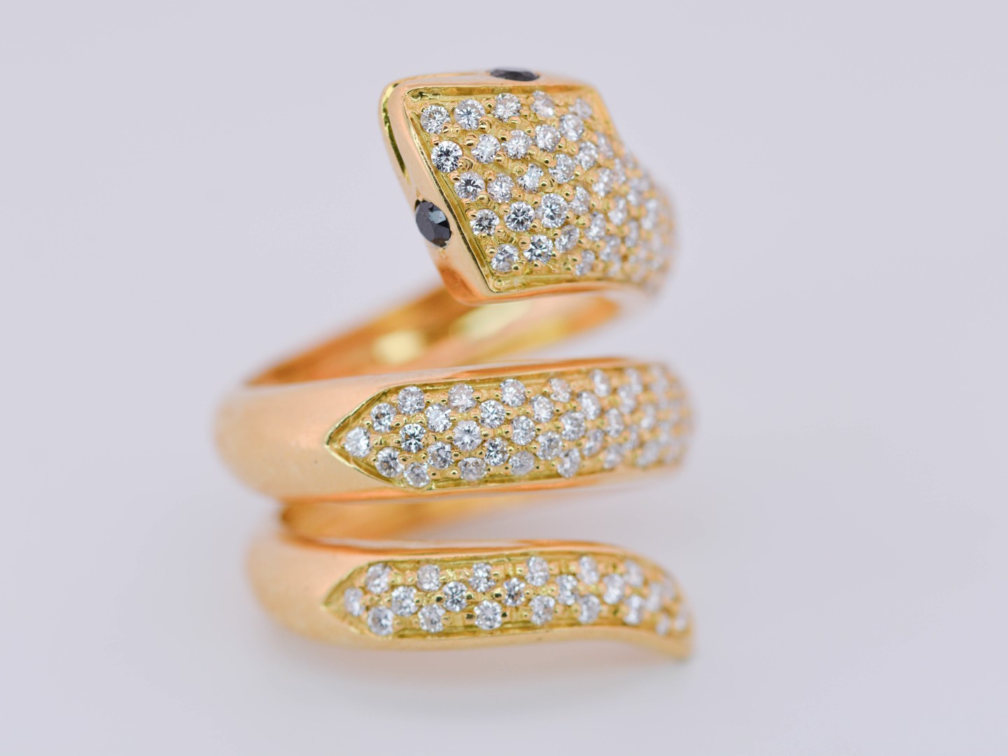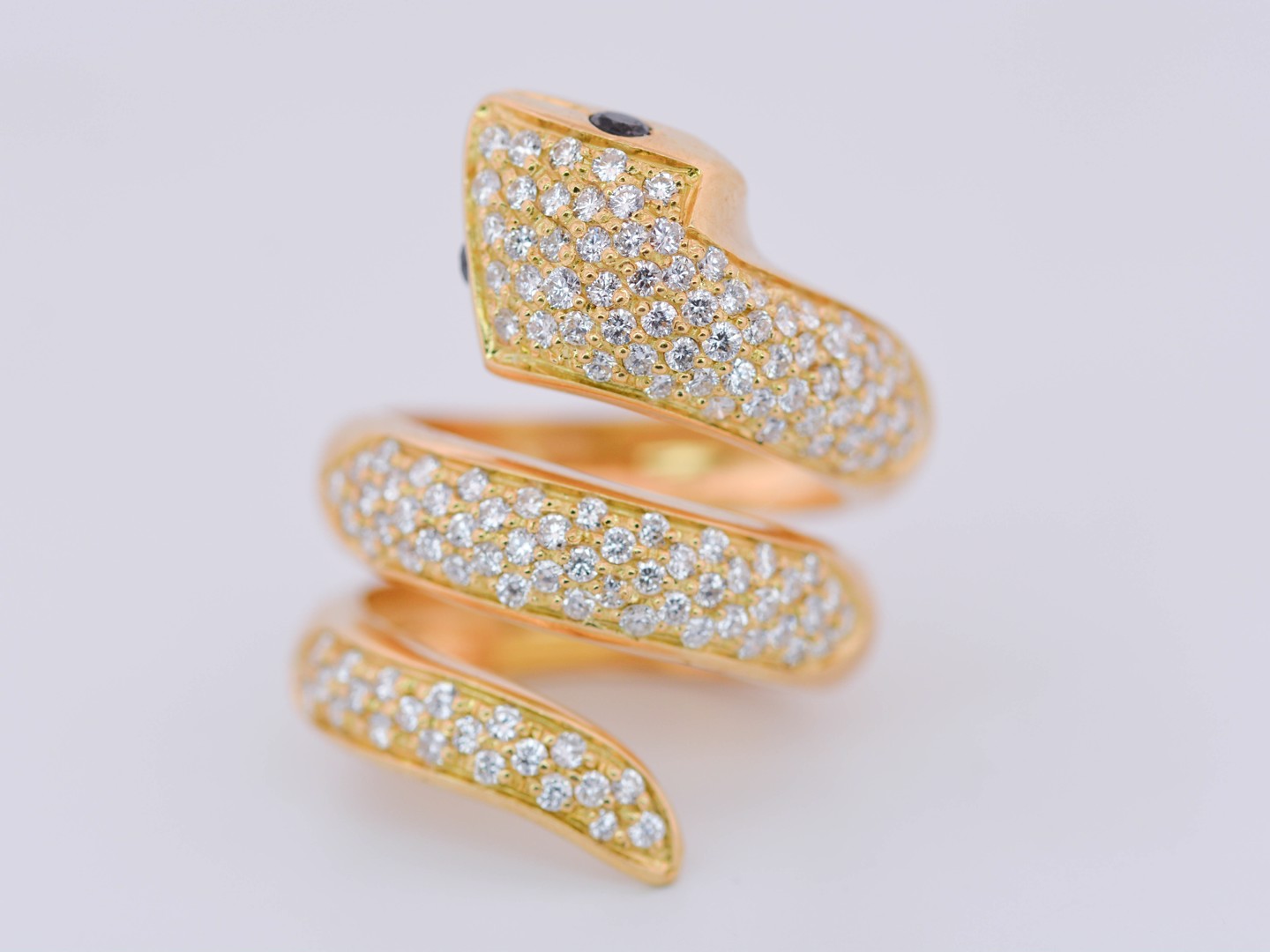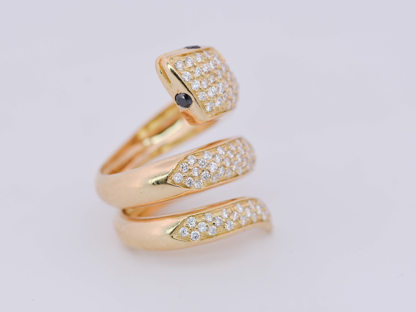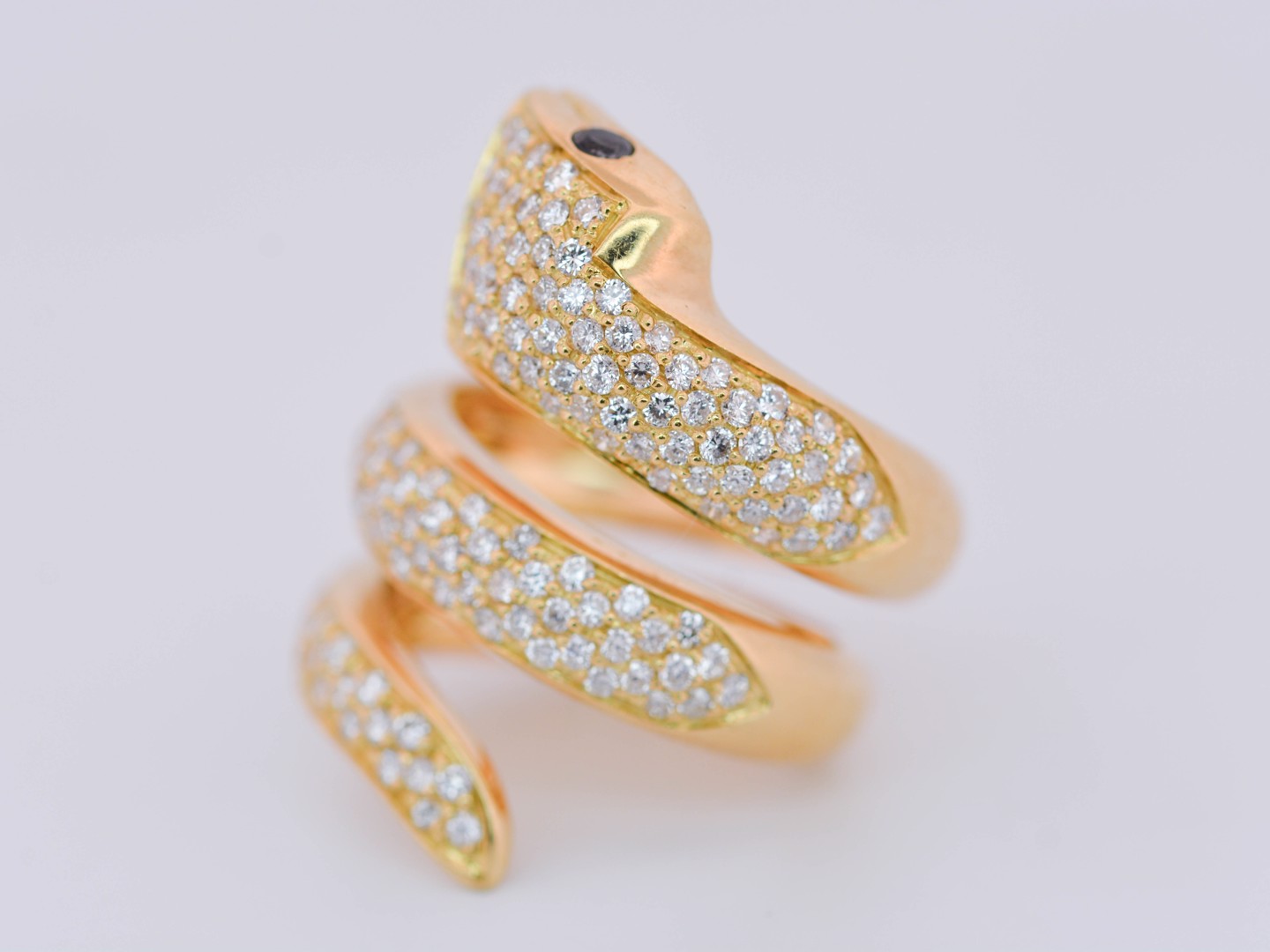 Spectaculaire bague massive en forme de serpent, réalisée en or blanc 18 carats (poinçon 750), somptueusement sertie d’environ 130 diamants taille brillant pour un poids total d’environ 1,30 carat.