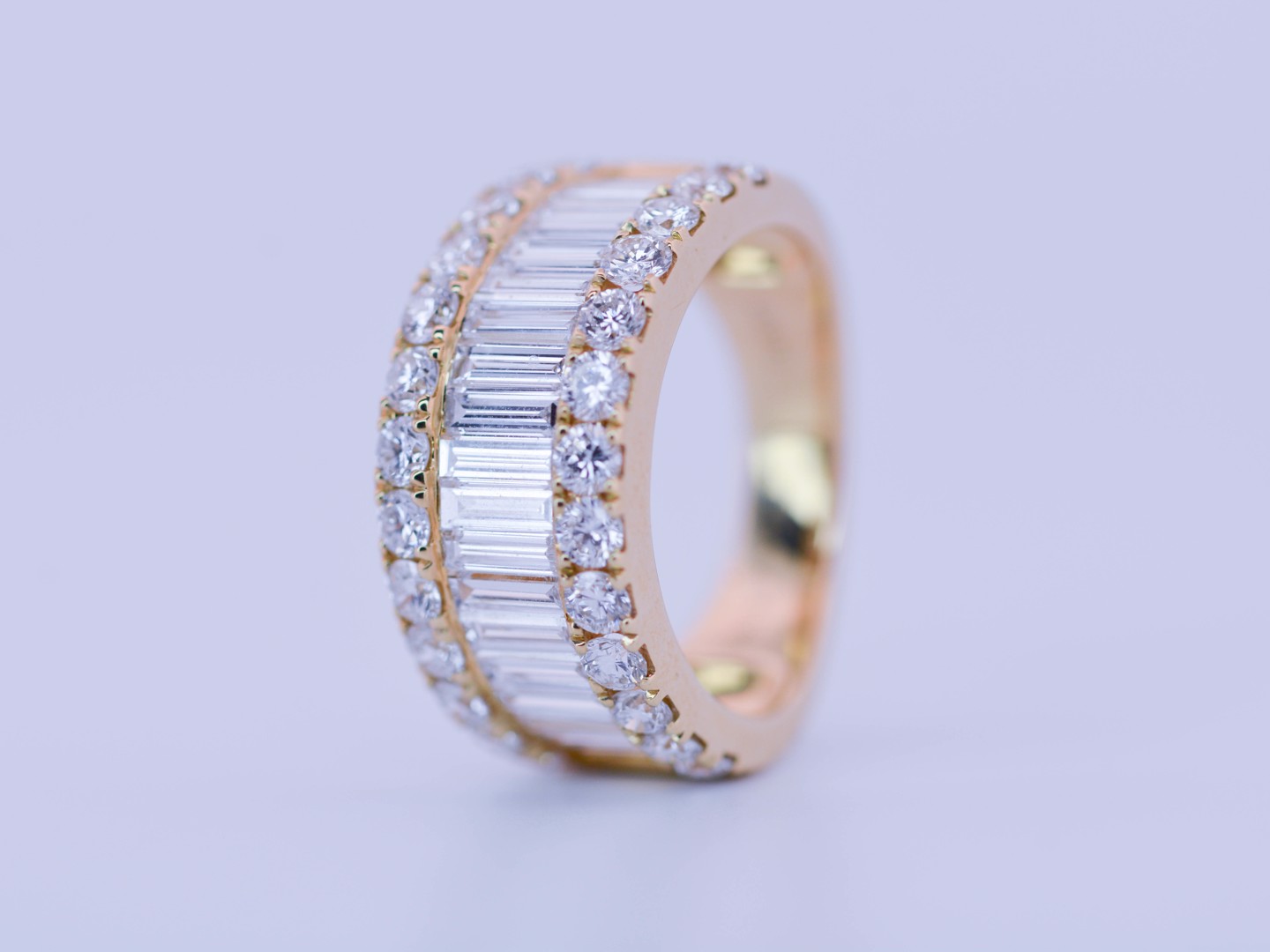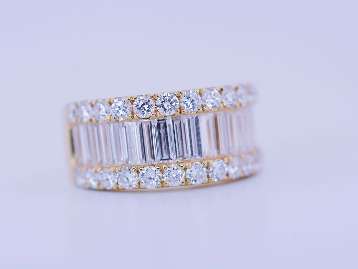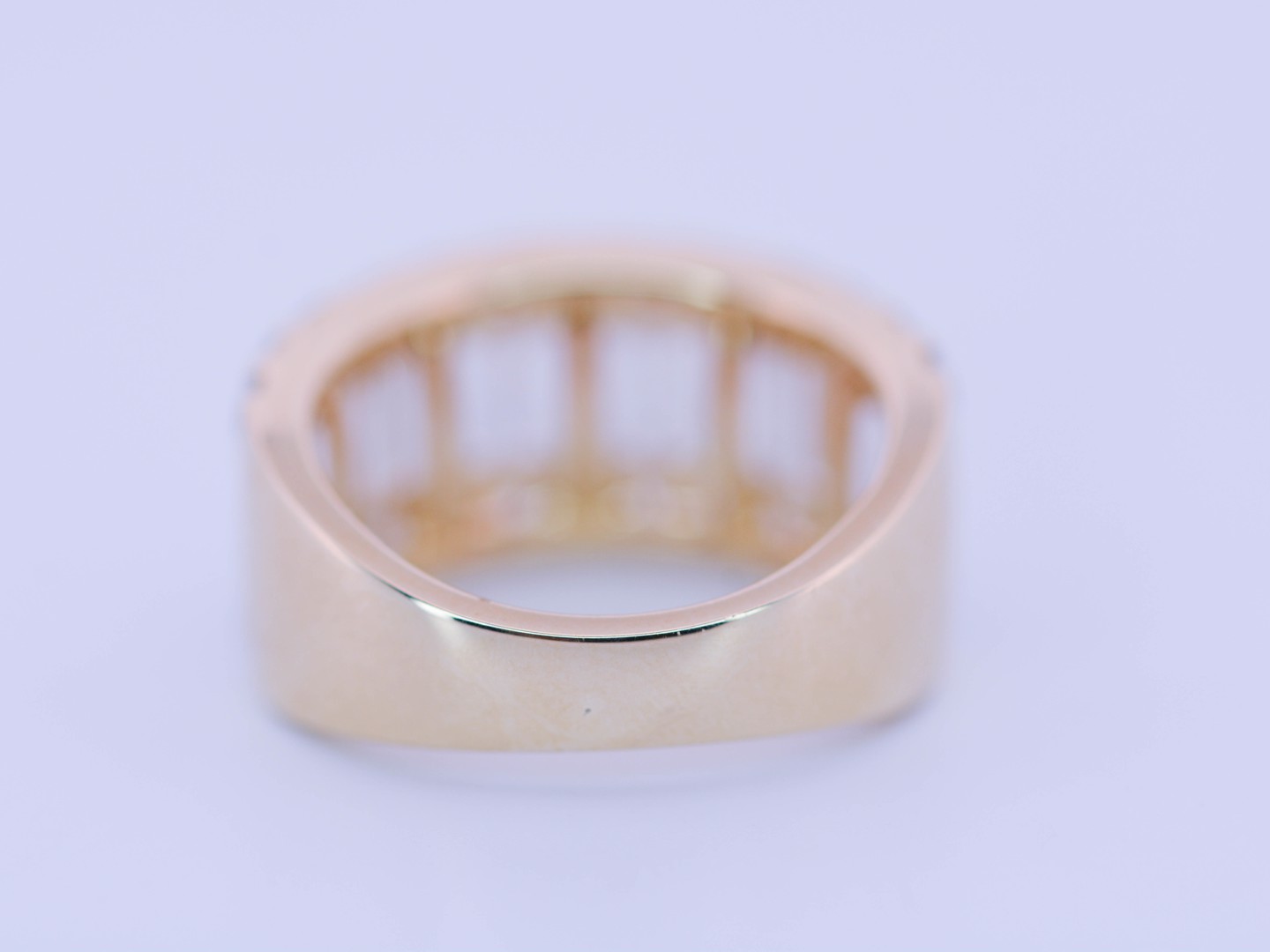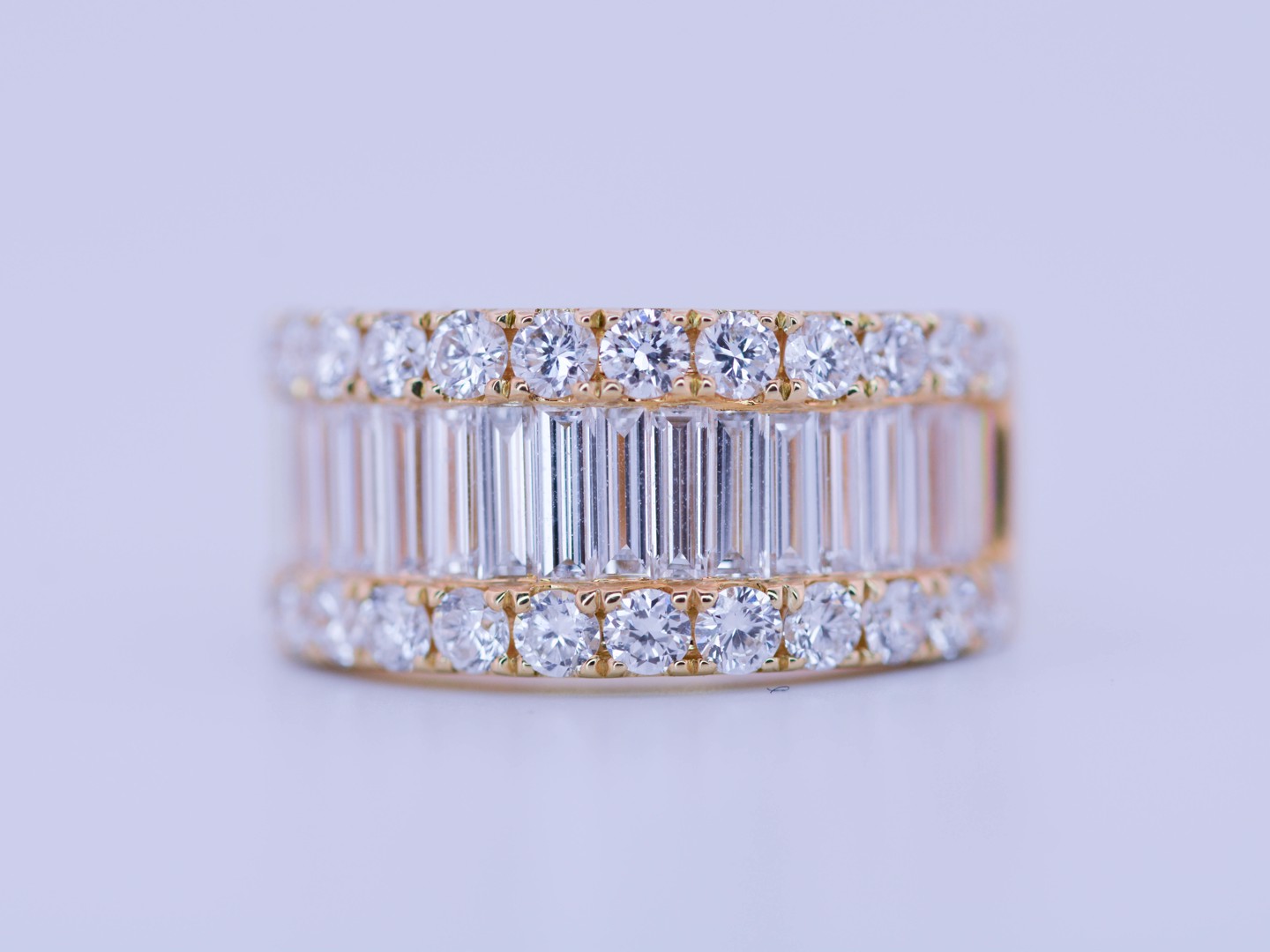 Superbe bague massive en or jaune 14 carats (poinçon sur le bijou), sertie d’une combinaison raffinée de 26 diamants taille brillant et 19 diamants taille baguette, pour un poids total d’environ 4,20 carats.