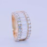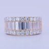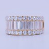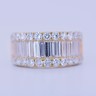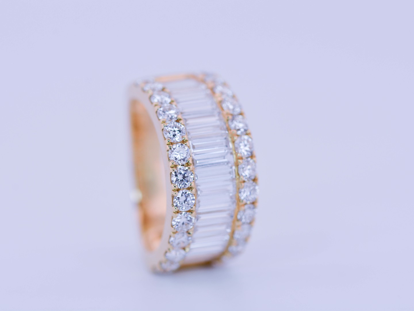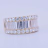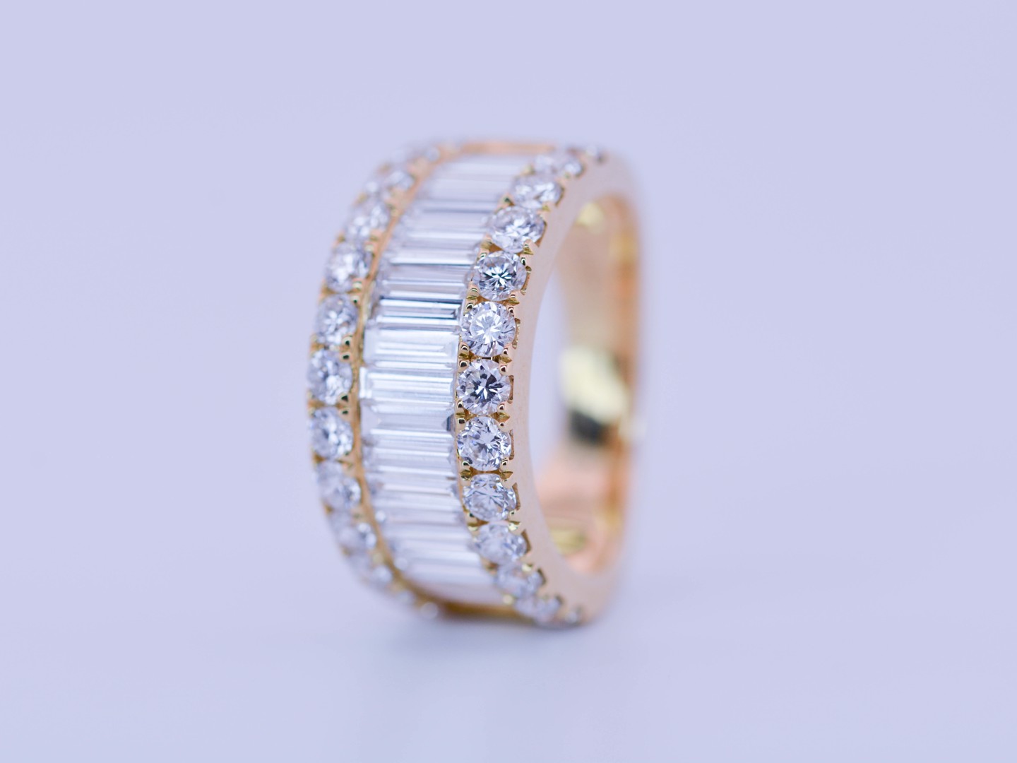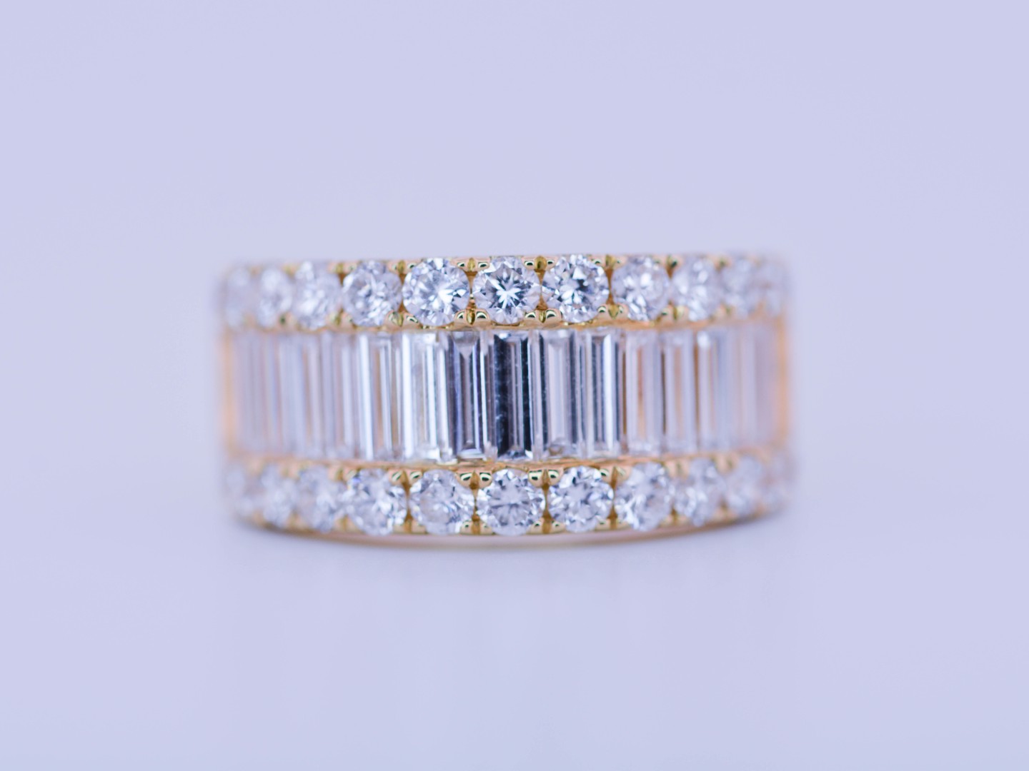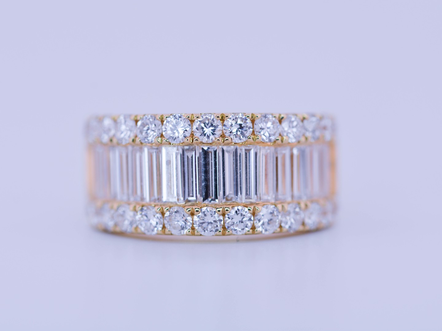 Superbe bague massive en or jaune 14 carats (poinçon sur le bijou), sertie d’une combinaison raffinée de 26 diamants taille brillant et 19 diamants taille baguette, pour un poids total d’environ 4,20 carats.