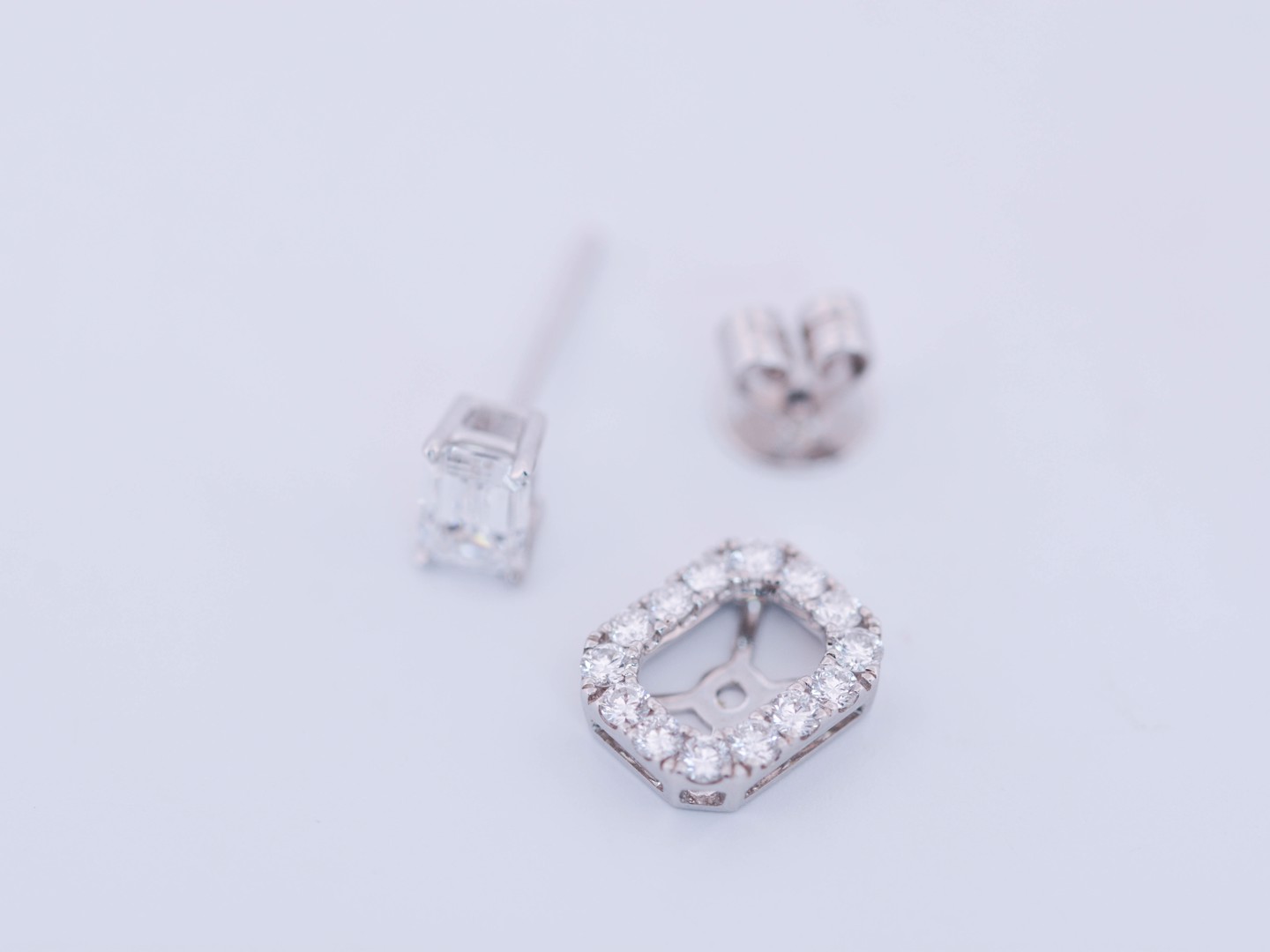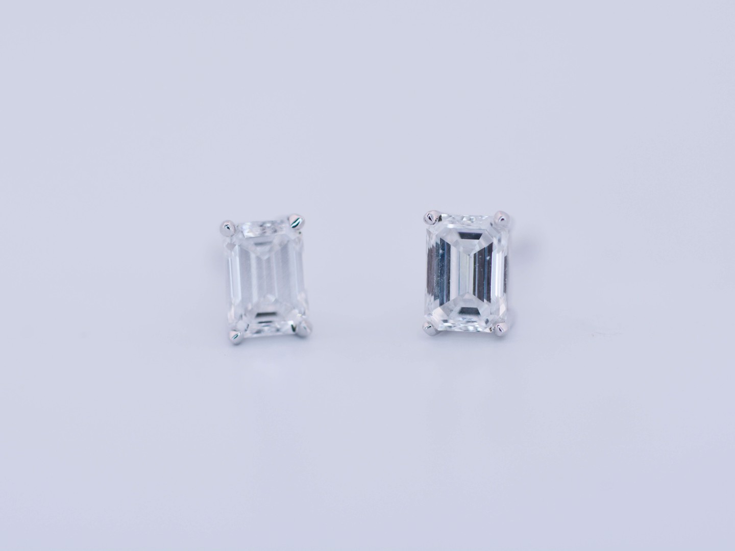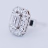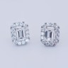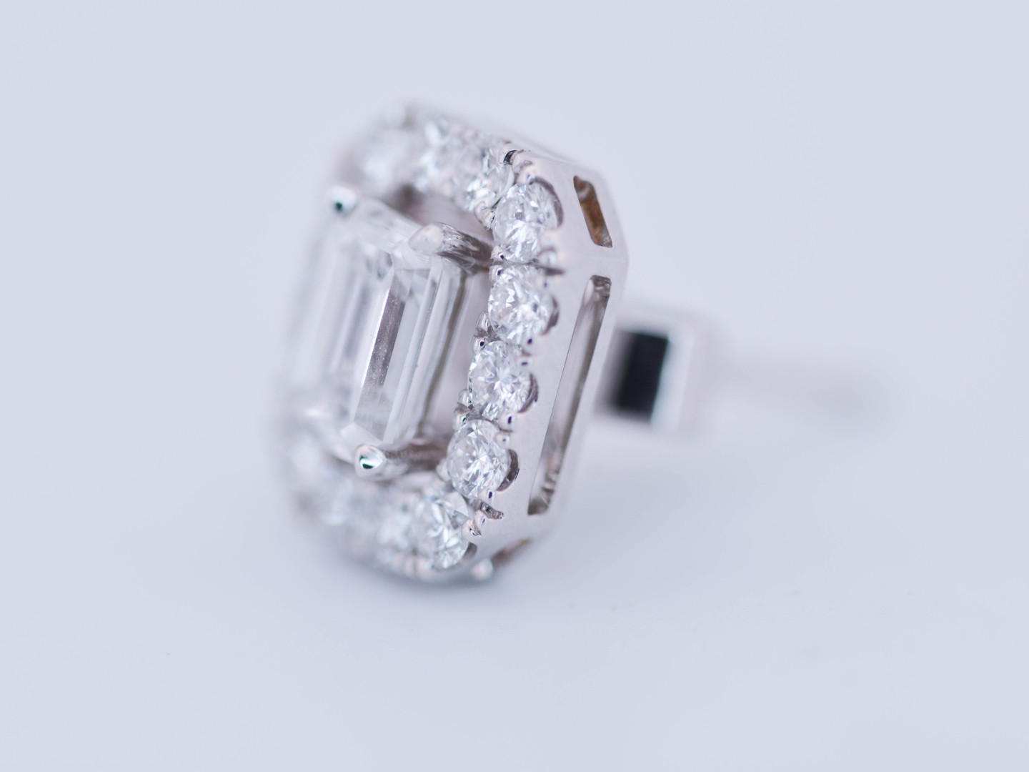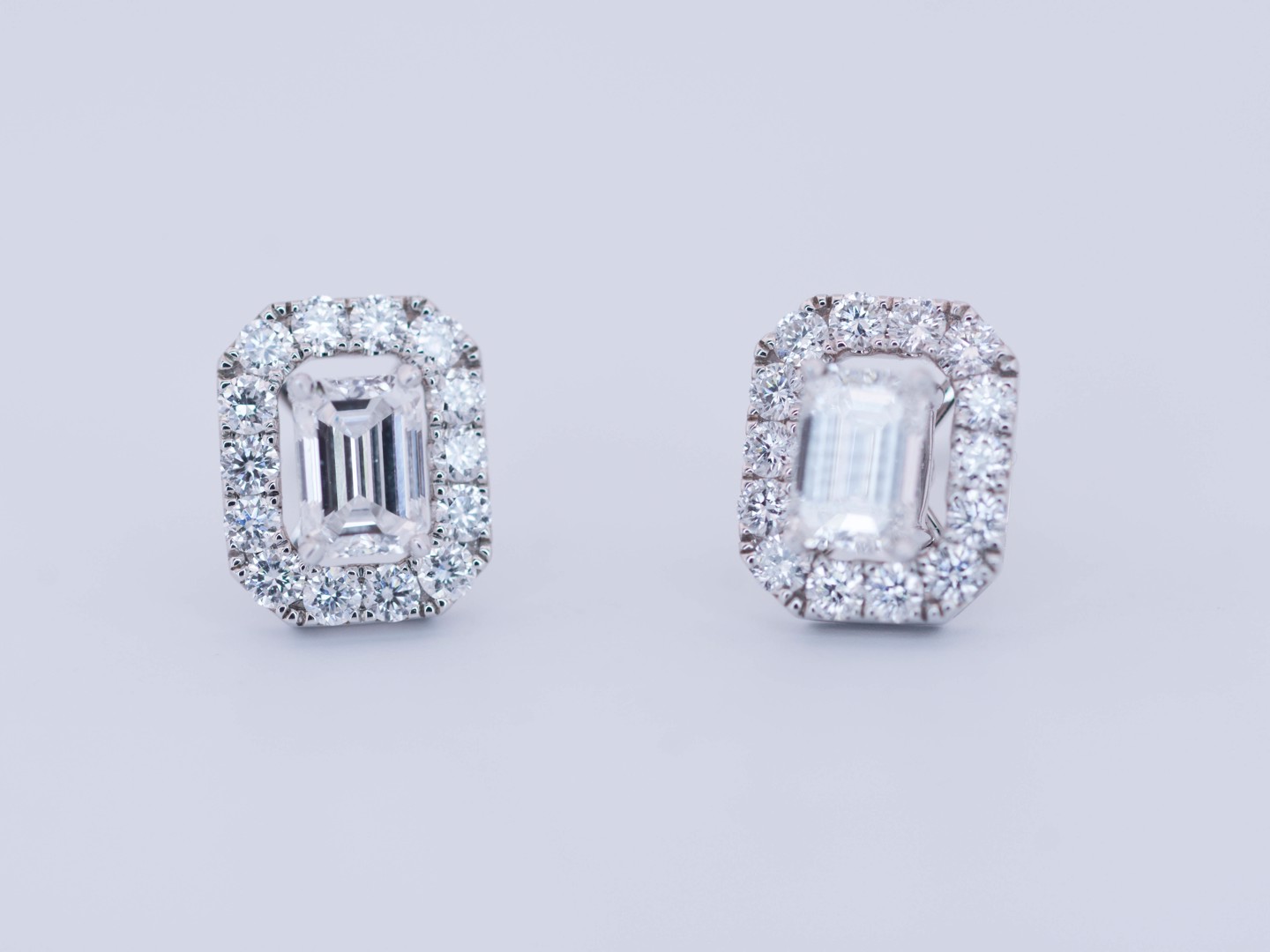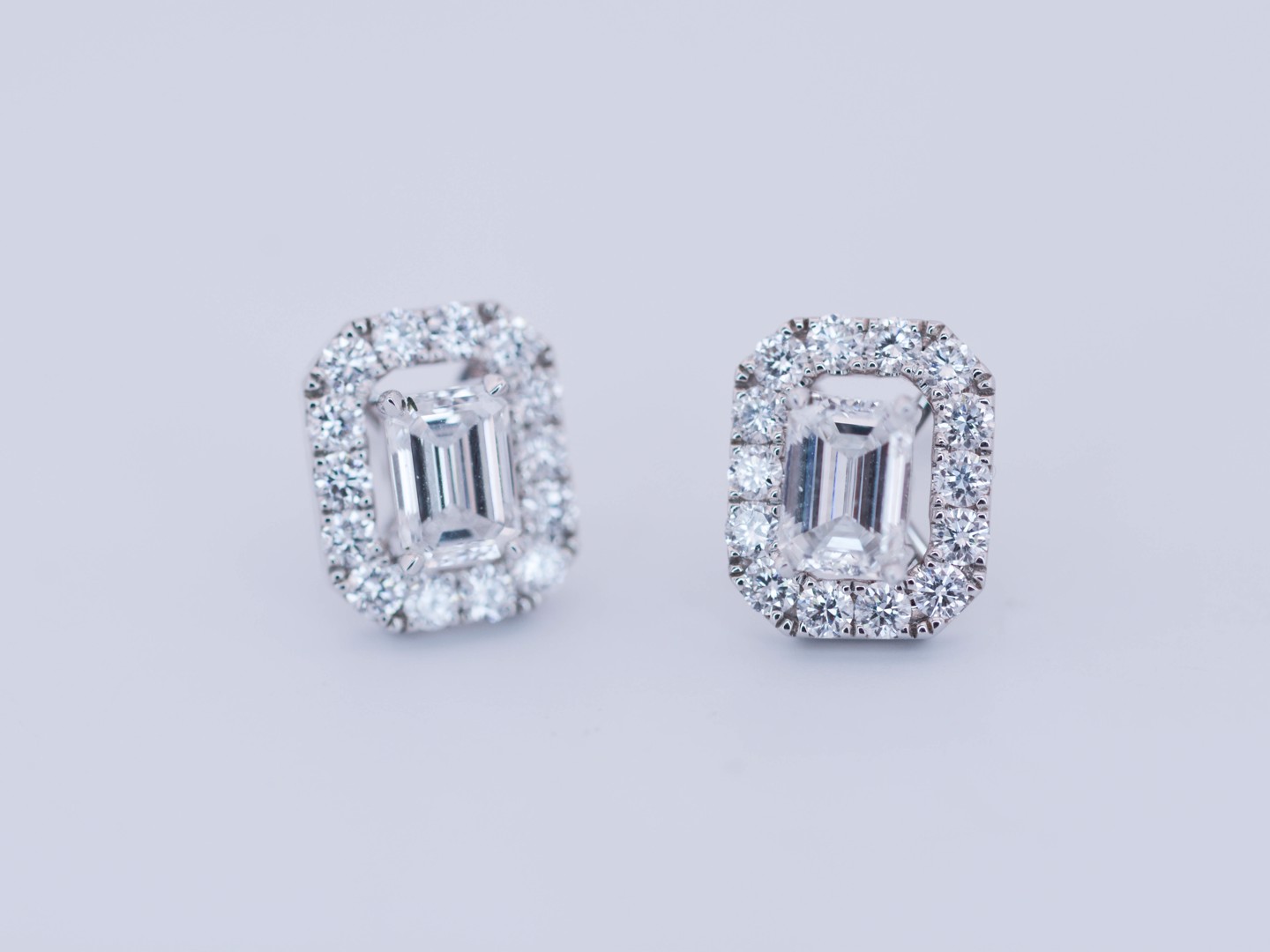 Raffinée paire de boucles d’oreilles en or blanc 18 carats, sertie de deux diamants taille émeraude totalisant environ 1 carat, entourés de 28 diamants taille brillant pour un total d’environ 0,80 carat.