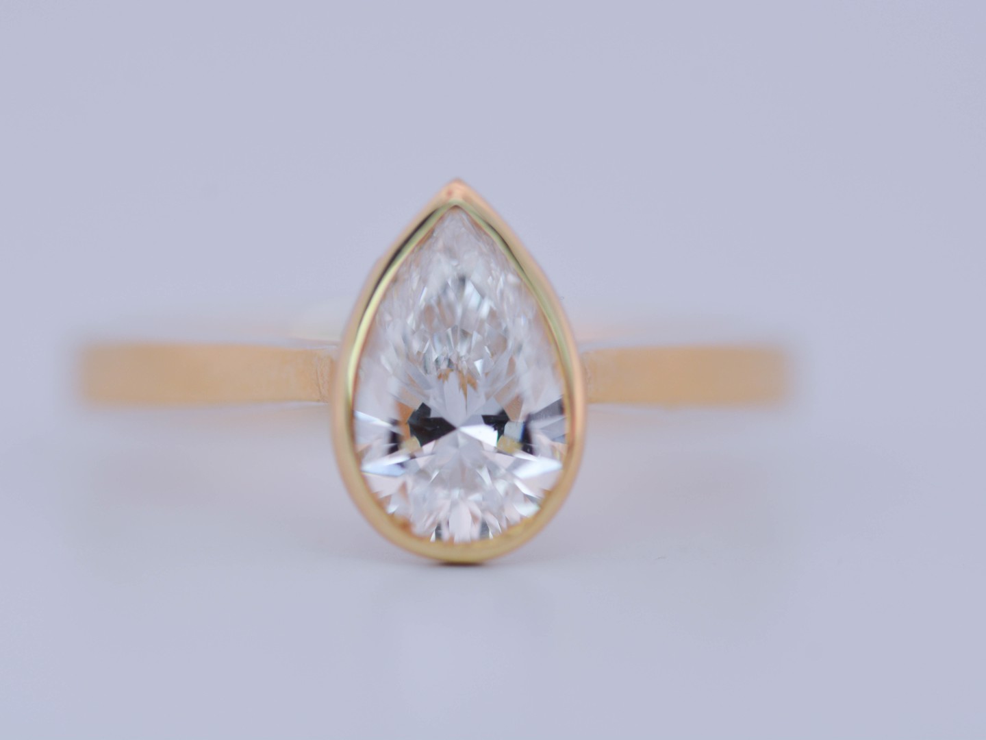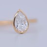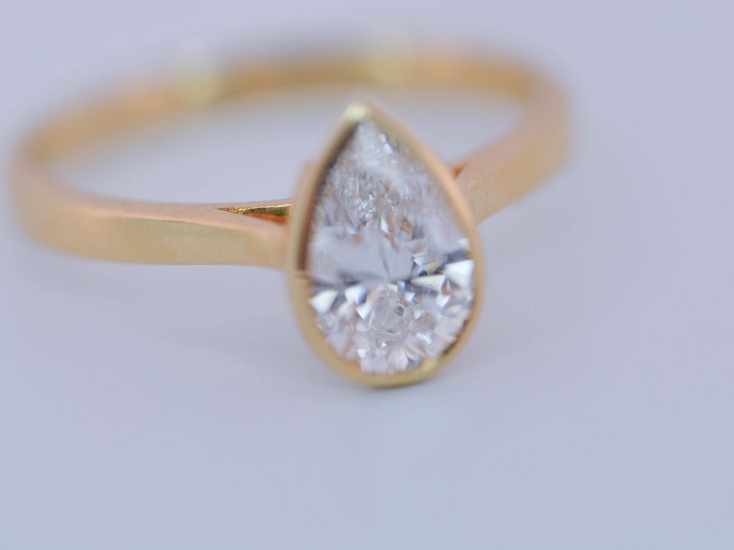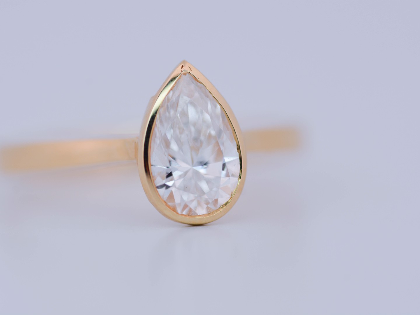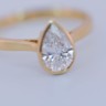 Bague solitaire en or jaune 14 carats (poinçon 585), ornée d’un diamant taille poire d’environ 1 carat. Le diamant, de couleur I et de pureté VS, diffuse une lumière douce et élégante, magnifiant les courbes délicates de la pierre.