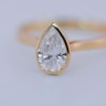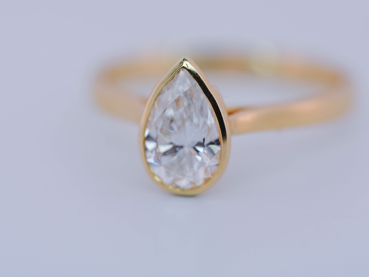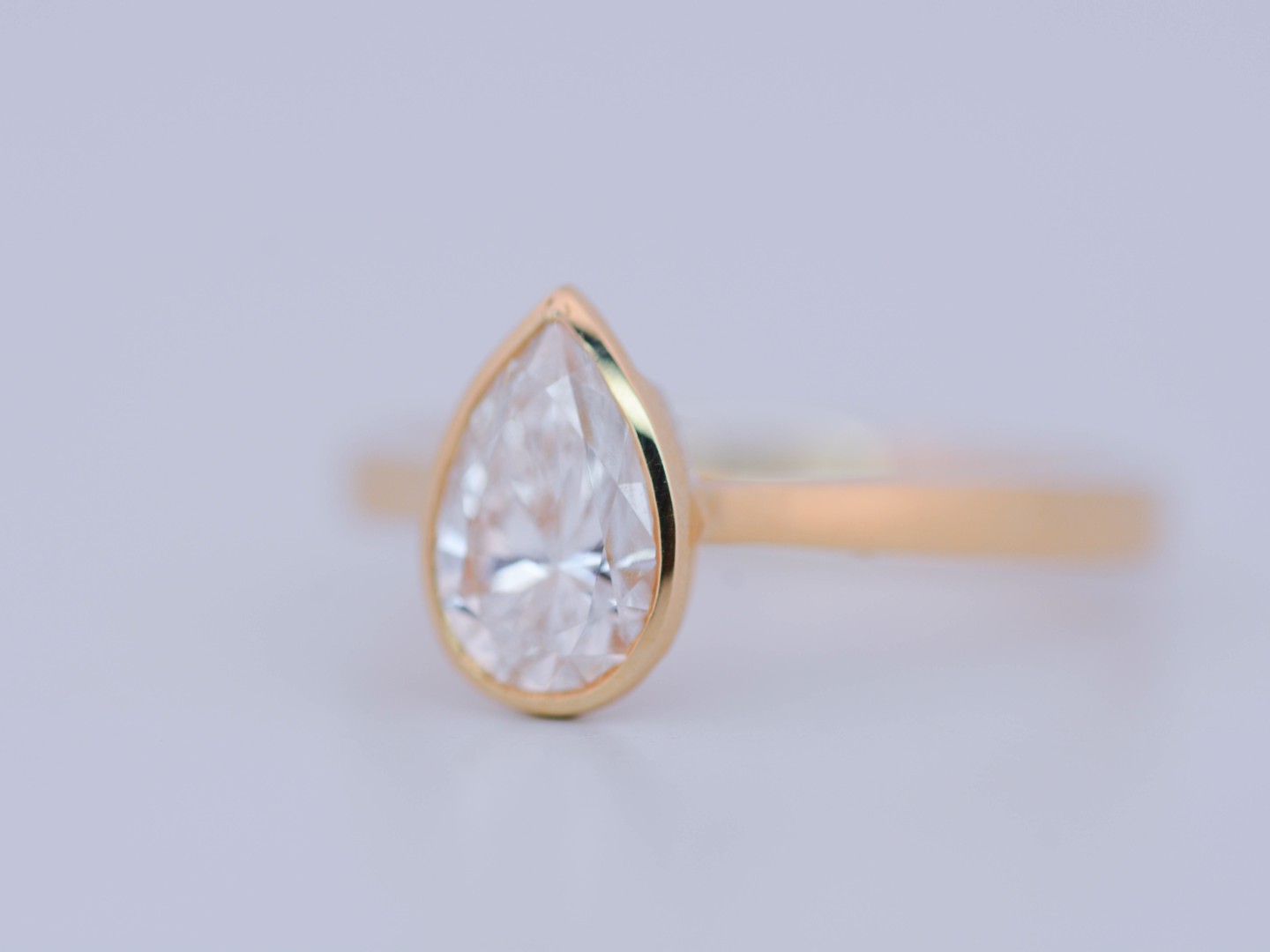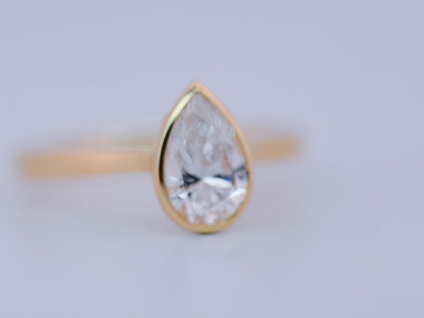 Bague solitaire en or jaune 14 carats (poinçon 585), ornée d’un diamant taille poire d’environ 1 carat. Le diamant, de couleur I et de pureté VS, diffuse une lumière douce et élégante, magnifiant les courbes délicates de la pierre.