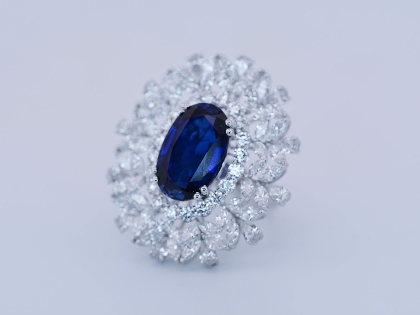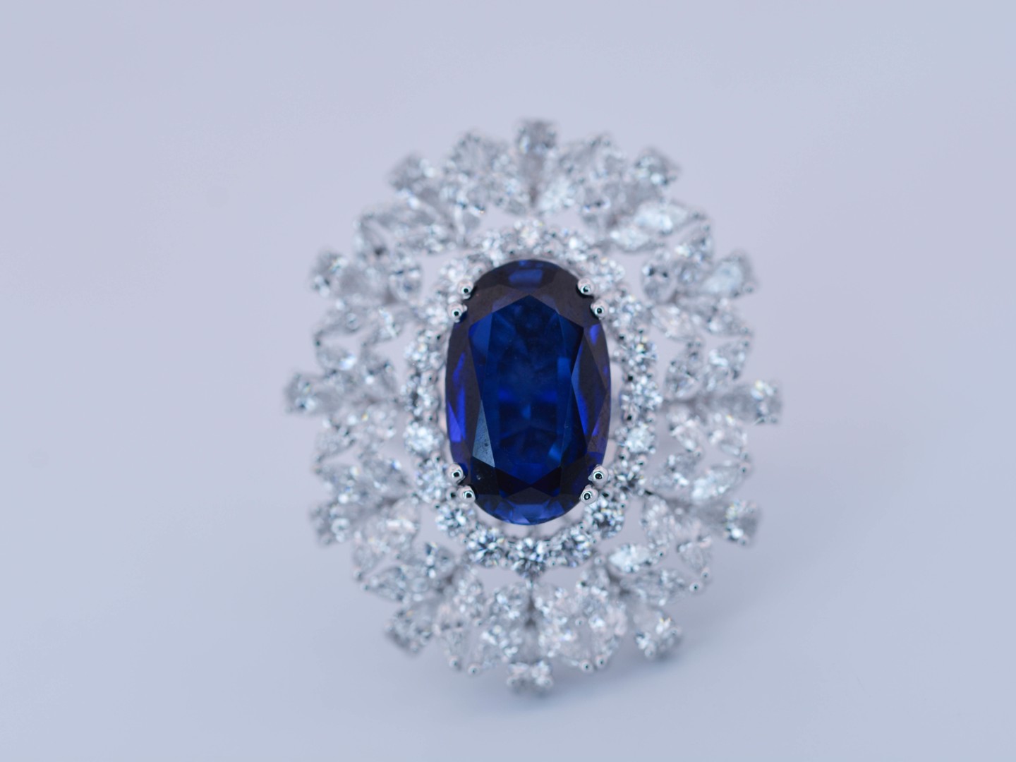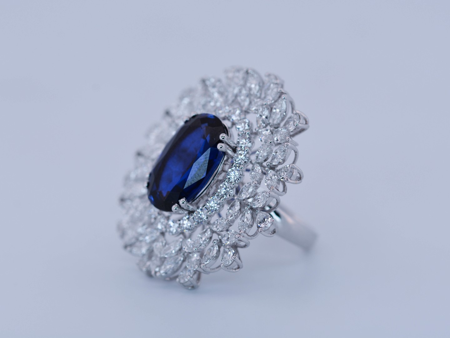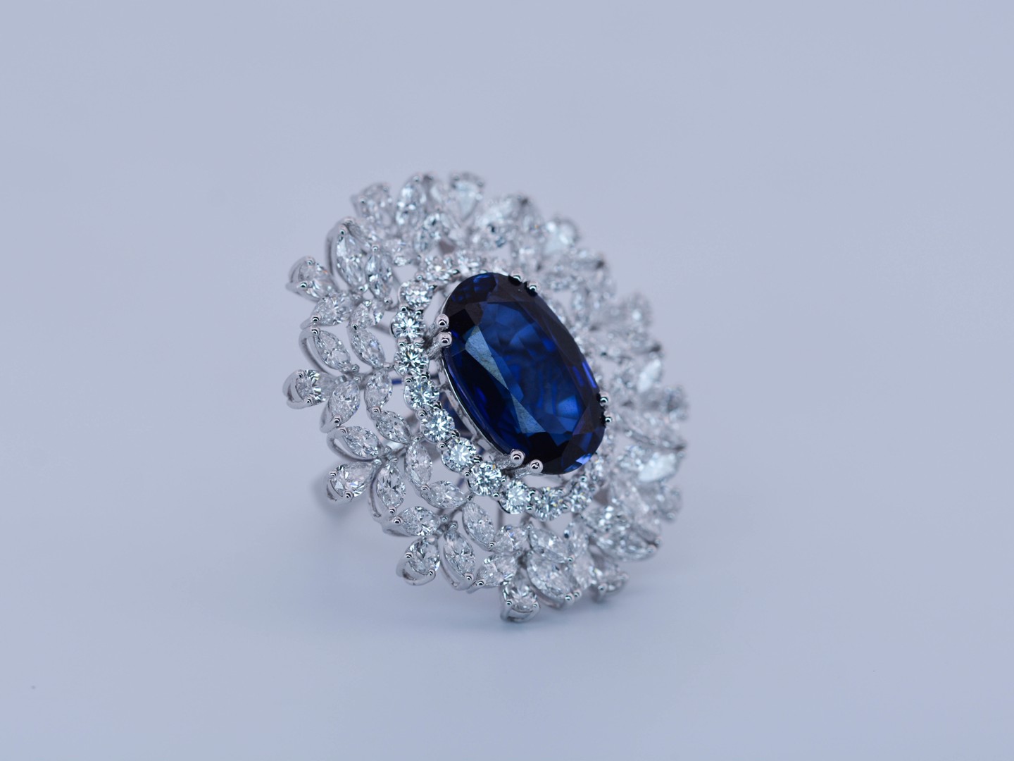 Les diamants, de couleur F–G (Blanc Exceptionnel) et de pureté VS, offrent un éclat éblouissant qui sublime la profondeur veloutée du saphir.