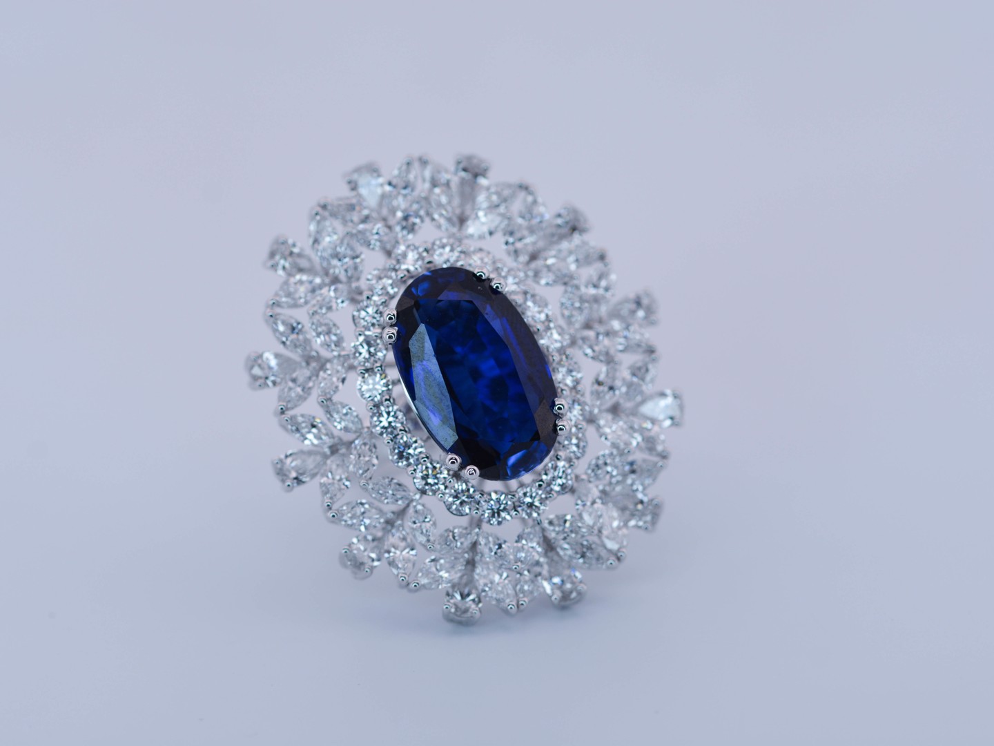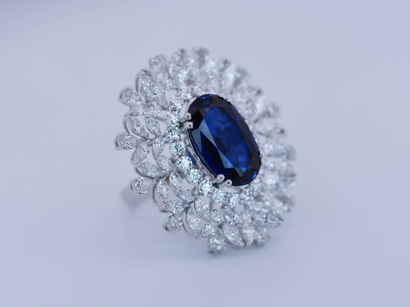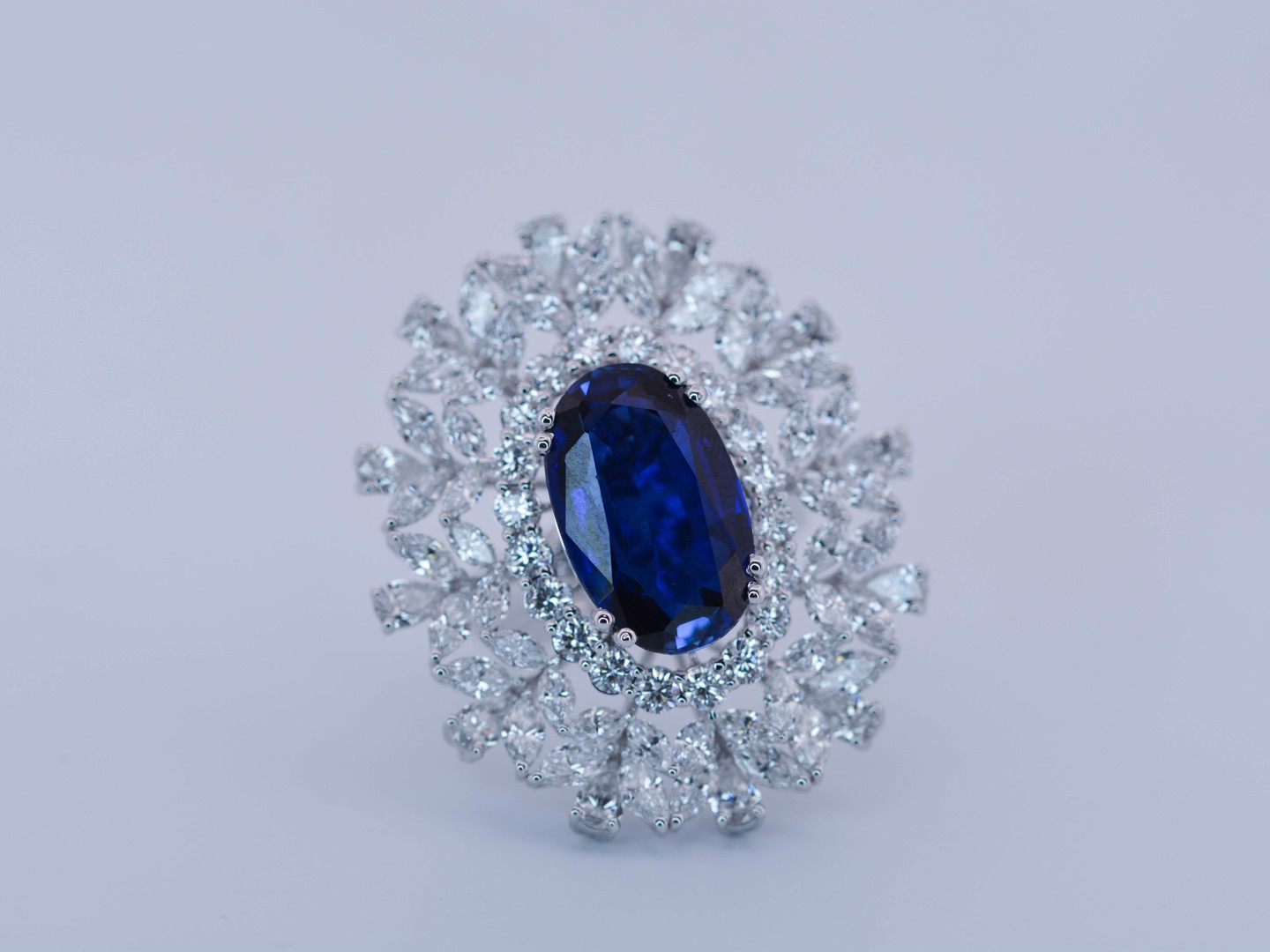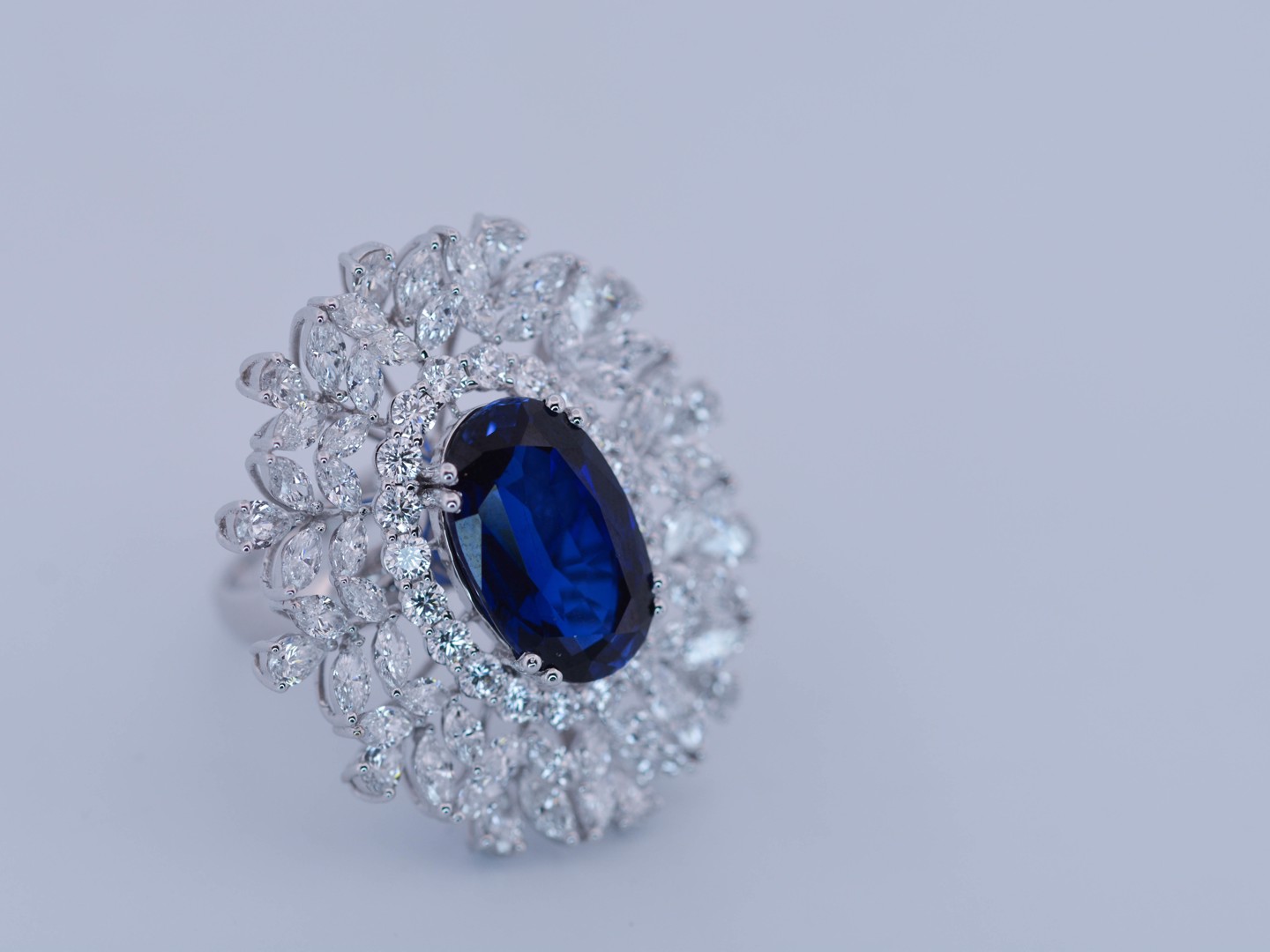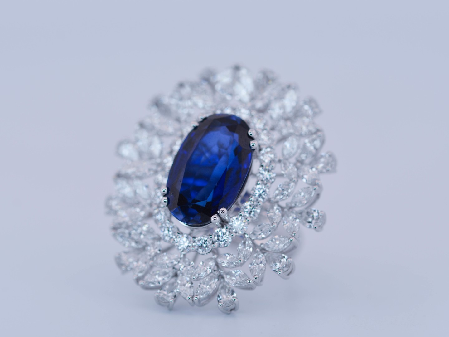 Les diamants, de couleur F–G (Blanc Exceptionnel) et de pureté VS, offrent un éclat éblouissant qui sublime la profondeur veloutée du saphir.