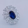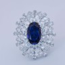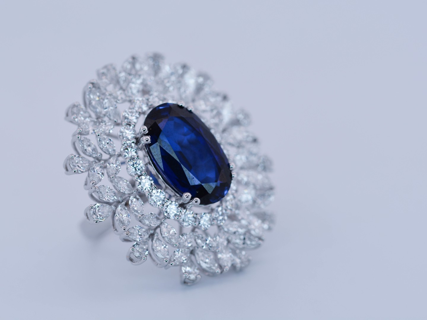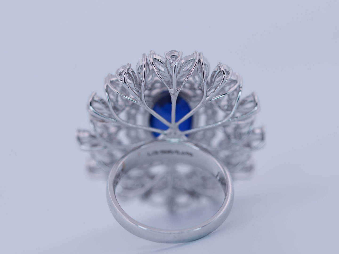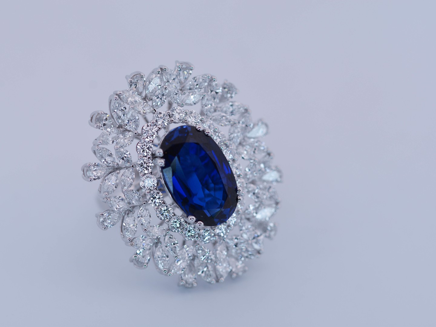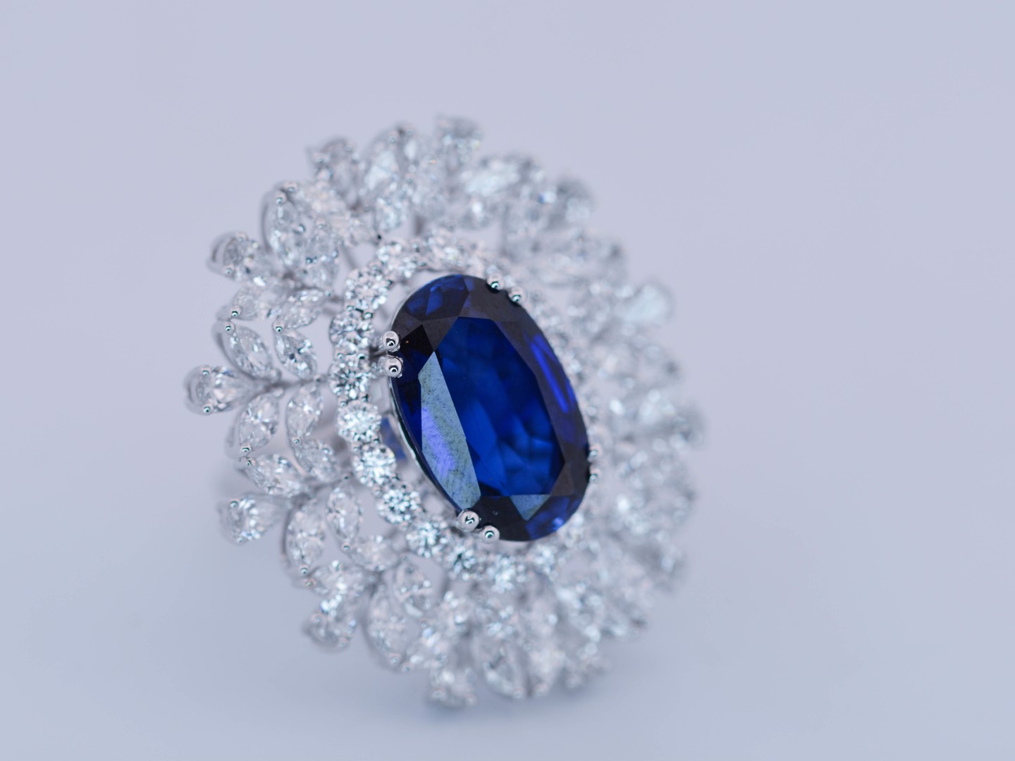Les diamants, de couleur F–G (Blanc Exceptionnel) et de pureté VS, offrent un éclat éblouissant qui sublime la profondeur veloutée du saphir.