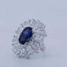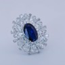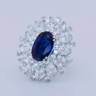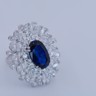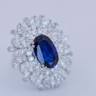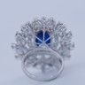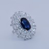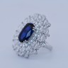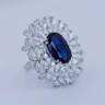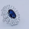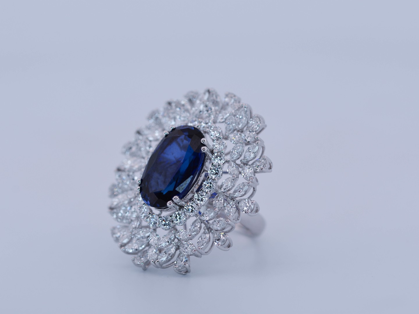 Somptueuse grande bague en or blanc 14 carats (poinçon 585), ornée d’un magnifique saphir London Blue d’environ 9,5 carats, entouré d’une composition spectaculaire de 20 diamants taille brillant, 12 taille marquise et 12 taille poire, totalisant environ 6,6 carats.