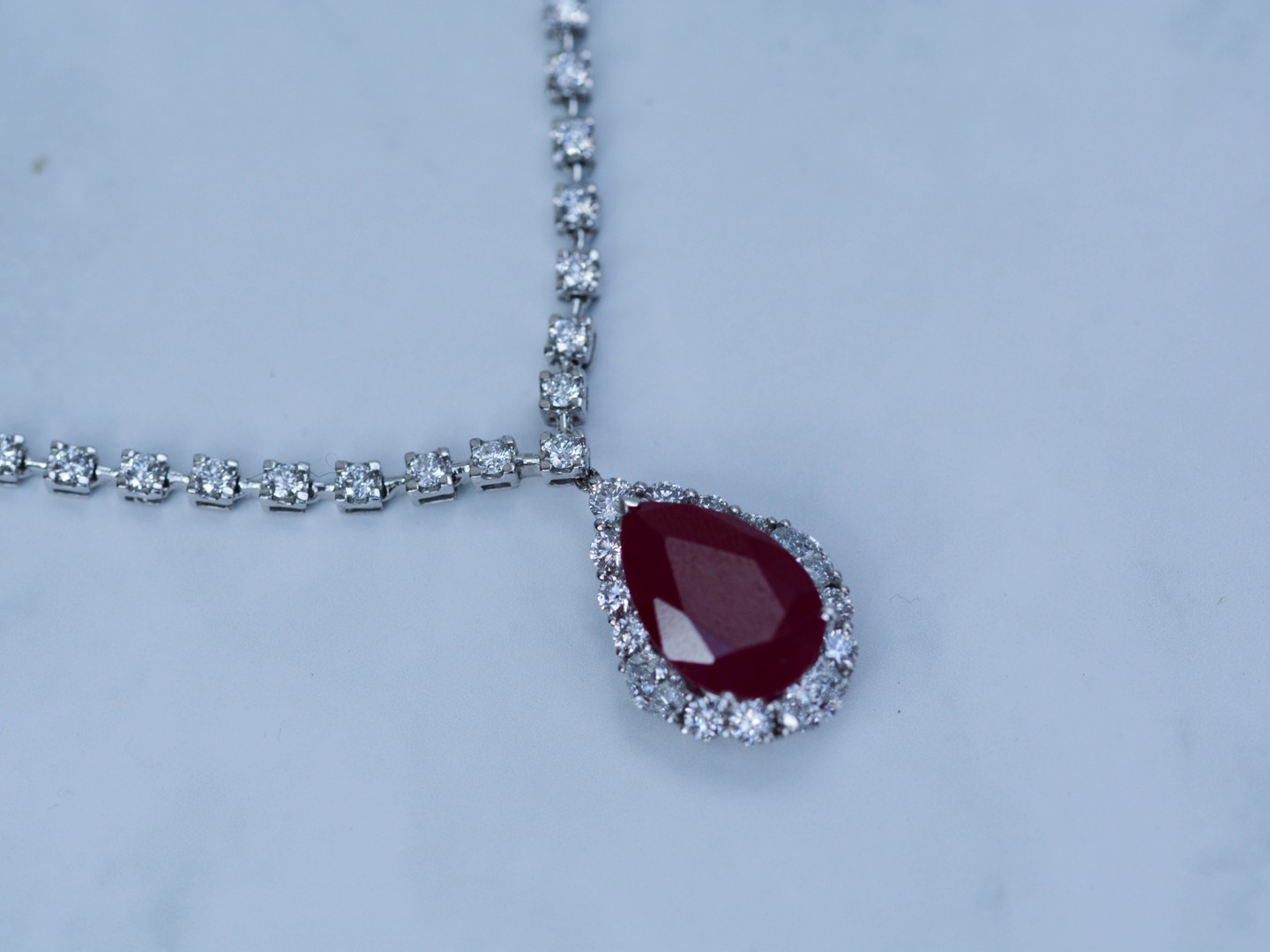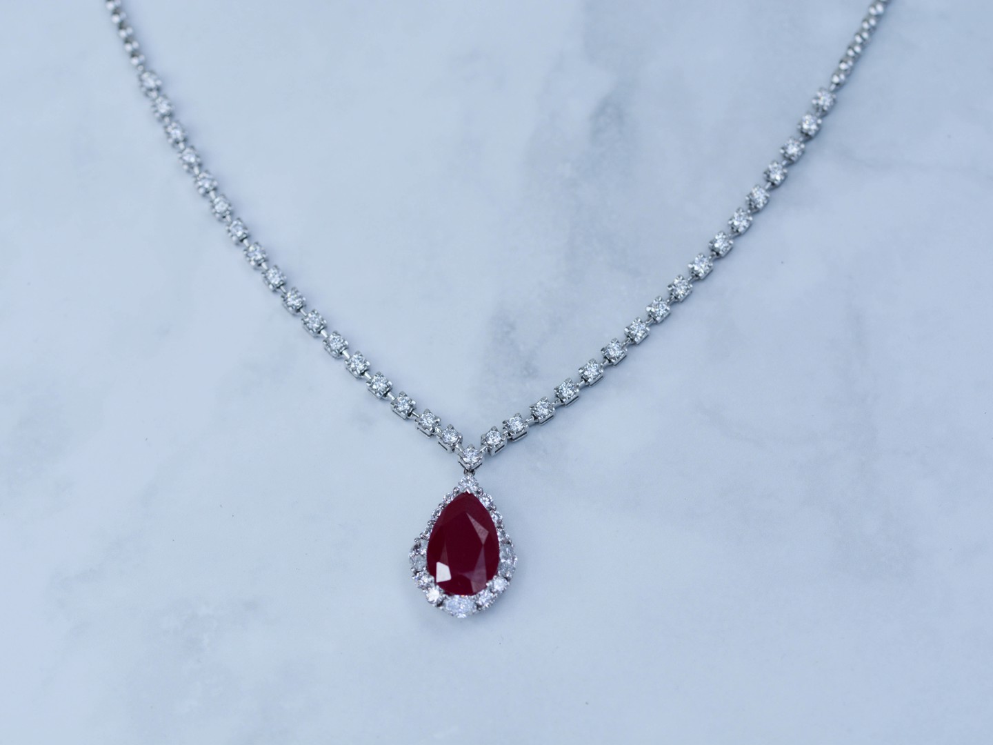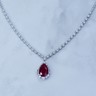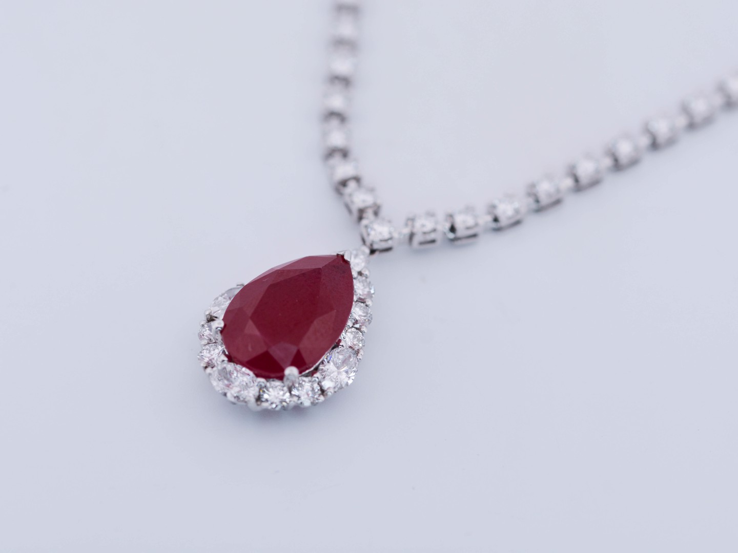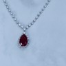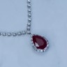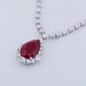 Superbe collier avec pendentif en or blanc 18 carats, orné d’un rubis ovale d’environ 8,5 carats, entouré d’une composition étincelante de 46 diamants taille brillant et 3 diamants taille ovale, totalisant environ 4 carats.