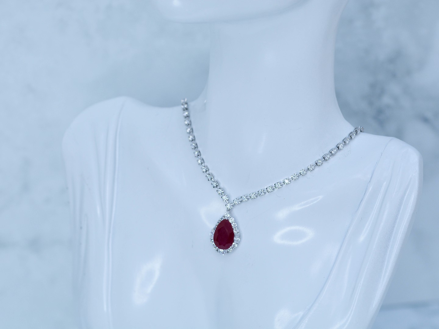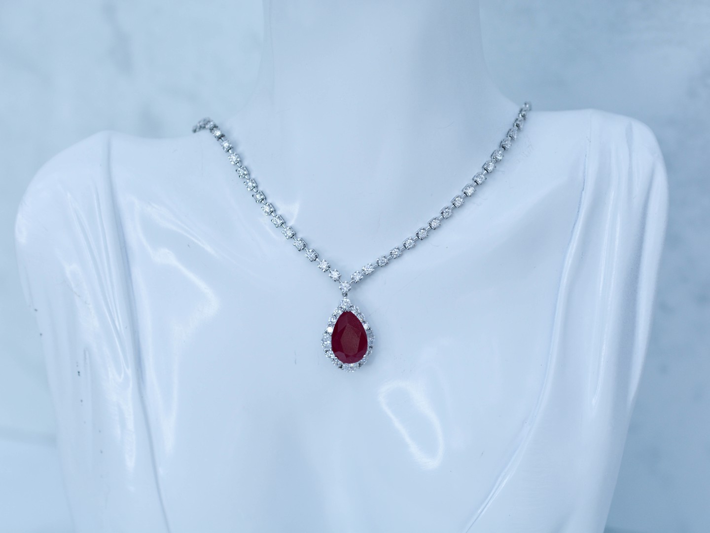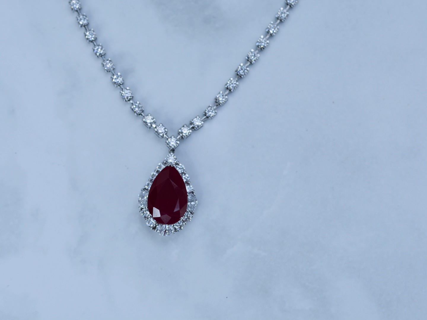 Superbe collier avec pendentif en or blanc 18 carats, orné d’un rubis ovale d’environ 8,5 carats, entouré d’une composition étincelante de 46 diamants taille brillant et 3 diamants taille ovale, totalisant environ 4 carats.