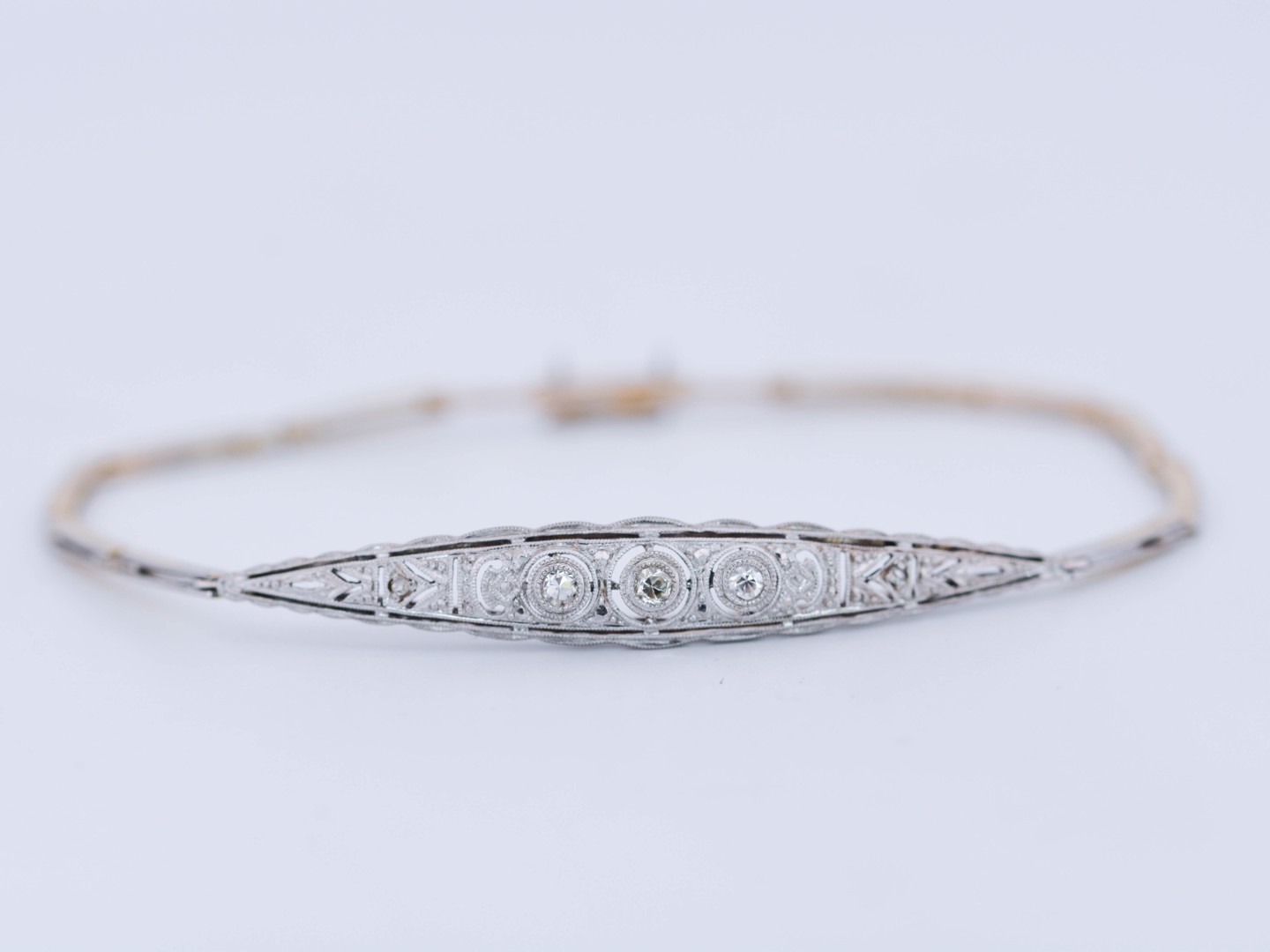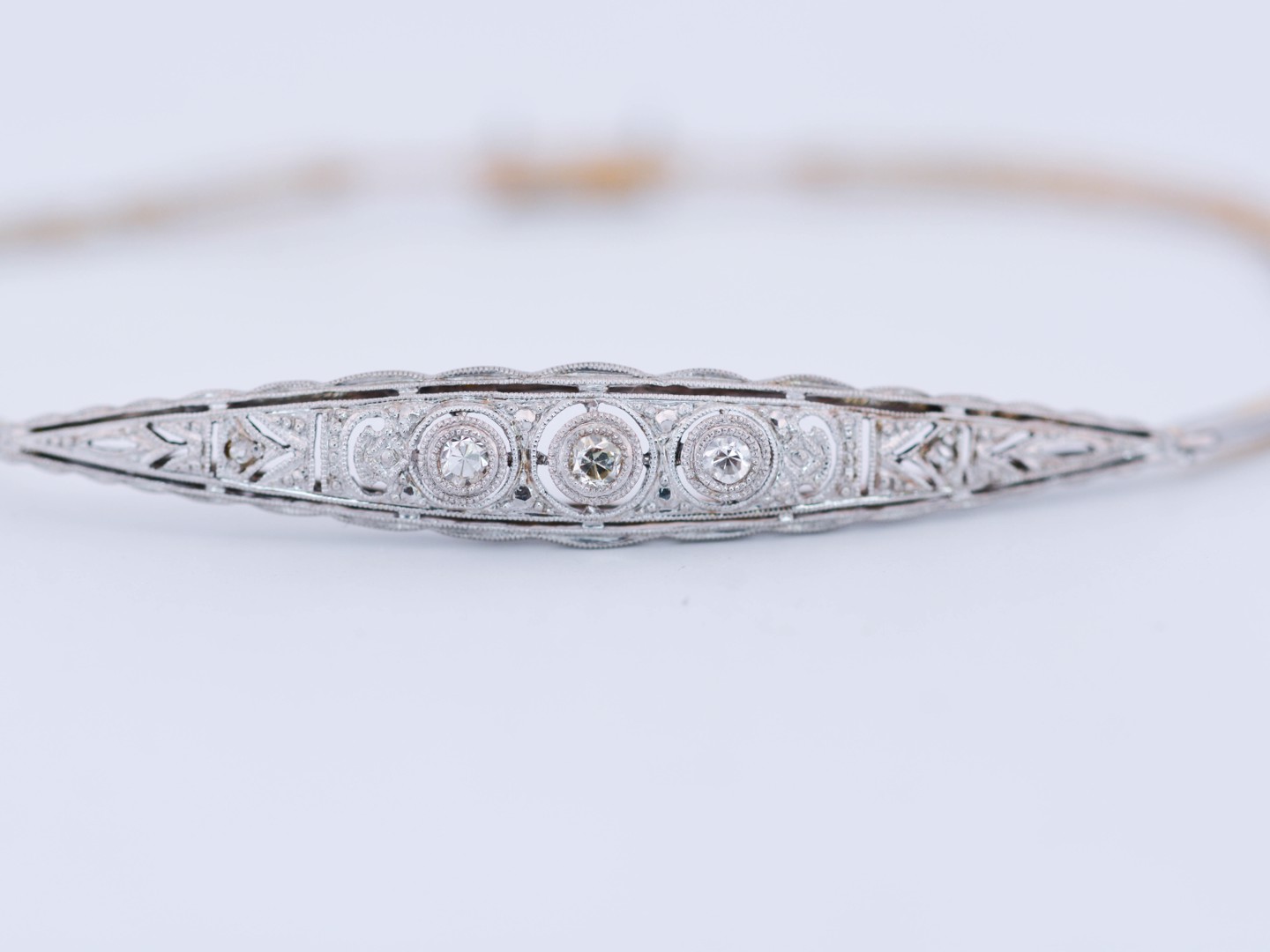 Ravissant bracelet de style victorien, datant d’environ 1880, orné de cinq diamants blancs en taille ancienne, diffusant une lumière douce et romantique typique de l’époque.