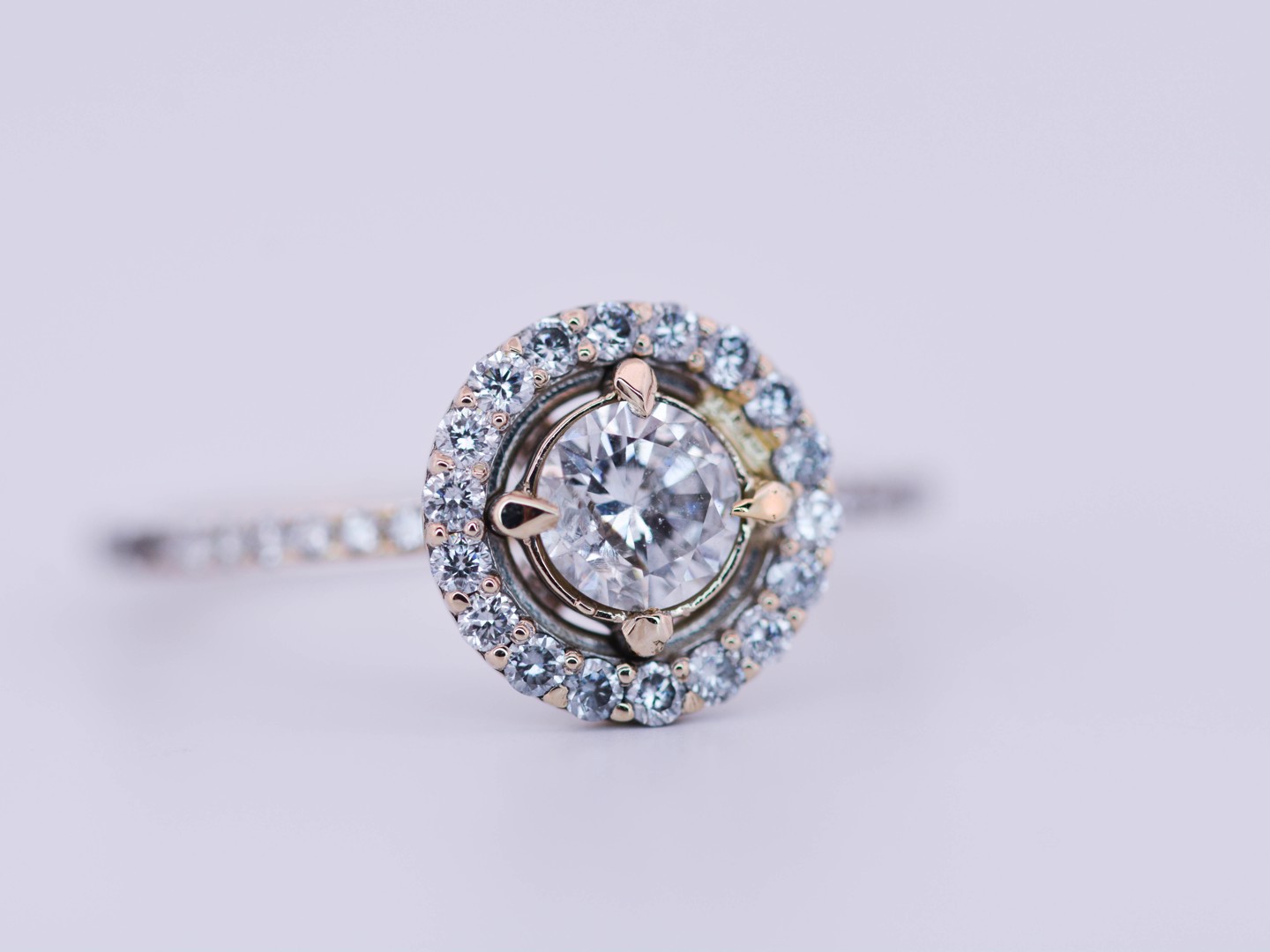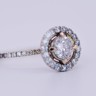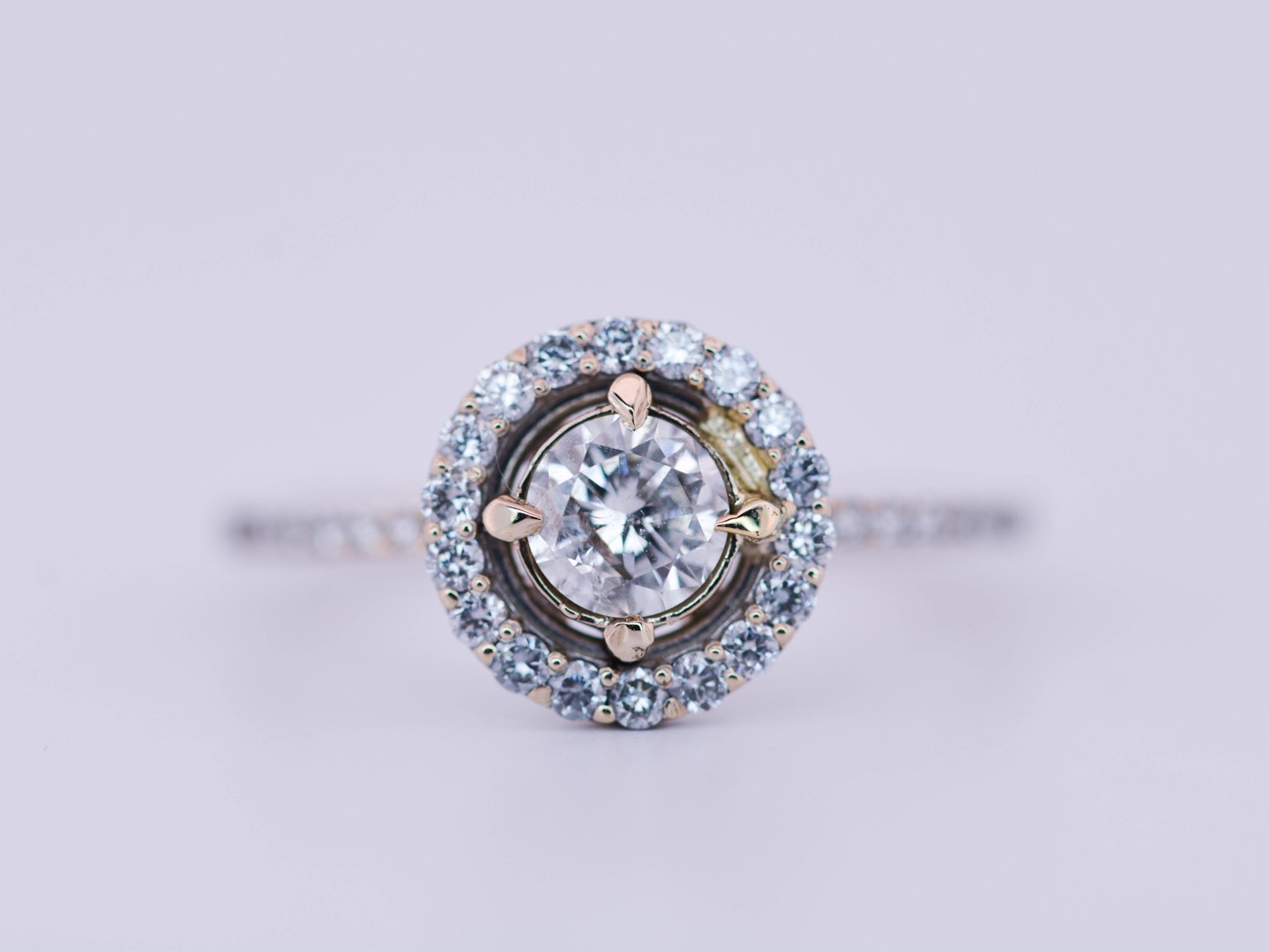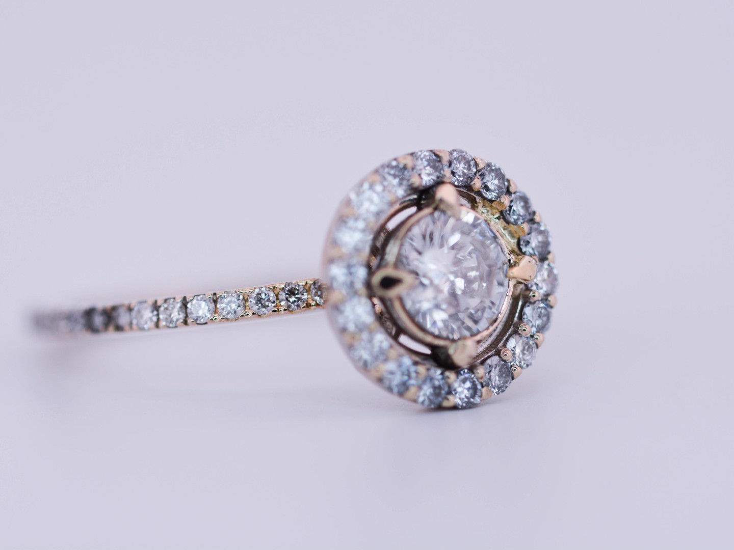 Le diamant est entouré de 54 petits diamants taille brillant, totalisant environ 0,50 carat, également de couleur I et de pureté SI, pour une brillance harmonieuse et raffinée.