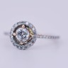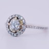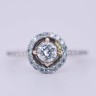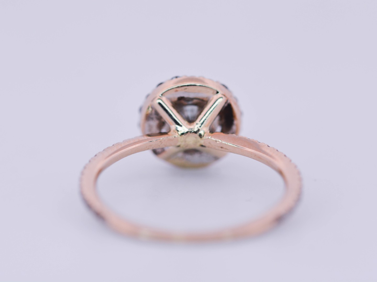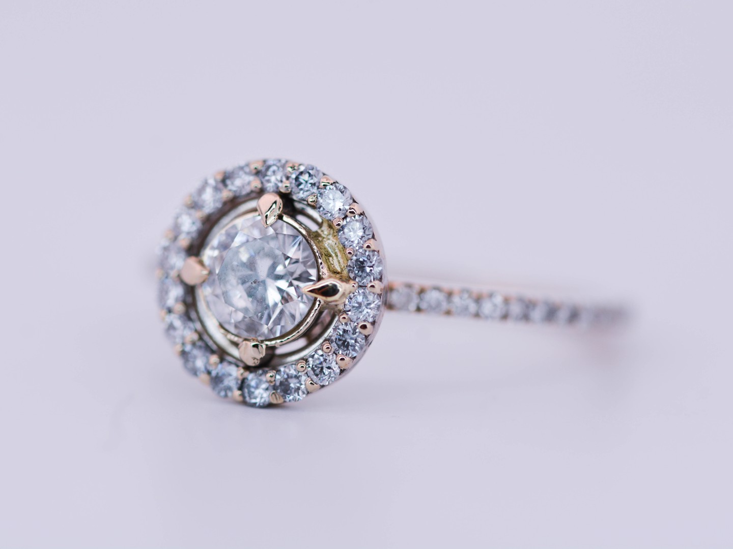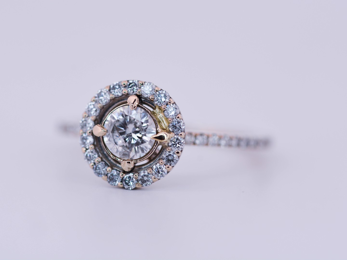 Le diamant est entouré de 54 petits diamants taille brillant, totalisant environ 0,50 carat, également de couleur I et de pureté SI, pour une brillance harmonieuse et raffinée.