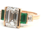 Une bague pleine de charme, dominée par un superbe diamant taille émeraude d’environ 2,20 carats, affichant une belle teinte E–F et une clarté SI. Cette pierre centrale est élégamment accompagnée de deux diamants blancs taille émeraude d’environ 0,20 carat chacun, aux nuances lumineuses D–F et d’une pureté VS.