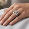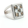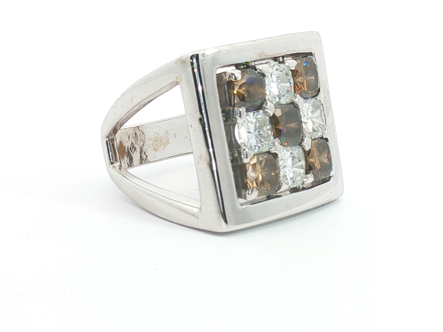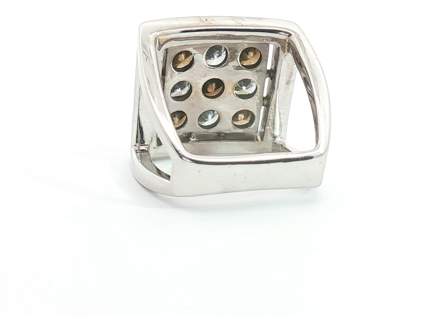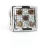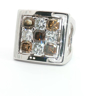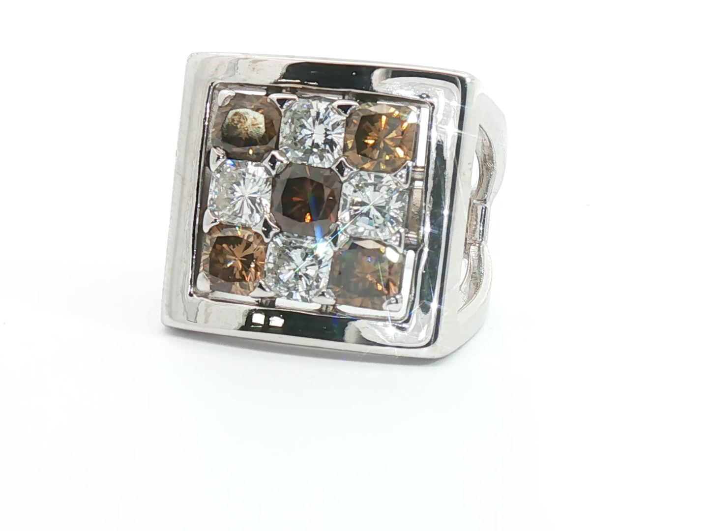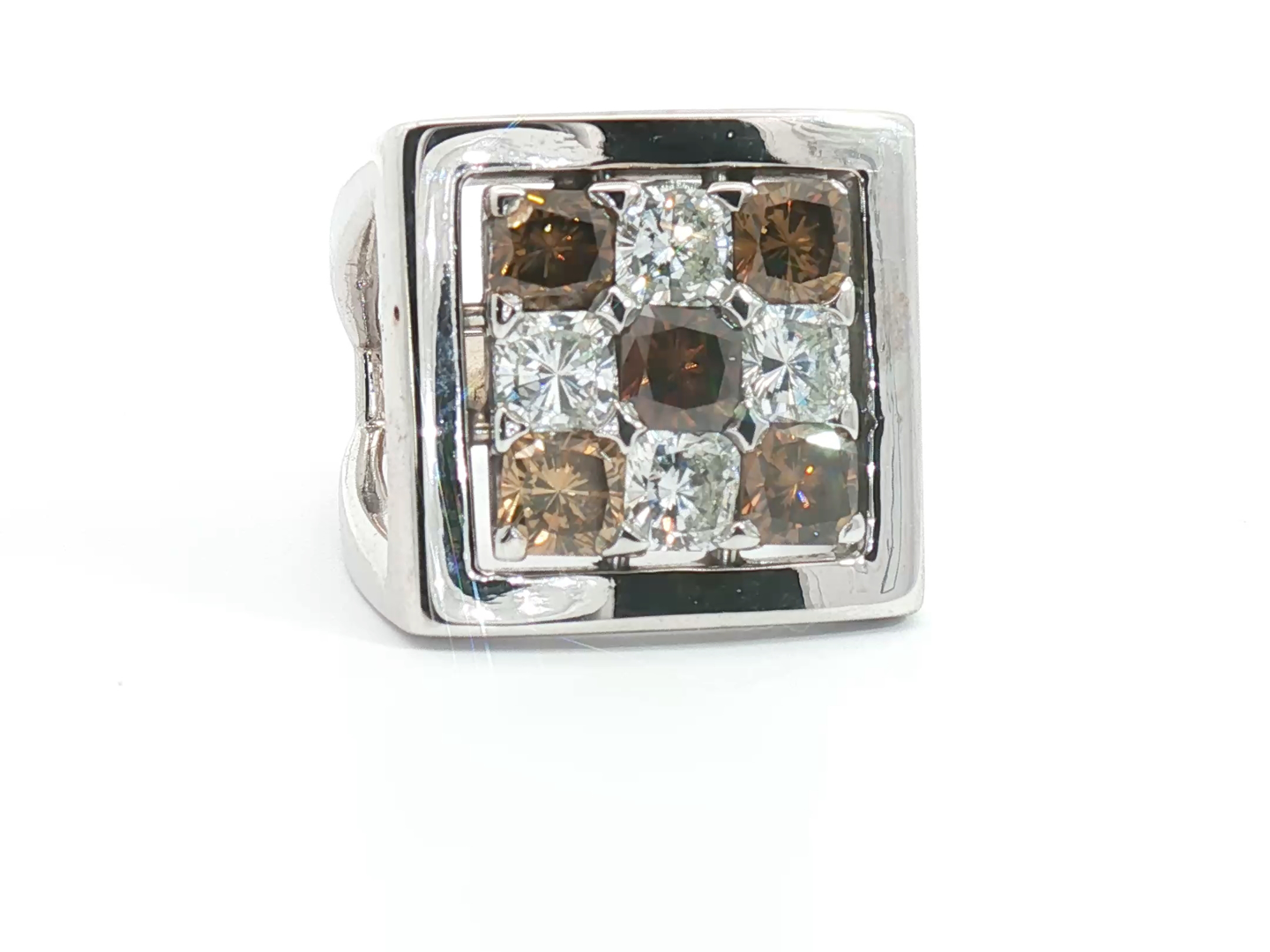 Bague exclusive du joaillier Quijo, sertie de quatre diamants blancs taille radiant d'environ 1,00ct et de cinq diamants brownish taille radiant d'environ 1,25ct. monté en or blanc 18 carats bague environ 18 mm x 18 mm. Poids : 14,94 grammes