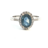 Bague élégante ornée d'un saphir +-2,00 ct, entouré de 26 brillants : +-0,52 ct, couleur : I-J et pureté : VS-SI. Montée en or blanc 18 carats (poinçon 750). Taille de bague : 51-53 et poids : +-4 grammes