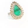 Superbe grande bague sertie d’une émeraude de qualité +-9,00 ct, vert vif transparent, entourée de 64 diamants - double entourage, taille brillant : +-1,30 ct, couleur : G-H-I et pureté : VS. Montée en or jaune 18 carats. Taille de la bague : 51 et dimensions de la bague : +-30 mm sur 23 mm