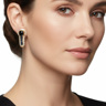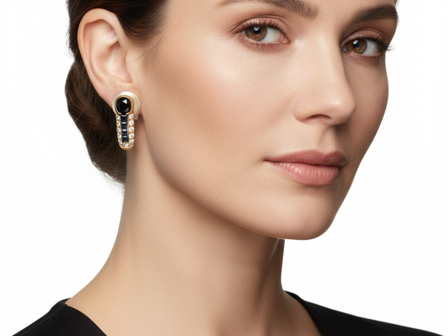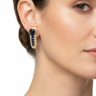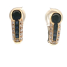 Une paire de boucles d'oreilles élégantes serties de 2 saphirs + 8 petits saphirs : +-1,20 ct, entourés de 22 petits diamants brillants : +-0,22 ct, couleur : I et pureté : VS. Montés en or jaune 18 ct (poinçon 750). Longueur de la boucle d'oreille : +-15 mm et poids : 7,1 grammes