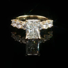 solitaire de haute qualité sertie d'un diamant taille émeraude +-3,26 carats, avec certificat GIA et inscription laser. couleur : G et pureté : VVS1, entouré de 6 brillants d'environ 1,80 carat. couleur : D-E-F et pureté : VS, monté en or jaune 18 carats (marqué 750). taille de bague : 51-55