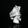 Bague exclusive de grande taille sertie d'environ 150 diamants blancs taille brillant et d'environ 220 diamants taille baguette, au total environ 6.50 carats. Couleur : F-G et pureté : VS-SI. Monture en or blanc 18 carats. Longueur : 42 mm. Poids : 17,40 grammes. Taille : 54- 56.