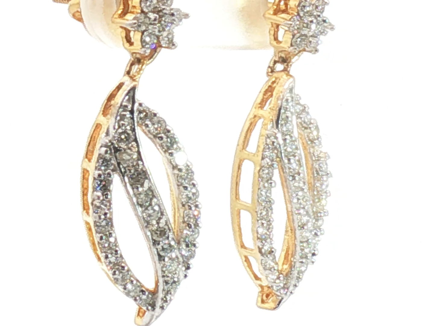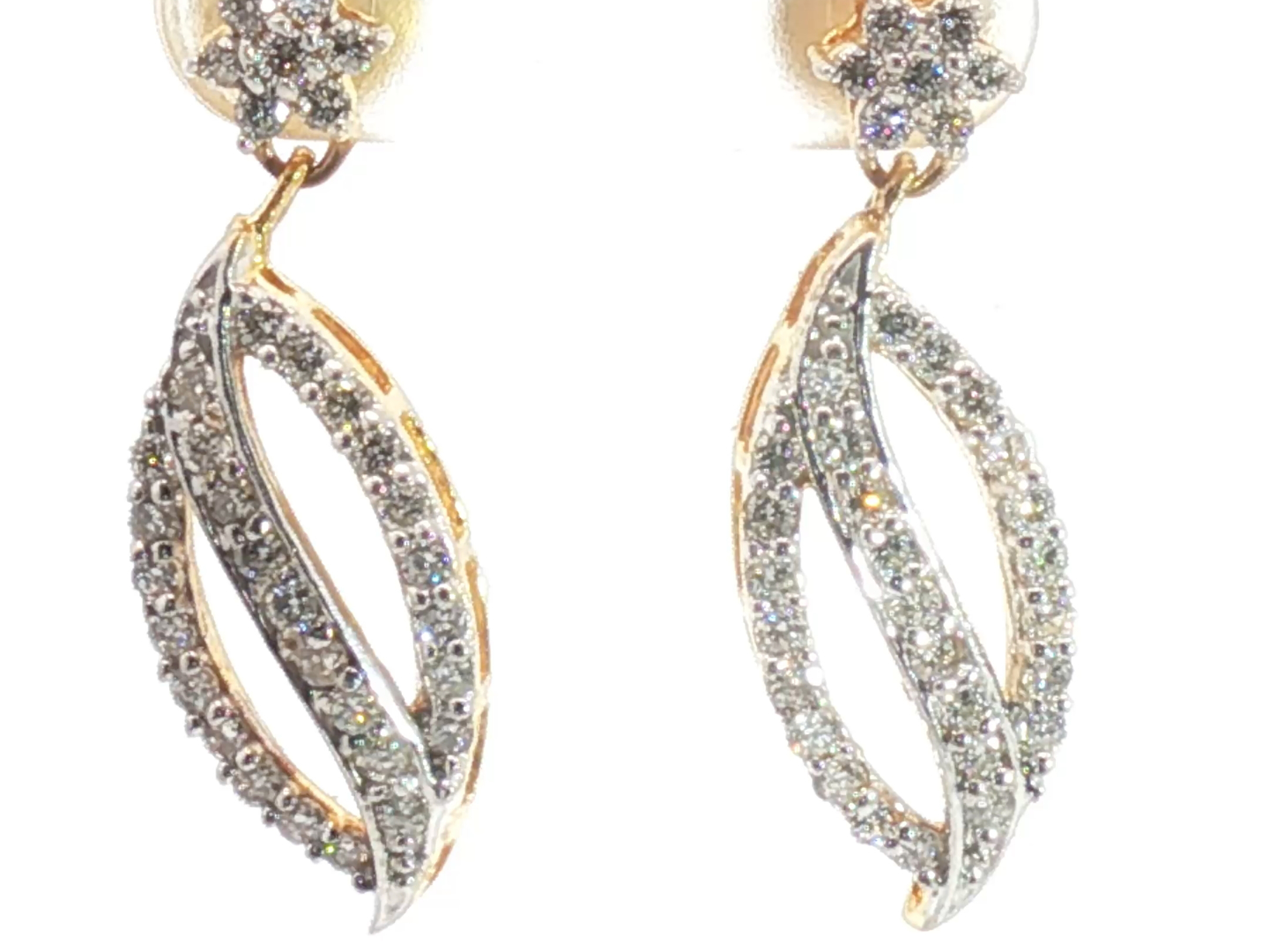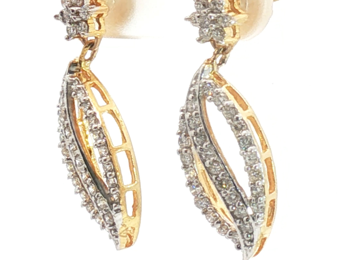 Élégantes boucles d'oreilles serties de 68 diamants blancs taille brillant couleur I et pureté VS-SI serti en or jaune et or blanc 18 carats Longueur des boucles d'oreilles : environ 28 mm.