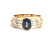 Bague élégante sertie d'un saphir de Ceylan d'environ 1.00 ct, entouré de 14 diamants taille baguette d'environ 1.00 ct. Couleur : F-G, pureté : VS. sertie en or jaune 18 carats (poinçon 750). Taille : 53-56. Poids : 7,50 grammes.