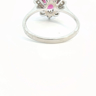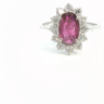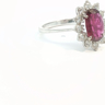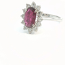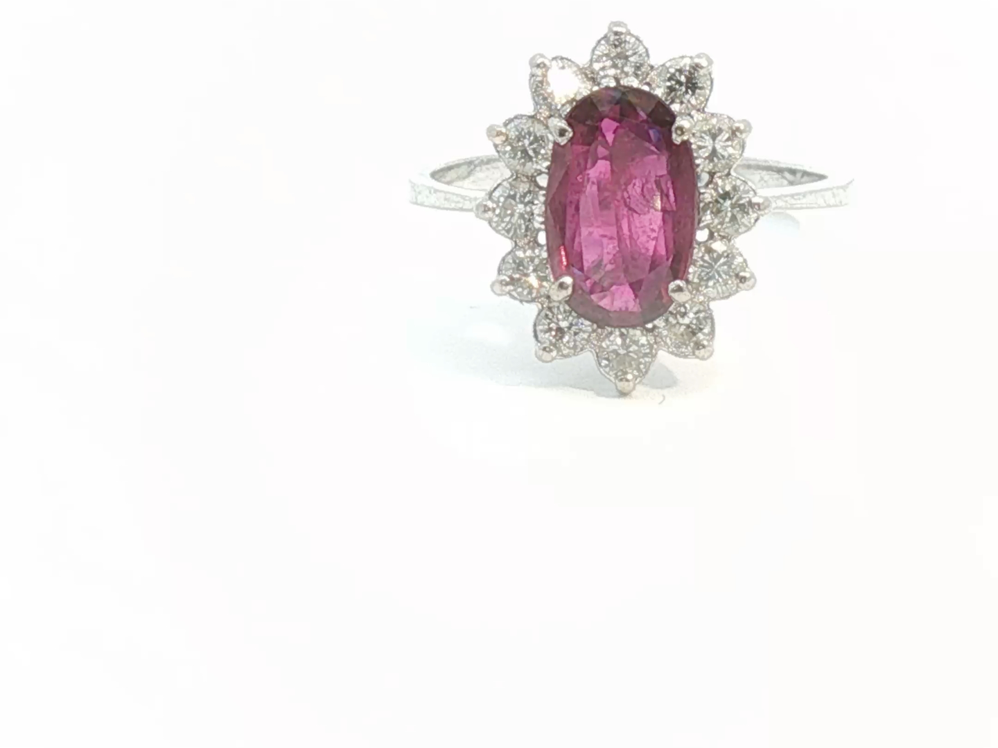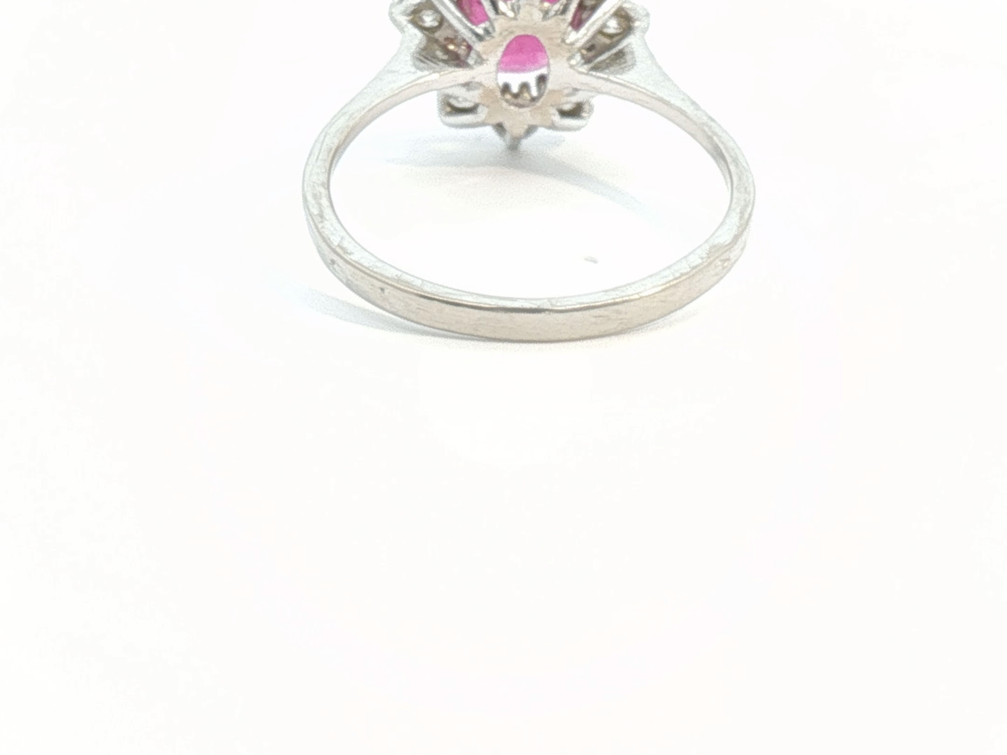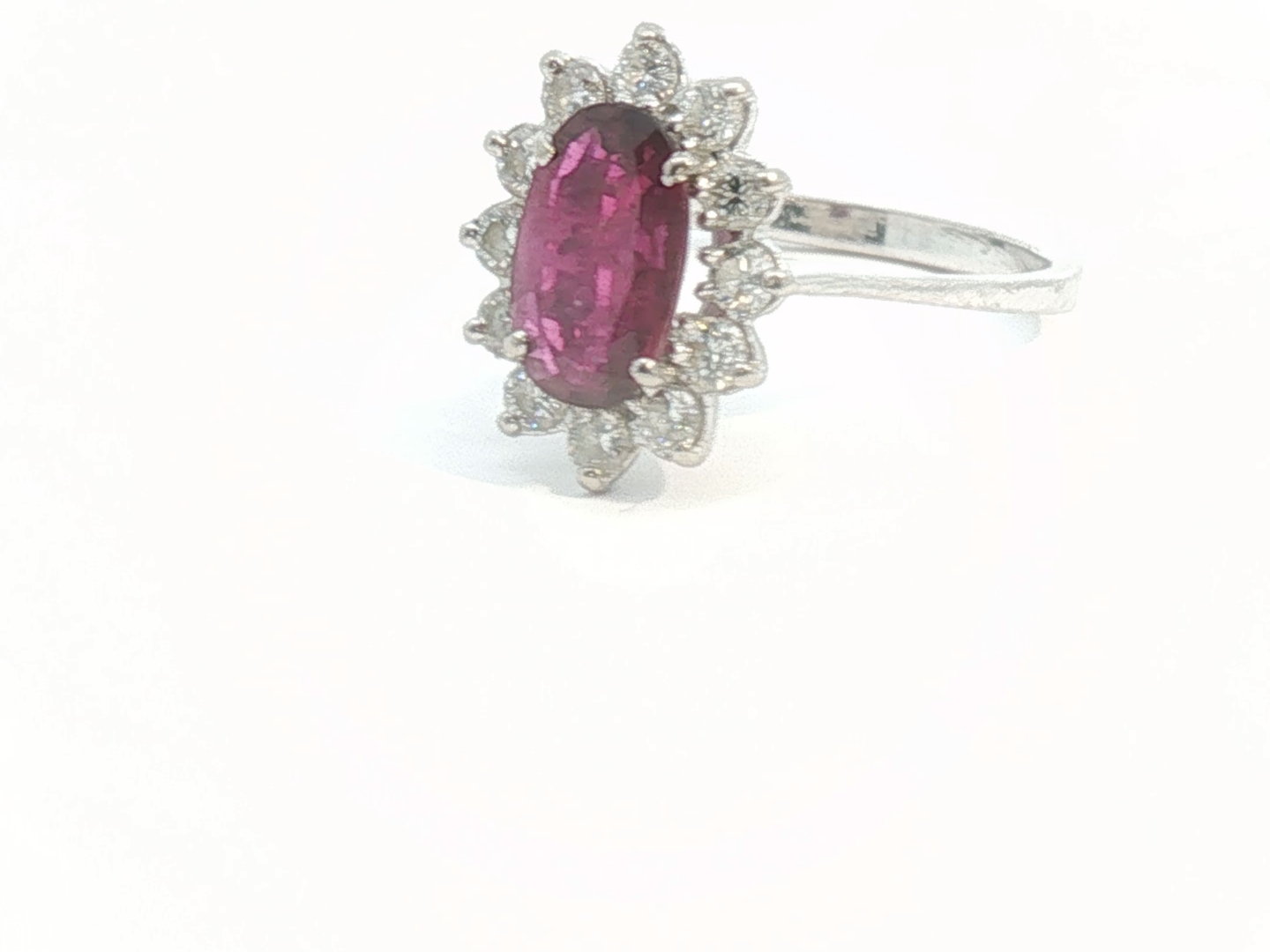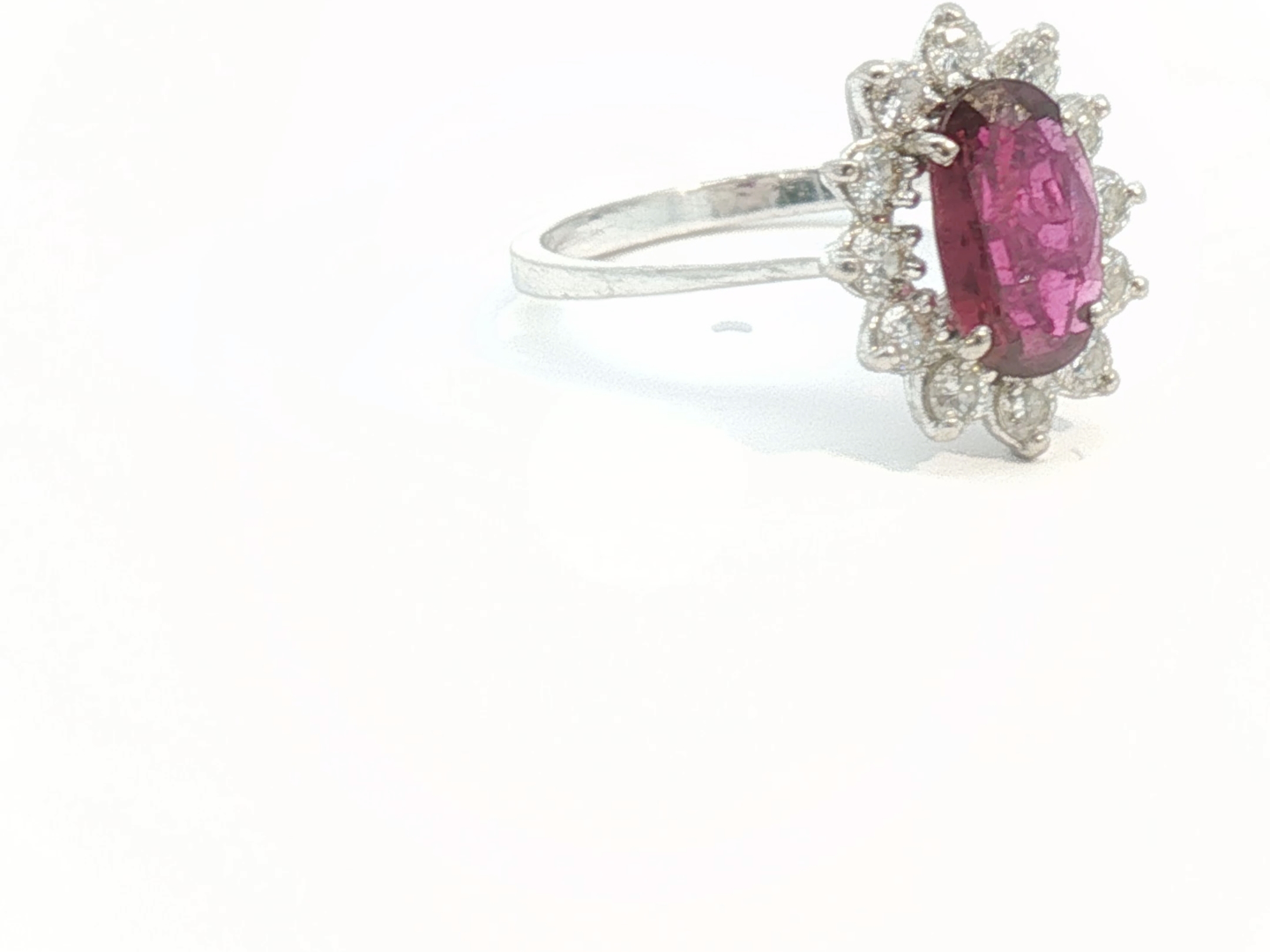 Bague élégante sertie d'un rubis d'environ 2,80 cts. entouré de 12 diamants taille brillant d'environ 1,20 ct. Couleur : F-G, pureté : VS-SI. Monture en or blanc 18 carats. Taille : 53-55. Longueur : 15 mm.