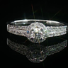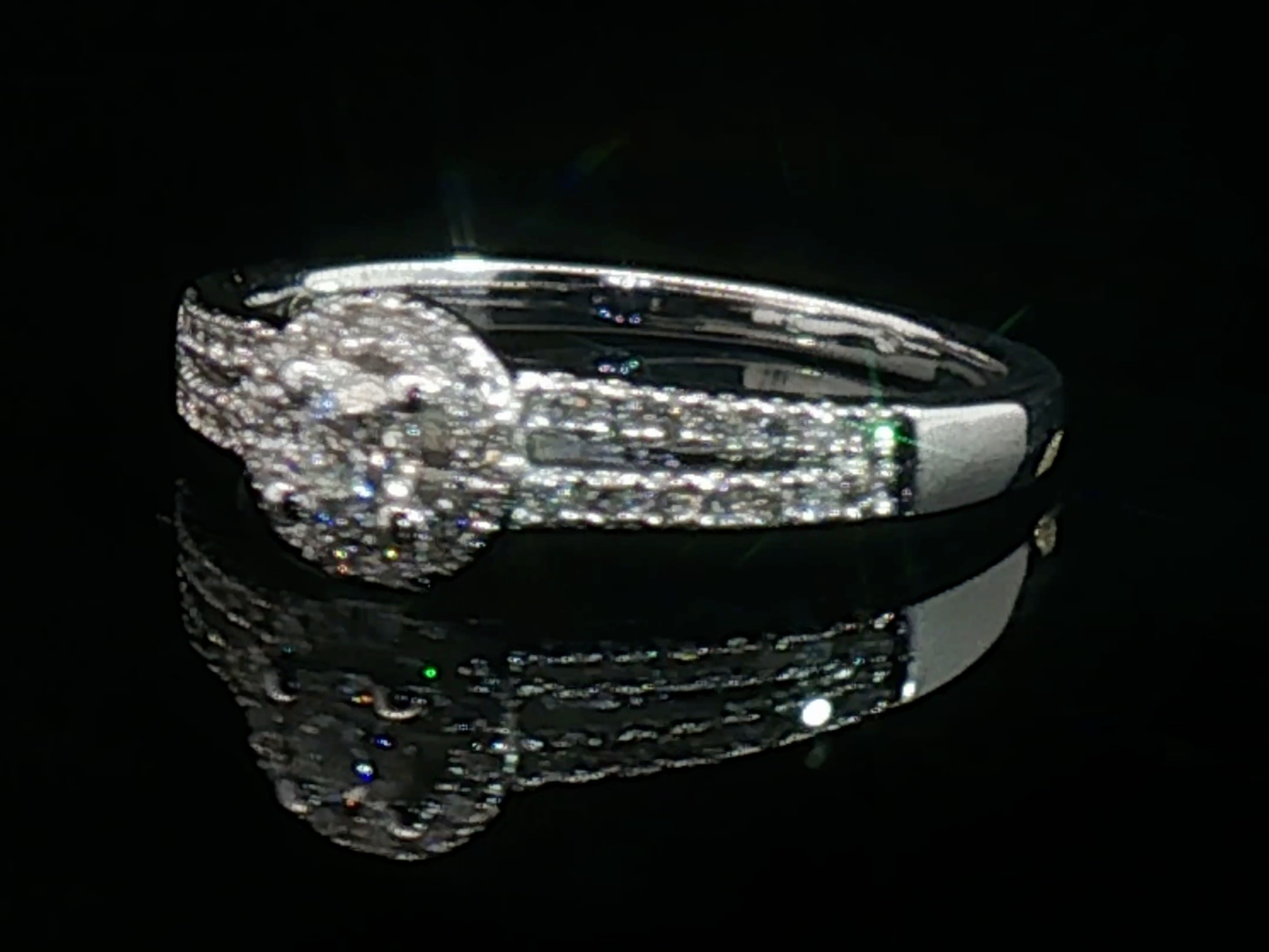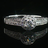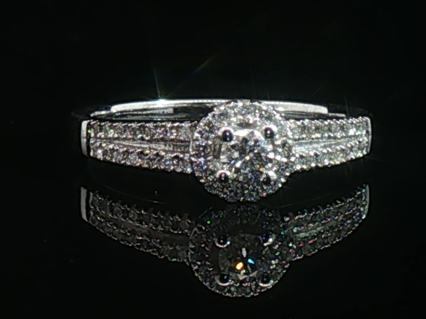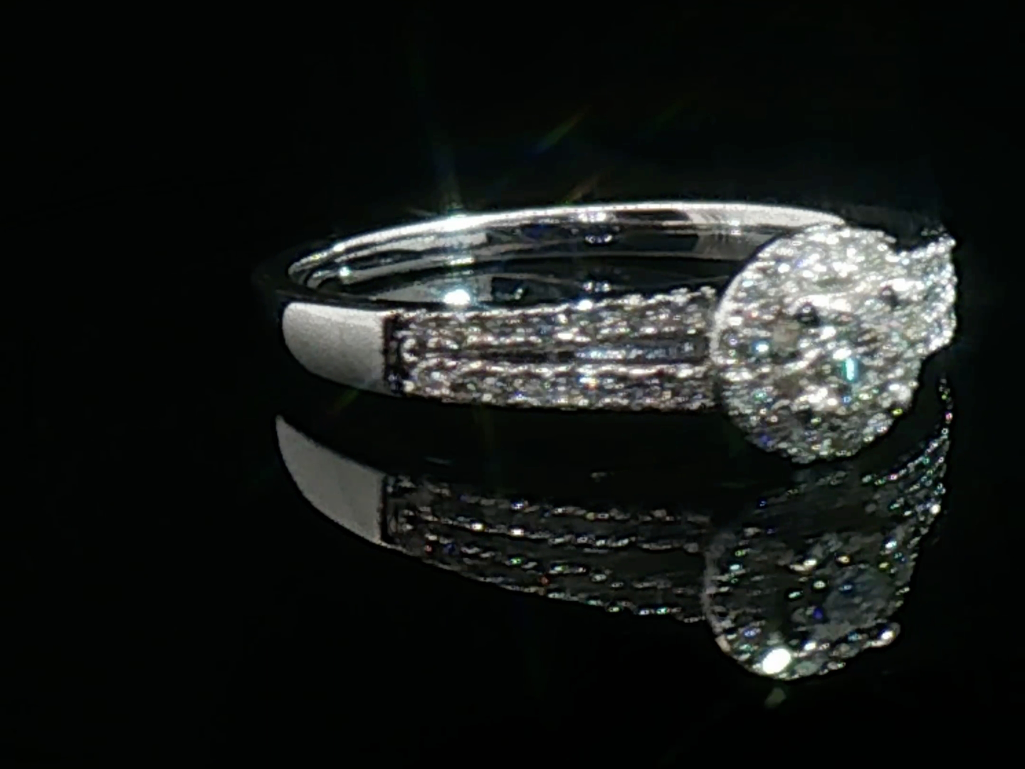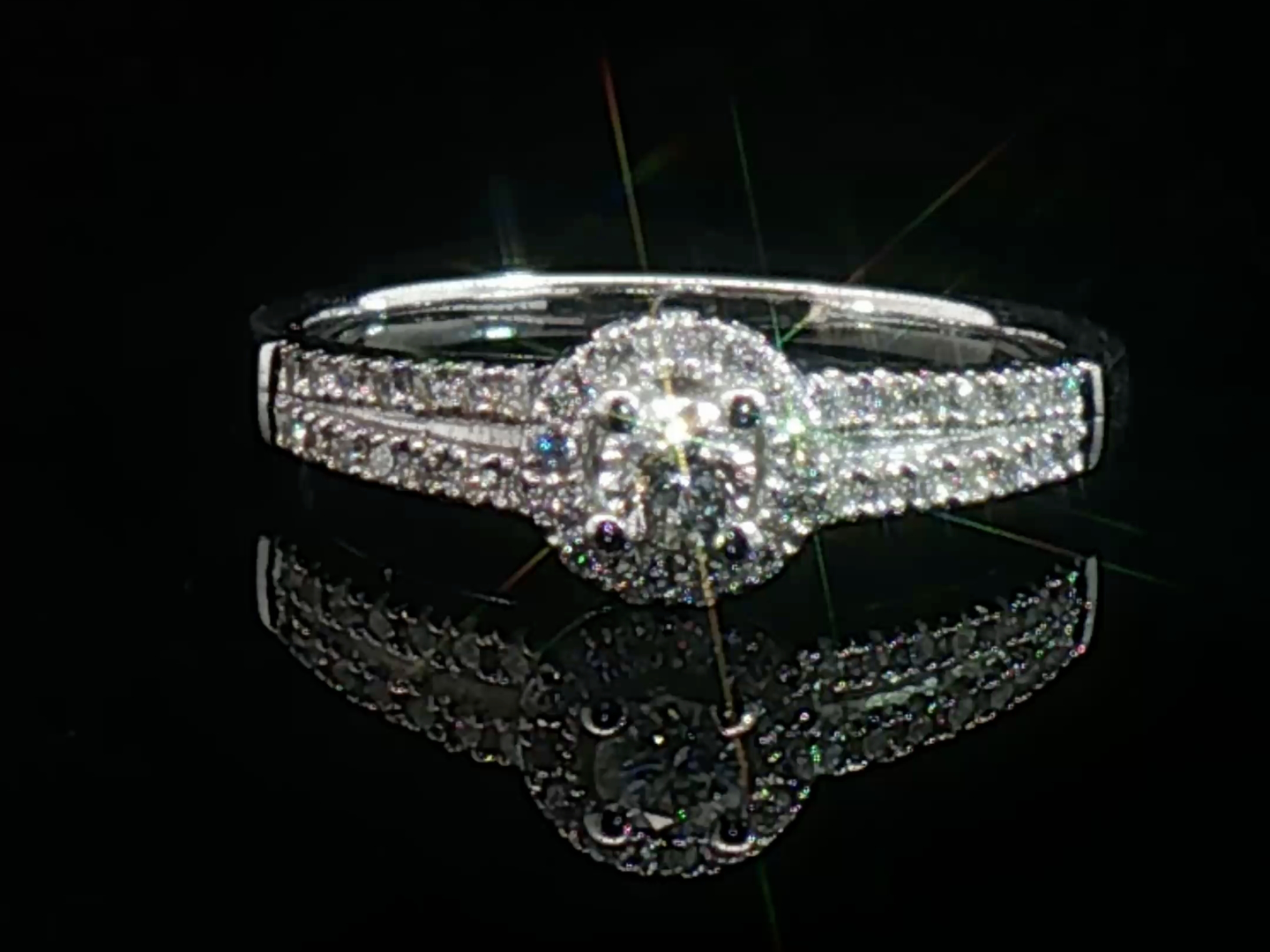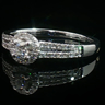 Bague élégante sertie d'un diamant taille brillant de 0,25 carat entouré de 30 diamants taille brillant 0,30 carat. Couleur : F-G, pureté : VS-SI. Monture en or blanc 18 carats (poinçon 750). Taille: 53- 56. Poids : 4,05 grammes.