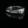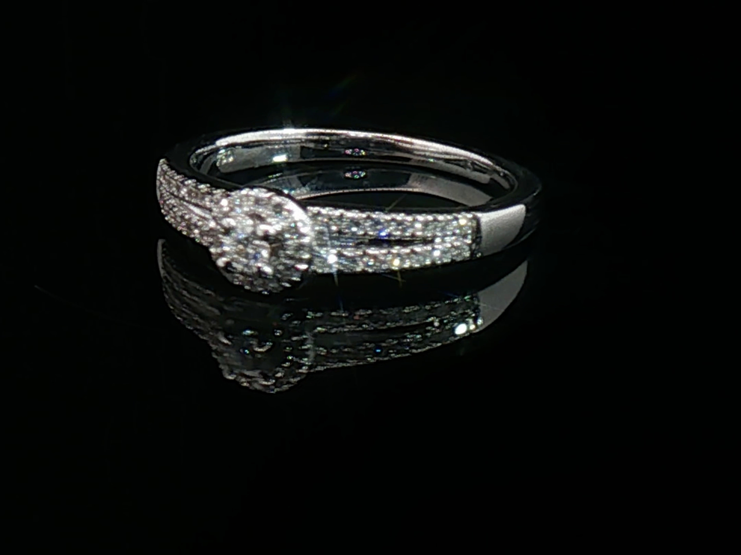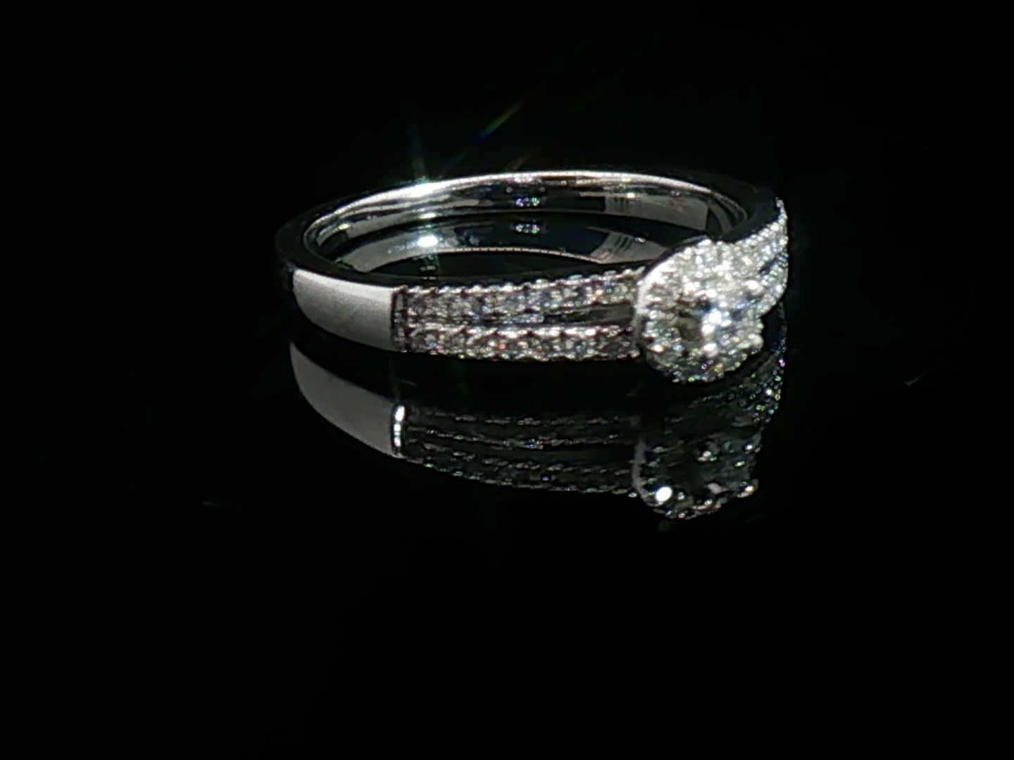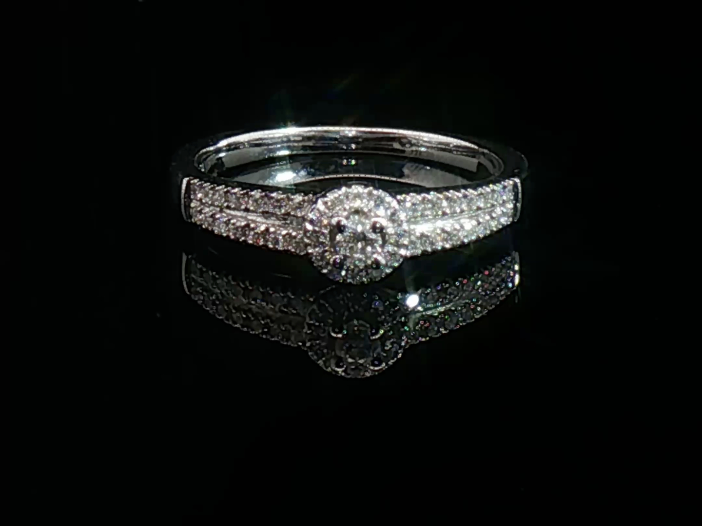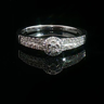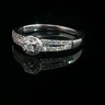 Bague élégante sertie d'un diamant taille brillant de 0,10 carat entouré de 40 diamants taille brillant 0,40 carat. Couleur : G-H, pureté : SI. Monture en or blanc 18 carats (poinçon 750). Taille: 51-54. Poids : 3,85 grammes.