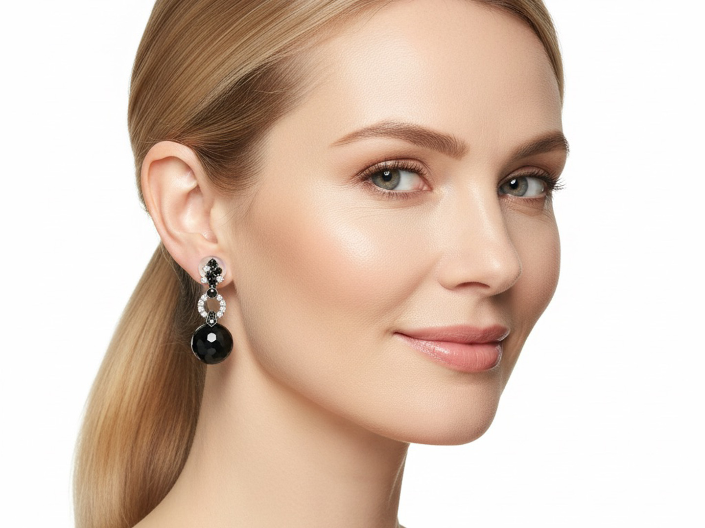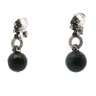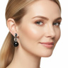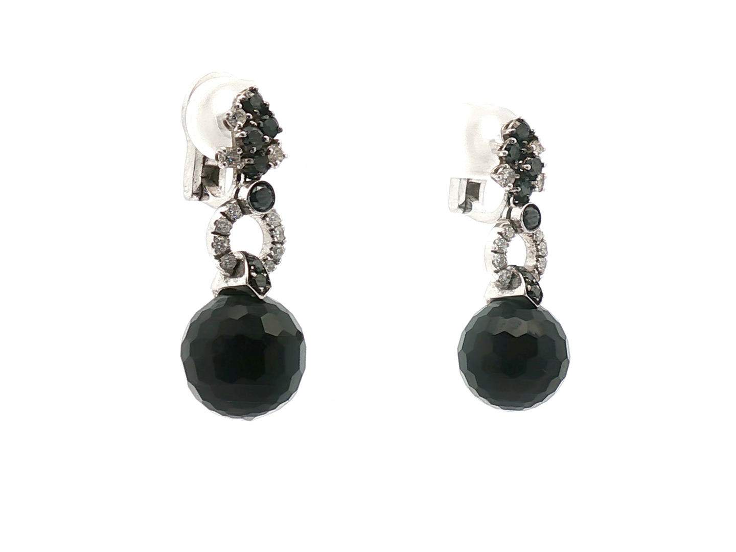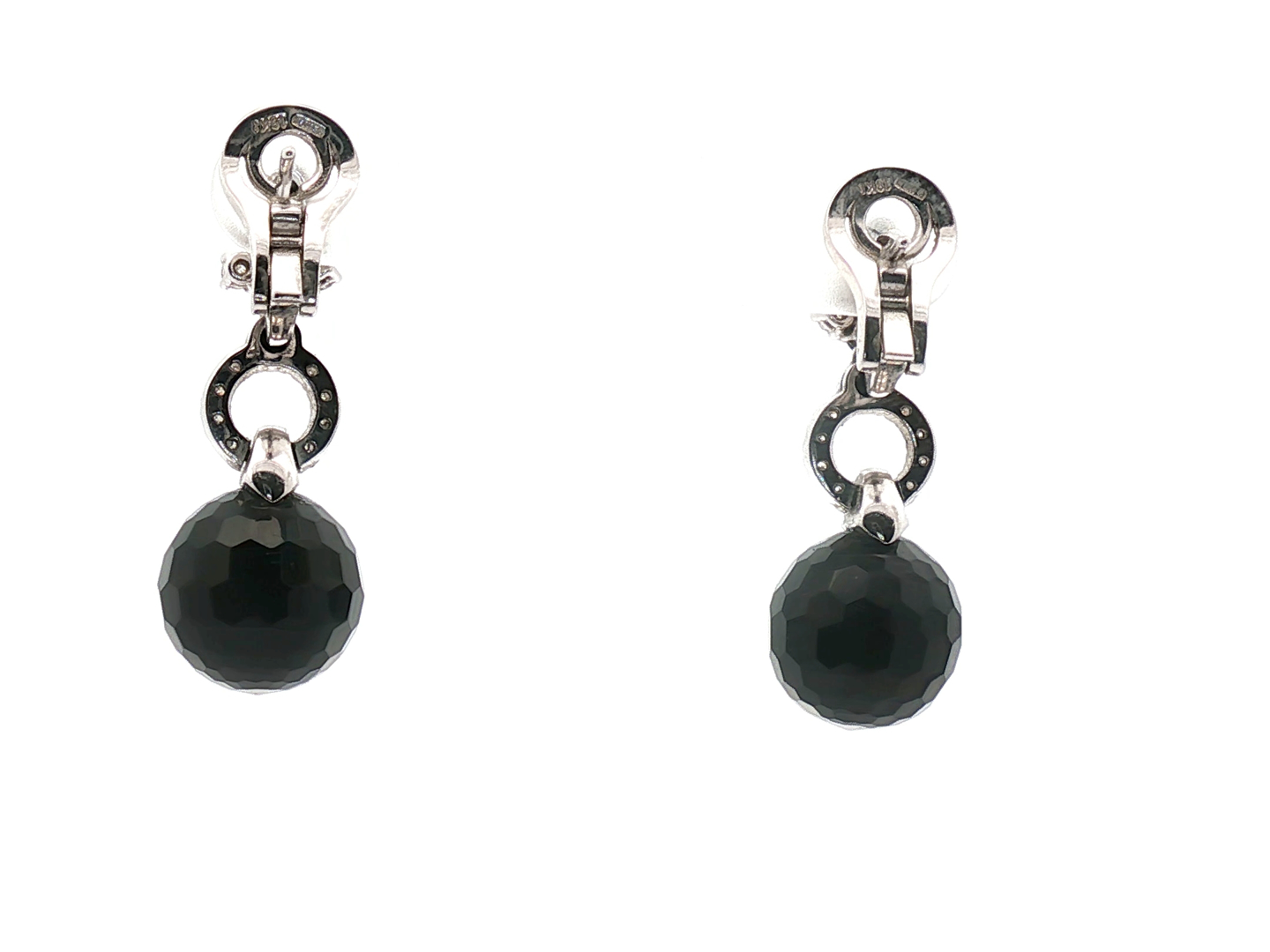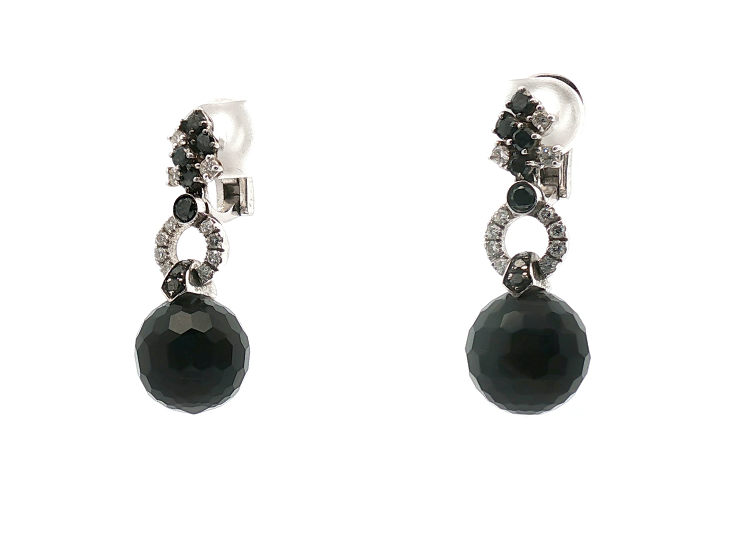 Paire de boucles d'oreilles élégantes ornées de 2 boules d'onyx + 22 diamants : +-0,50 ct + 10 pierres d'onyx