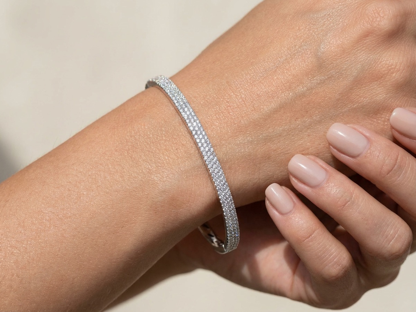 Bracelet de qualité pour homme orné de 3 rangées de diamants blancs, taille brillant, +-210 brillants : ±2,10 ct, couleur : D-E-F blanc exceptionnel et pureté : VS-SI. Monté en or blanc 18 carats. Poids : ±18,5 grammes et dimensions intérieures : ±65 mm sur 54 mm