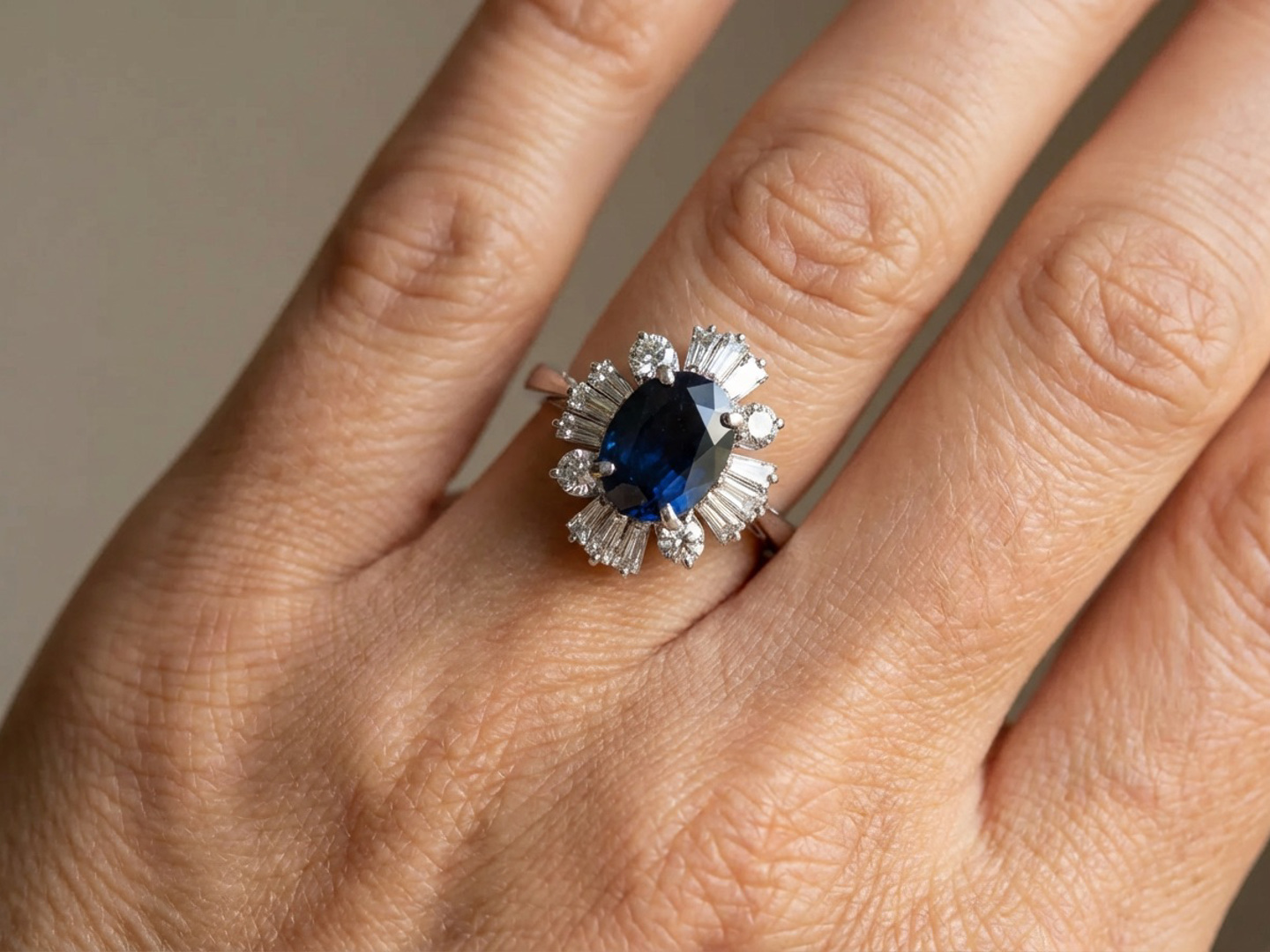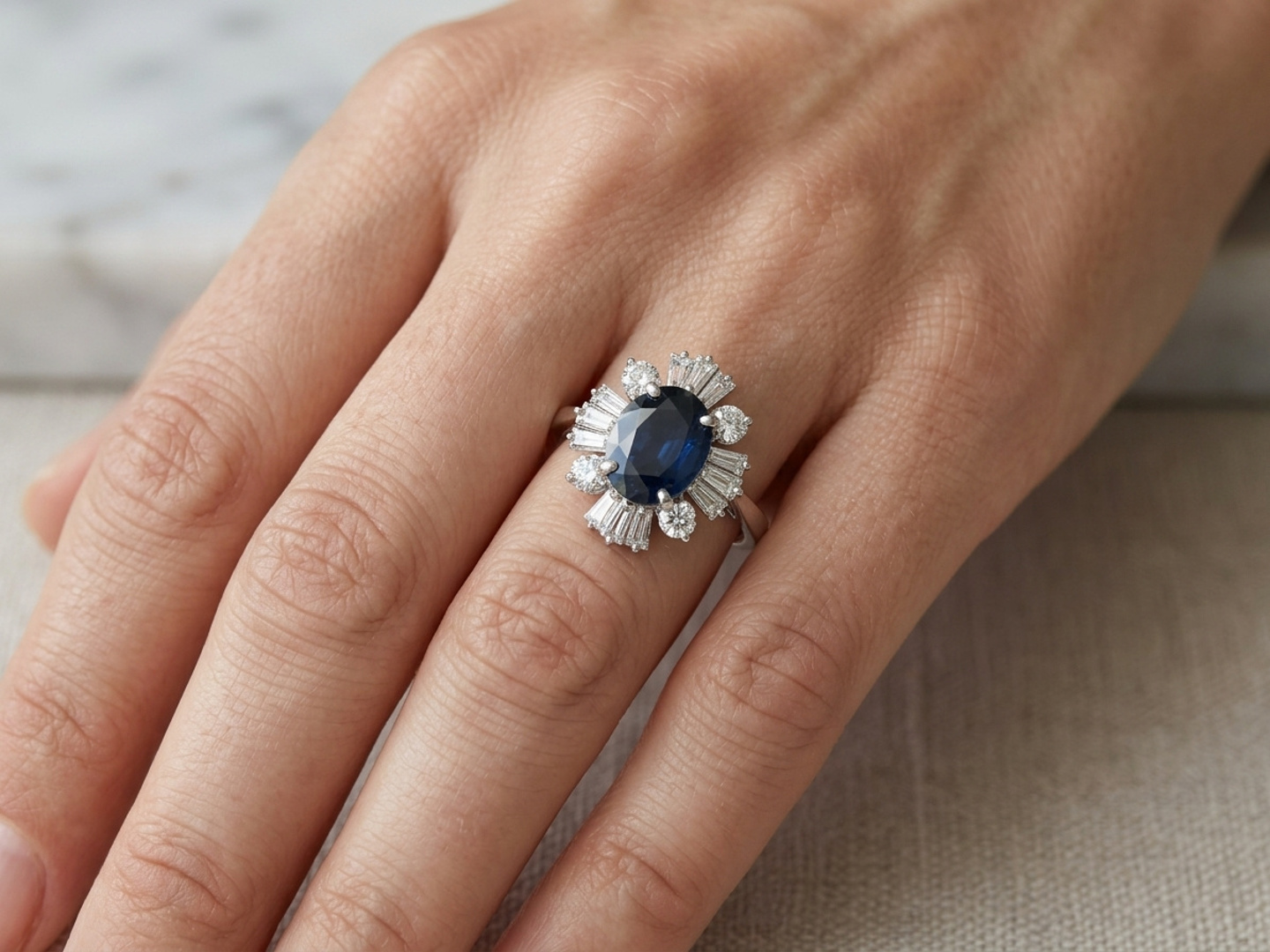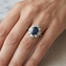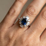 Une seule bague ornée d'un saphir de +-3,00 ct, entourée de 16 diamants blancs - 4 taille brillant + 12 taille trapèze, total : +-2,00 ct, couleur : D-E-F-blanc exceptionnel et pureté : VS-SI. Montée sur or blanc 18 carats. Taille de bague : 58-61 et dimensions de la bague : +-18 mm sur 14 mm