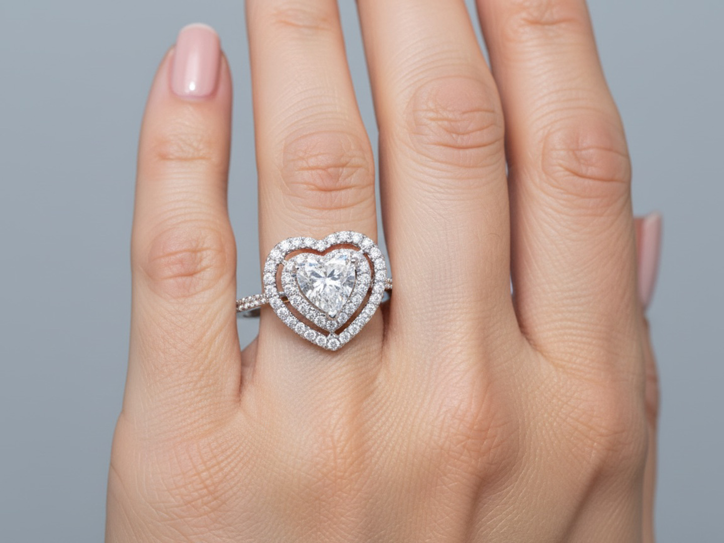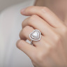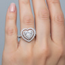 Bague or blanc 18ct. (poinçon 750) serti d'un diamant forme de coeur de 1.02ct. couleur: E et pureté: VS2 + autoure 62 brillants 0.40ct. couleur: F-G et pureté: VS (certificat de HRD-Anvers) taille:53-54