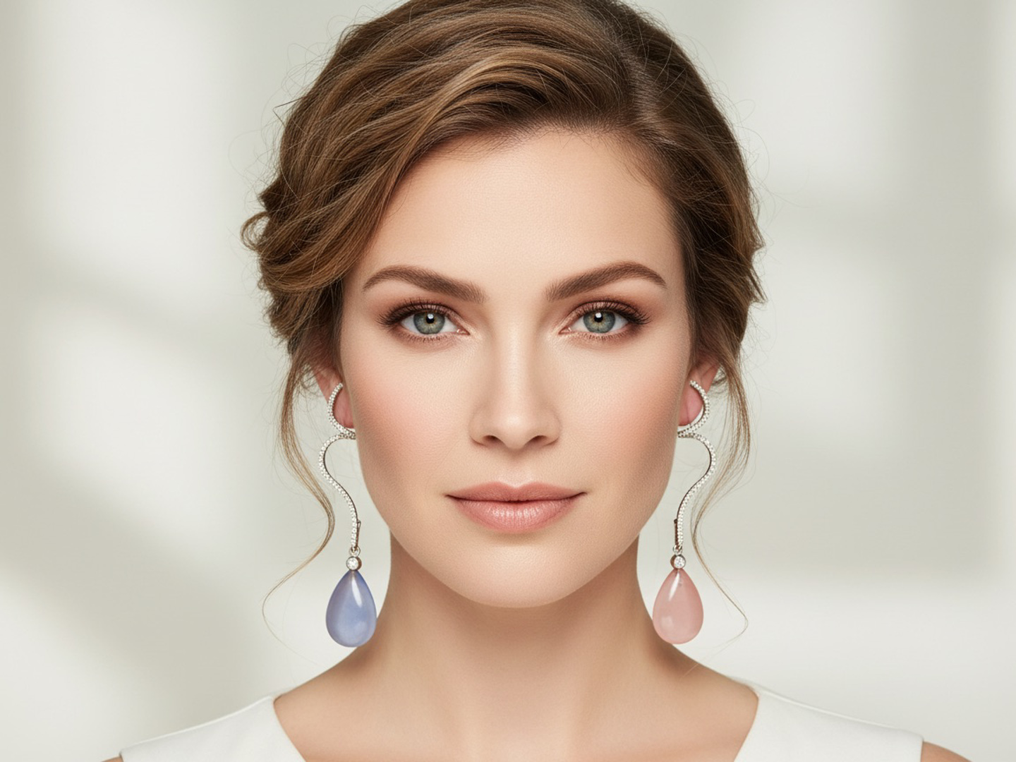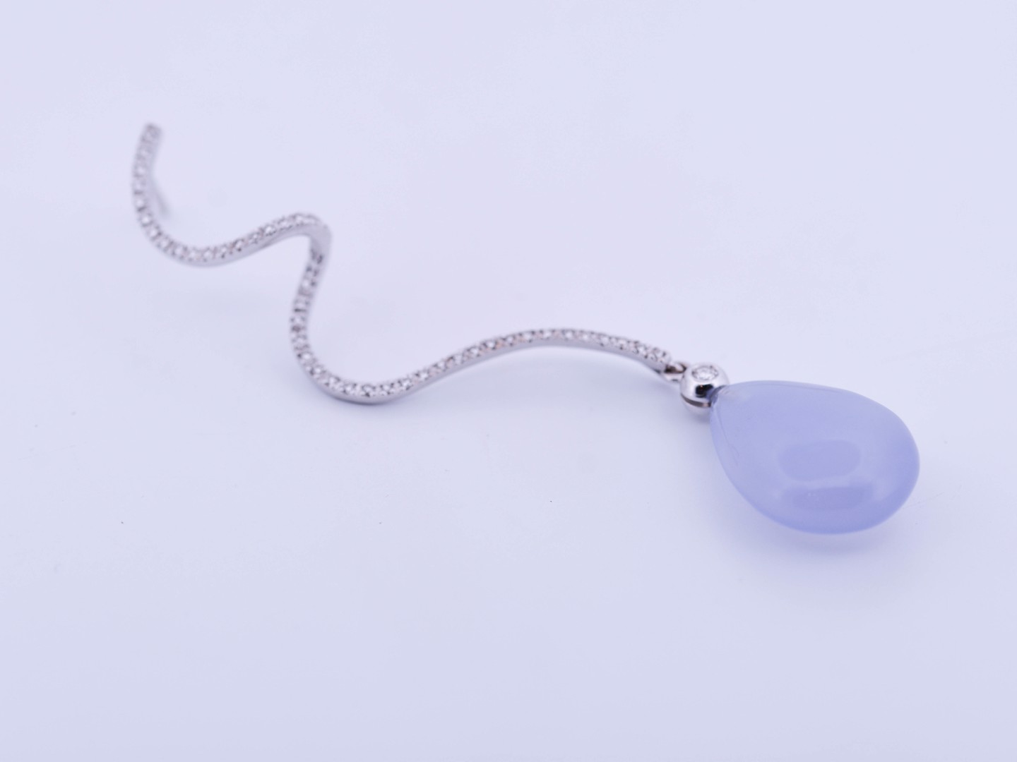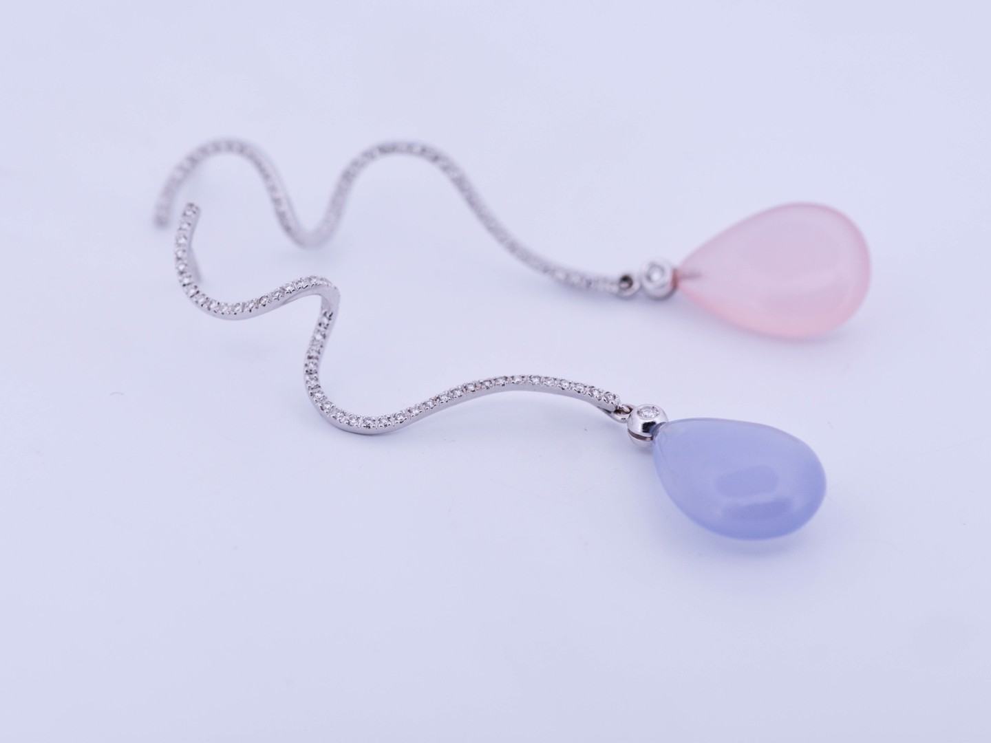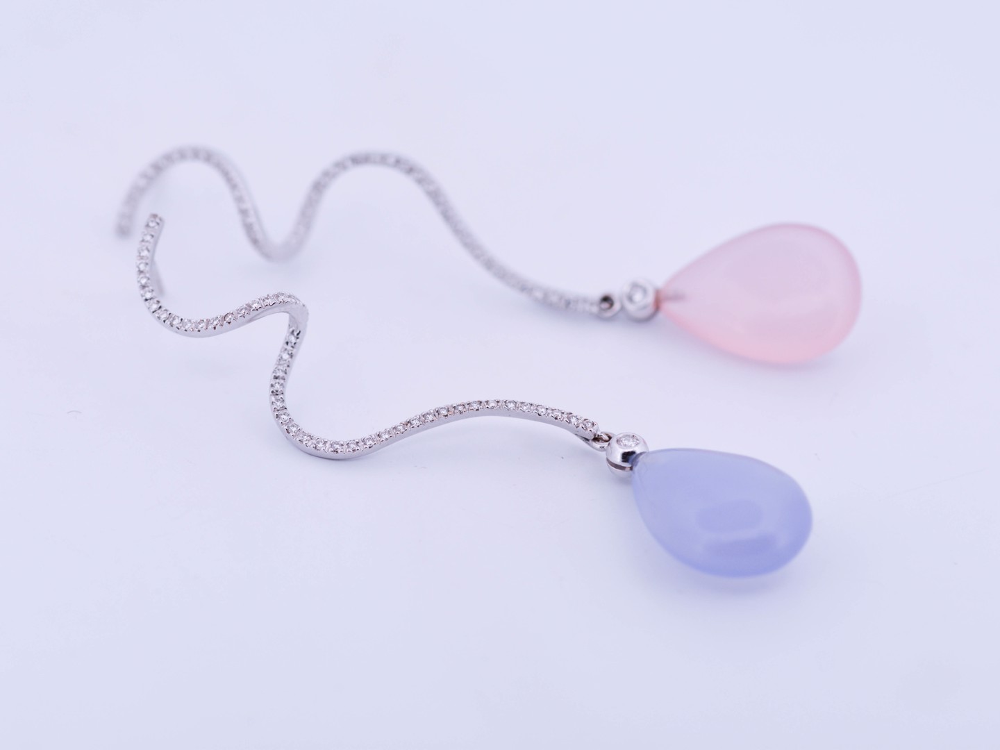 paire de longues boucles d’oreilles avec light rose quartz + light blue quartz agrémentée de 120 brillants +- 1.20ct.