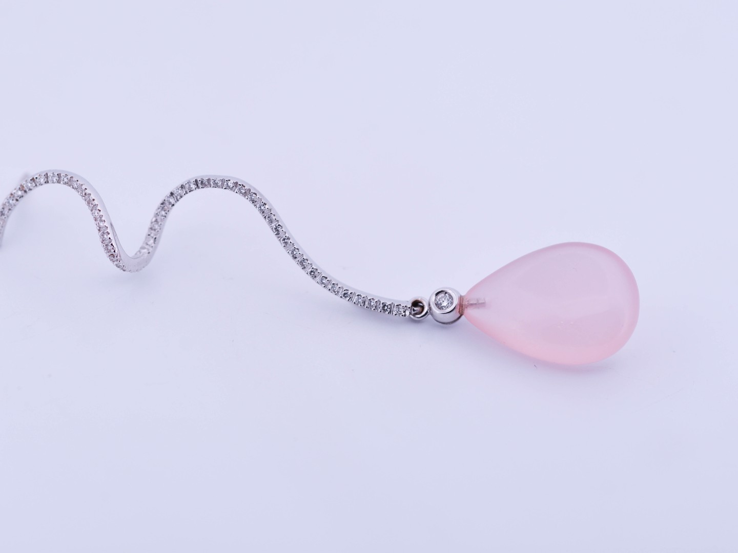 Paire de longues boucles d’oreilles avec light rose quartz + light blue quartz agrémentée de 120 brillants +- 1.20ct. couleur: F-G et pureté: VS monté en or blanc 18ct. longueur: 75 mm.