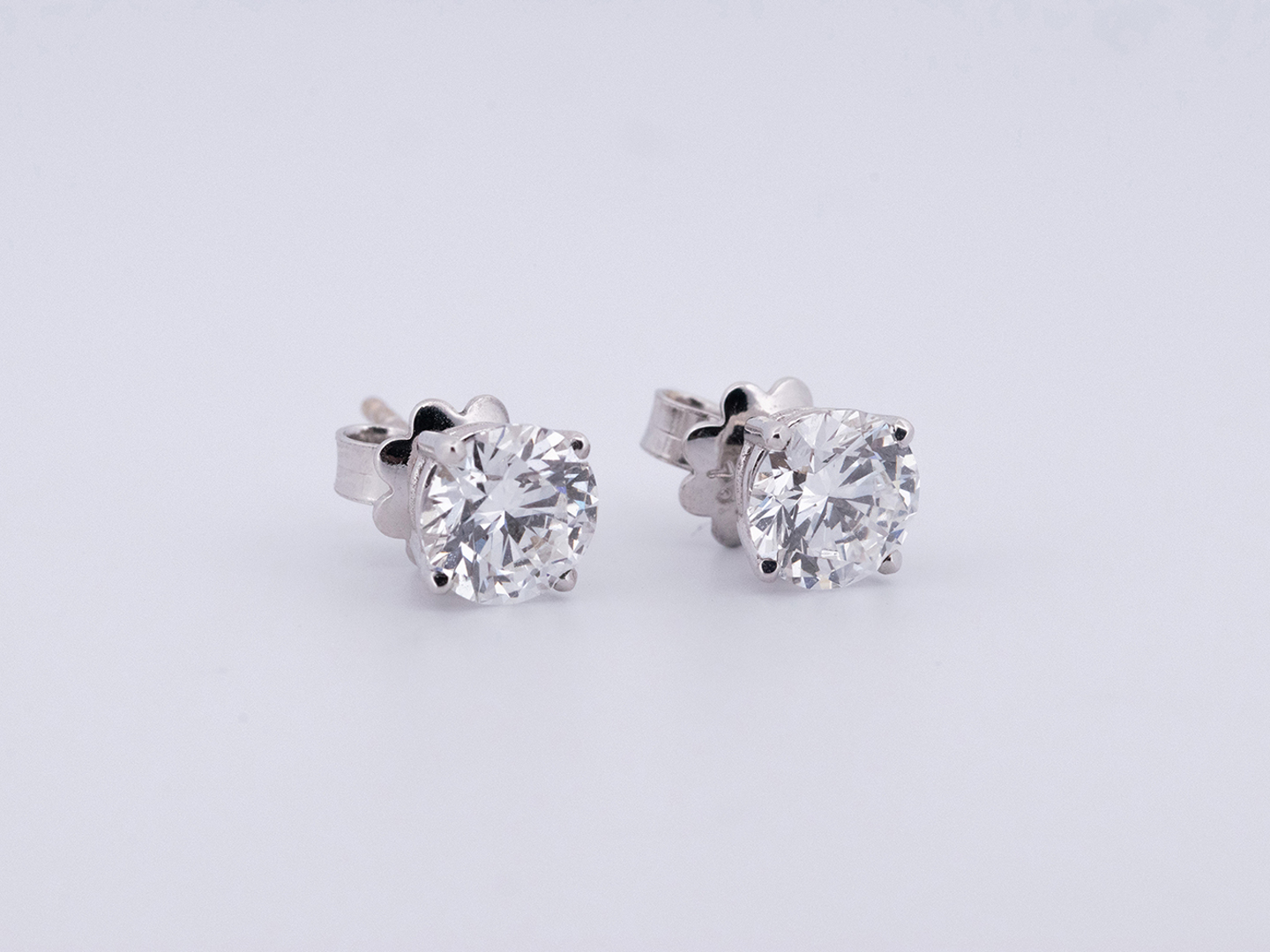 Paire de boucles d’oreilles de qualité-solitaire avec 2 brillants au total: +- 2.20cts. couleur: F-G et pureté: VS diamètre: +- 6.70 mm. entouré de 42 brillants couleur: D-F et pureté: VS monté en or blanc 18ct. (poinçon 750)
