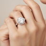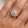 Bague sertie d'un diamant de qualité avec 1 diamant de : +-3.05CT, couleur : E et pureté : VS1 , entourée de 38 petits diamants, couleur : D-E-F et pureté : VS, en or blanc 18kt (marqué 750). Taille de bague : 52-54