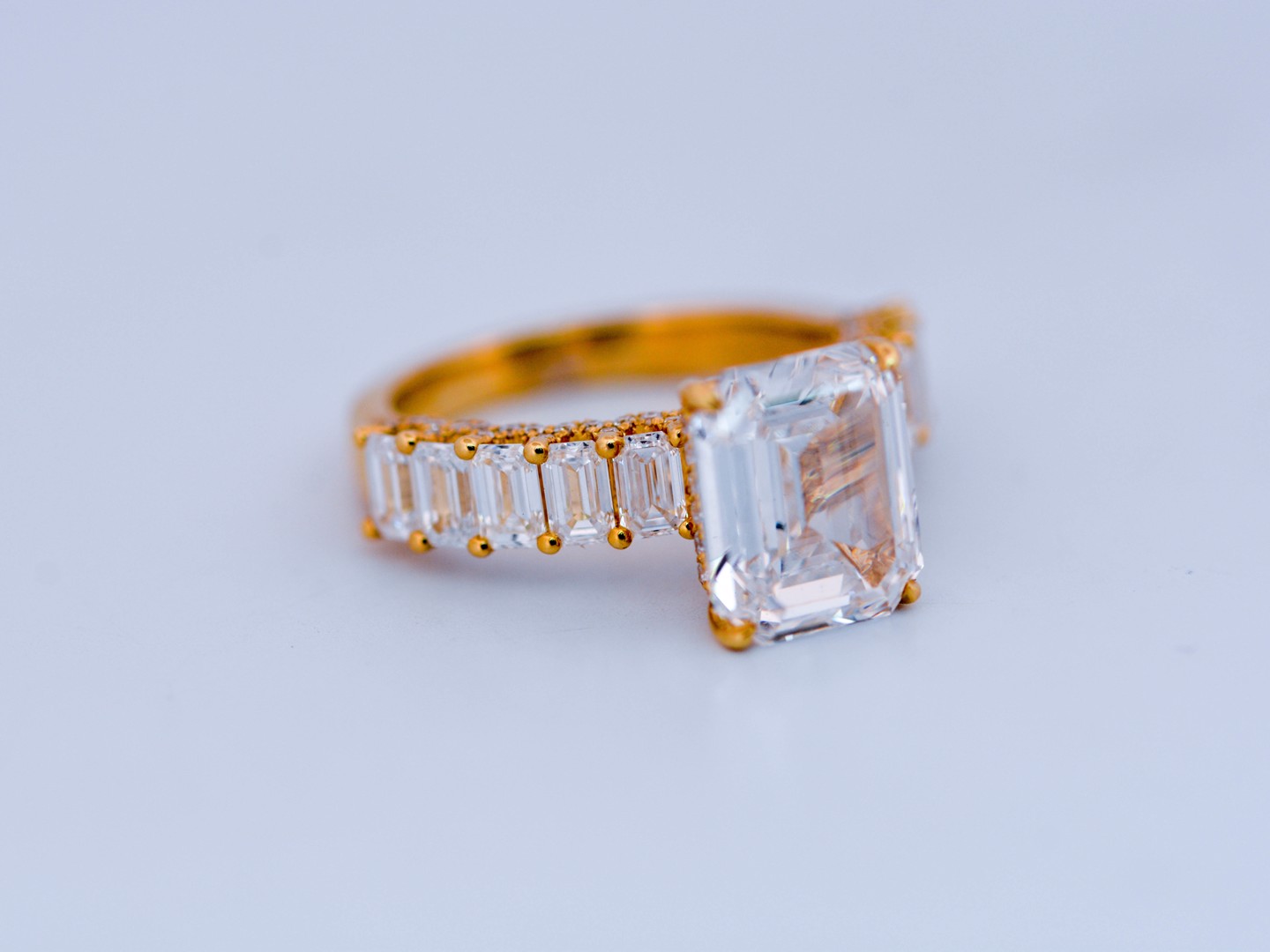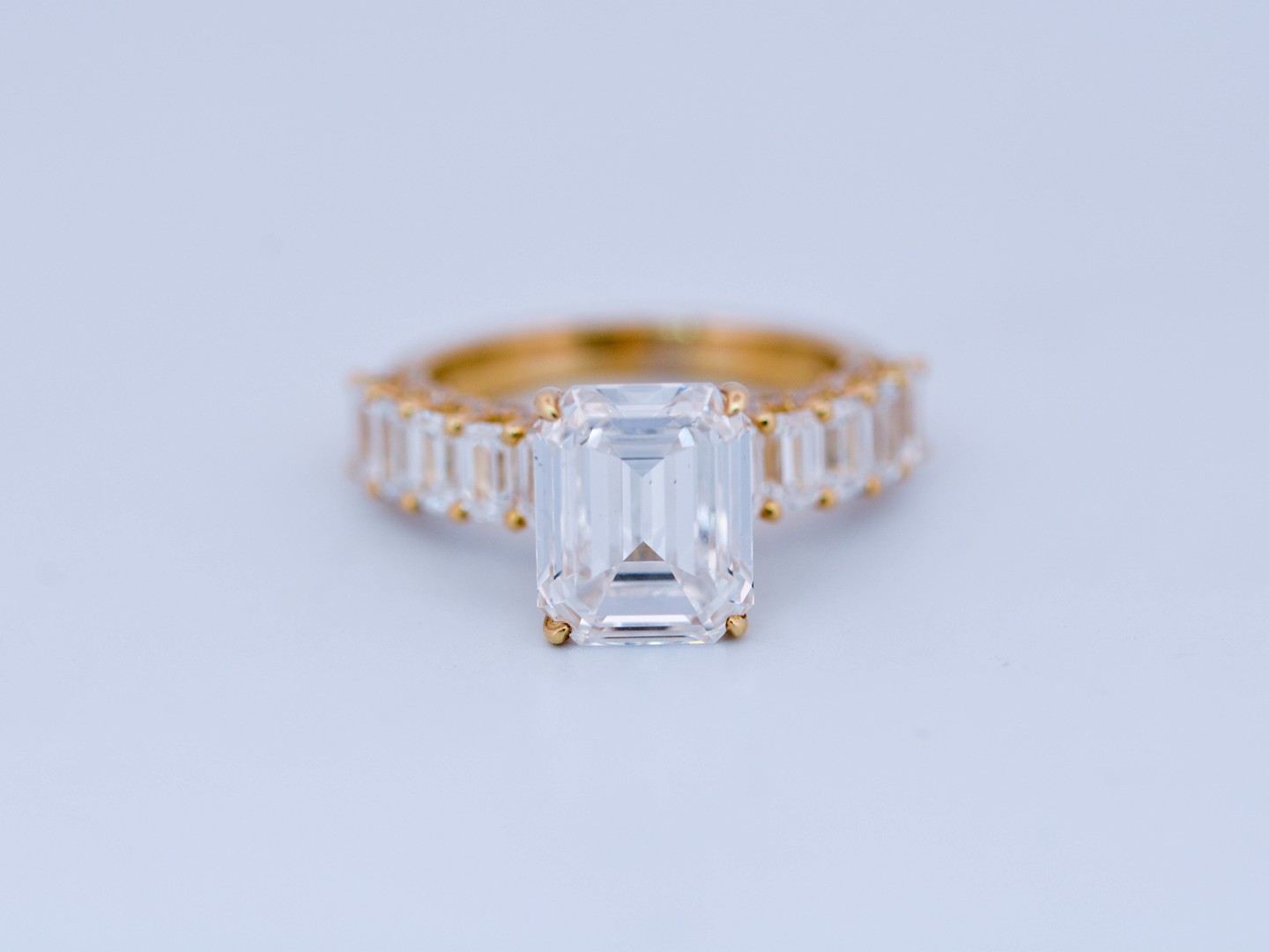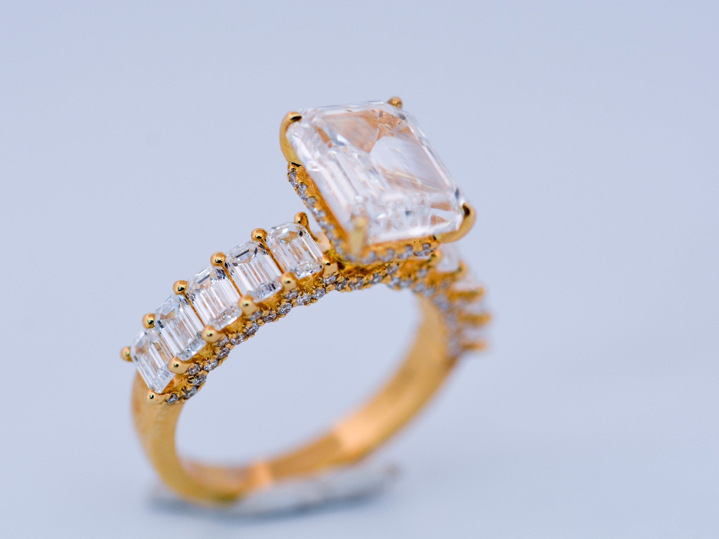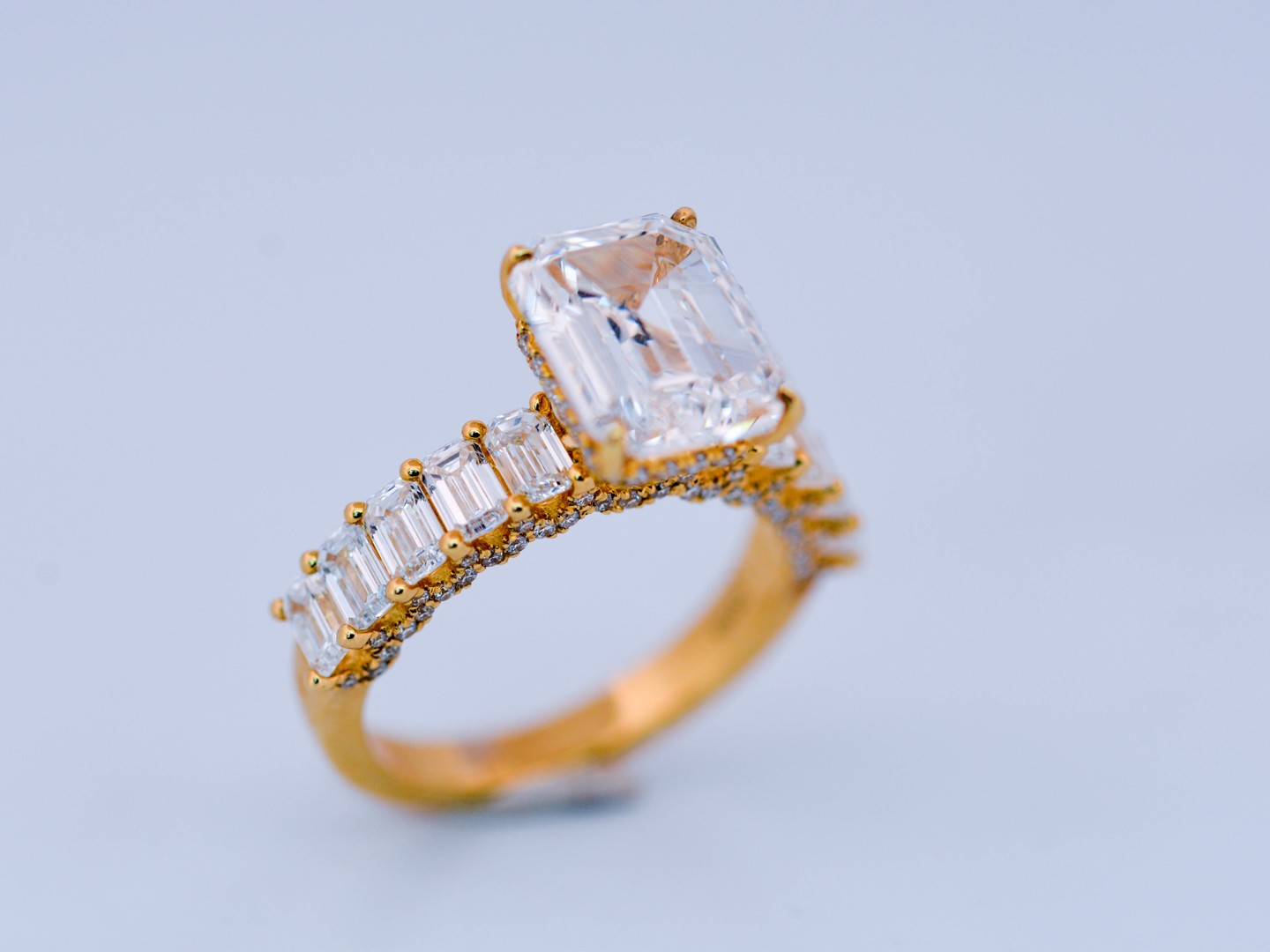 Bague exclusive avec 1 diamant taillé en émeraude de +-4.00CT, couleur : F-G et pureté : VS. Entourée de diamants taillés en émeraude + brillant, total : 2.00CT, couleur : D-F-G et pureté : VS. Montée en or jaune 14kt (marqué 585). Taille de bague : 51-53