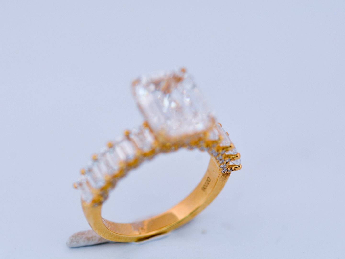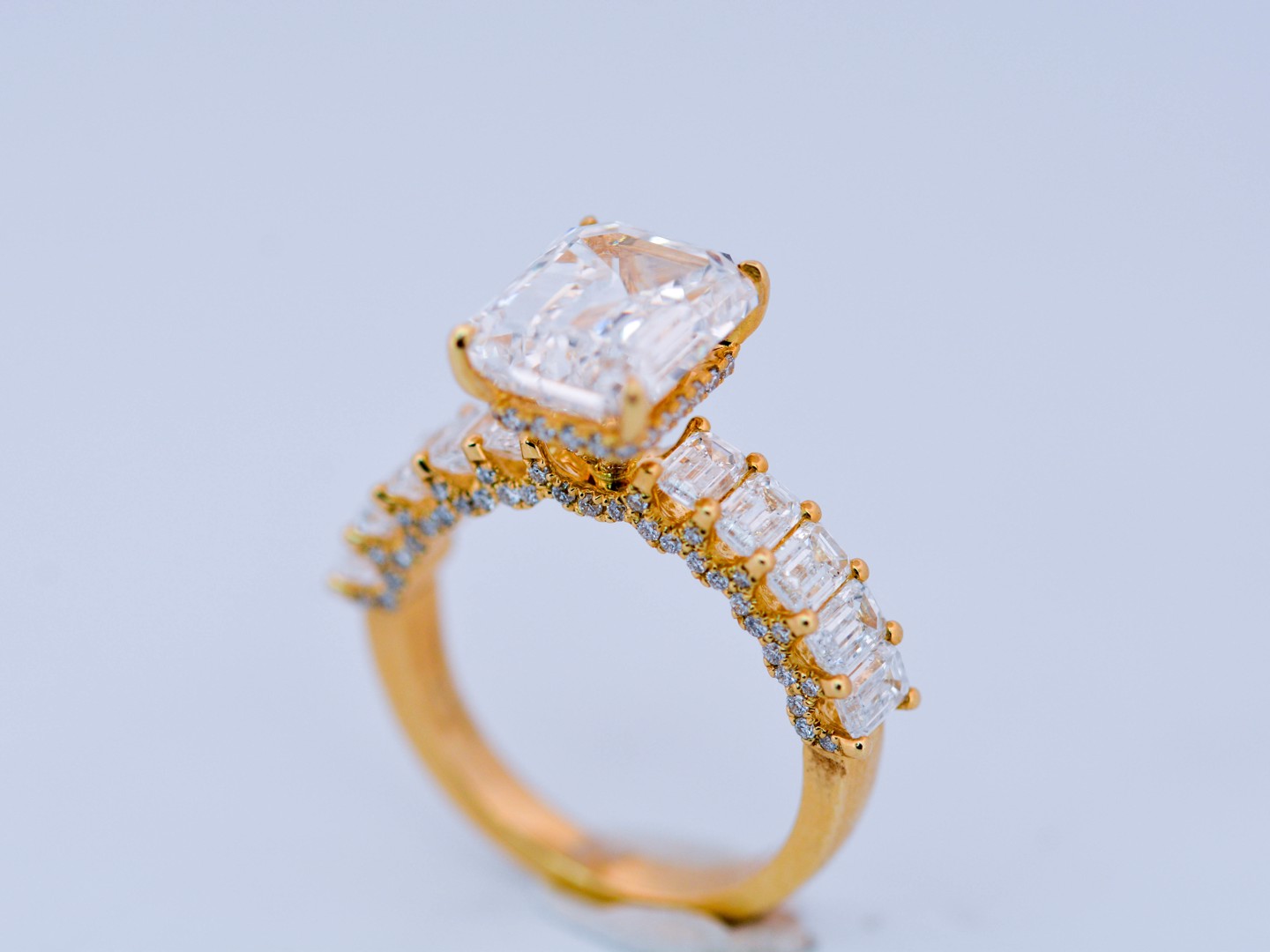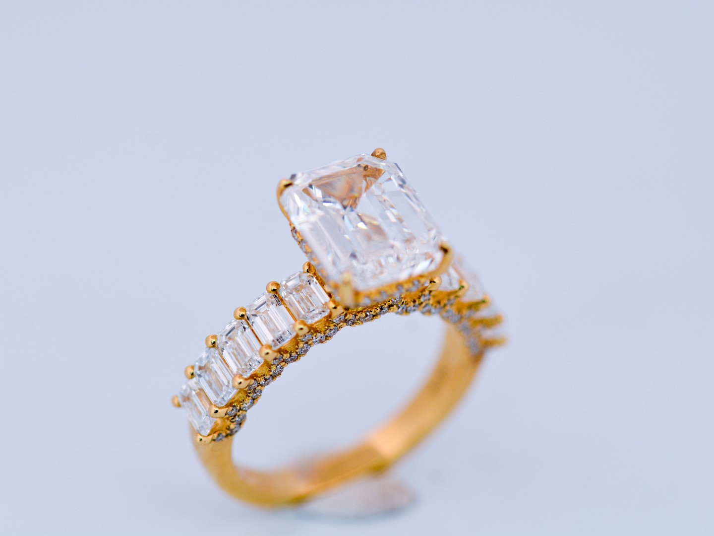 Bague exclusive avec 1 diamant taillé en émeraude de +-4.00CT, couleur : F-G et pureté : VS. Entourée de diamants taillés en émeraude + brillant, total : 2.00CT, couleur : D-F-G et pureté : VS. Montée en or jaune 14kt (marqué 585). Taille de bague : 51-53